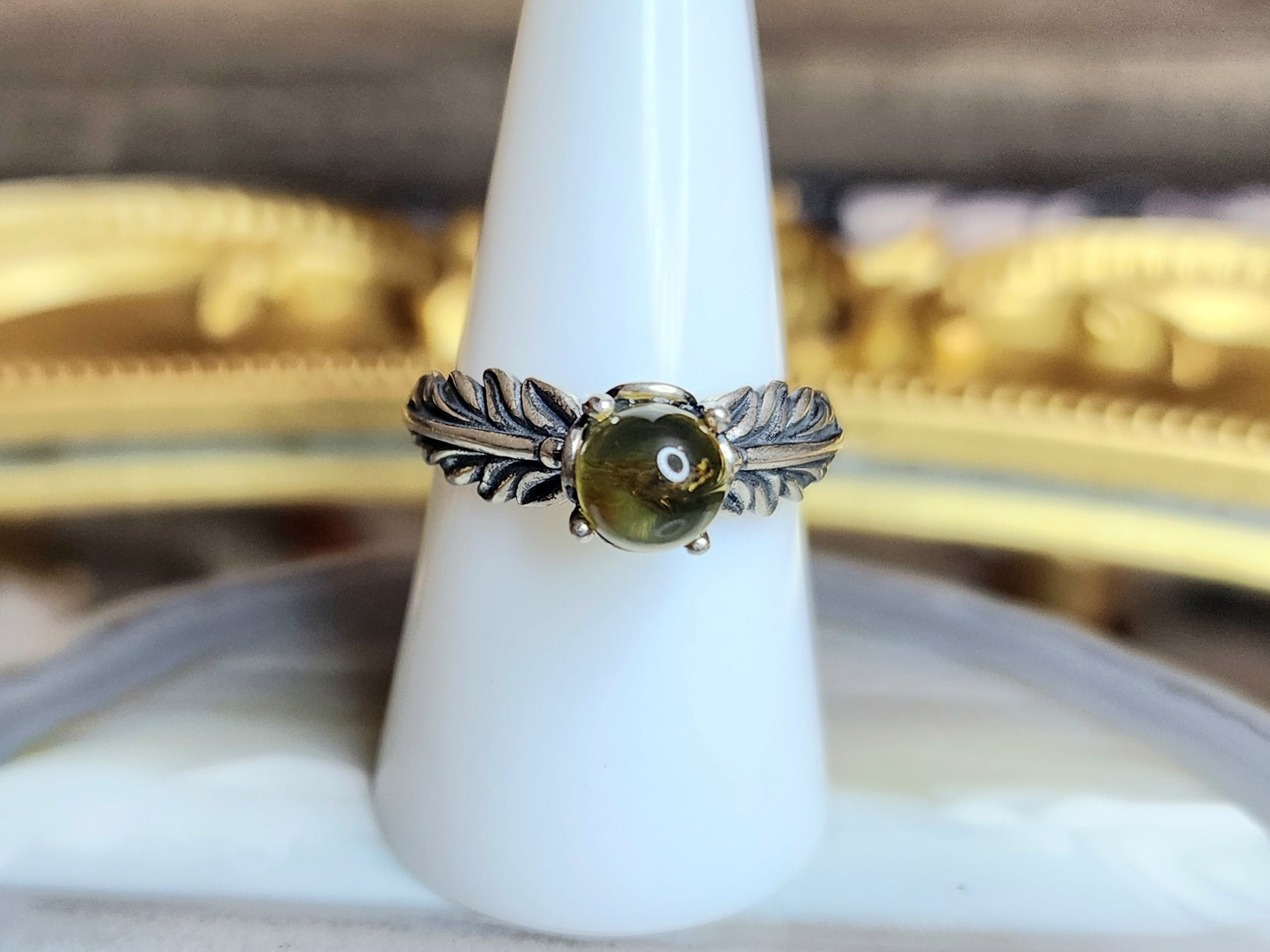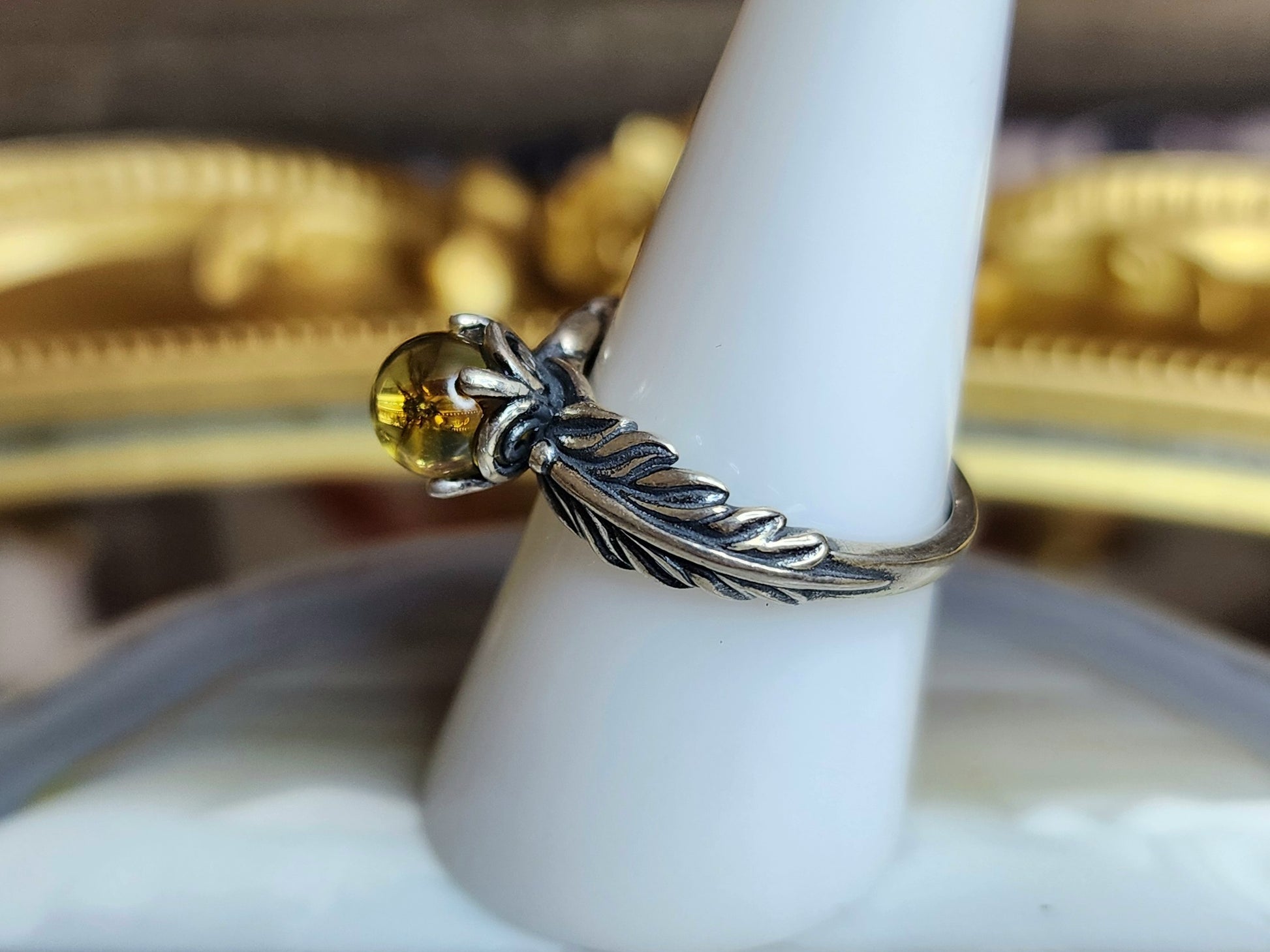 The amber has been set into an adjustable sterling silver ring with a feather design on the band.