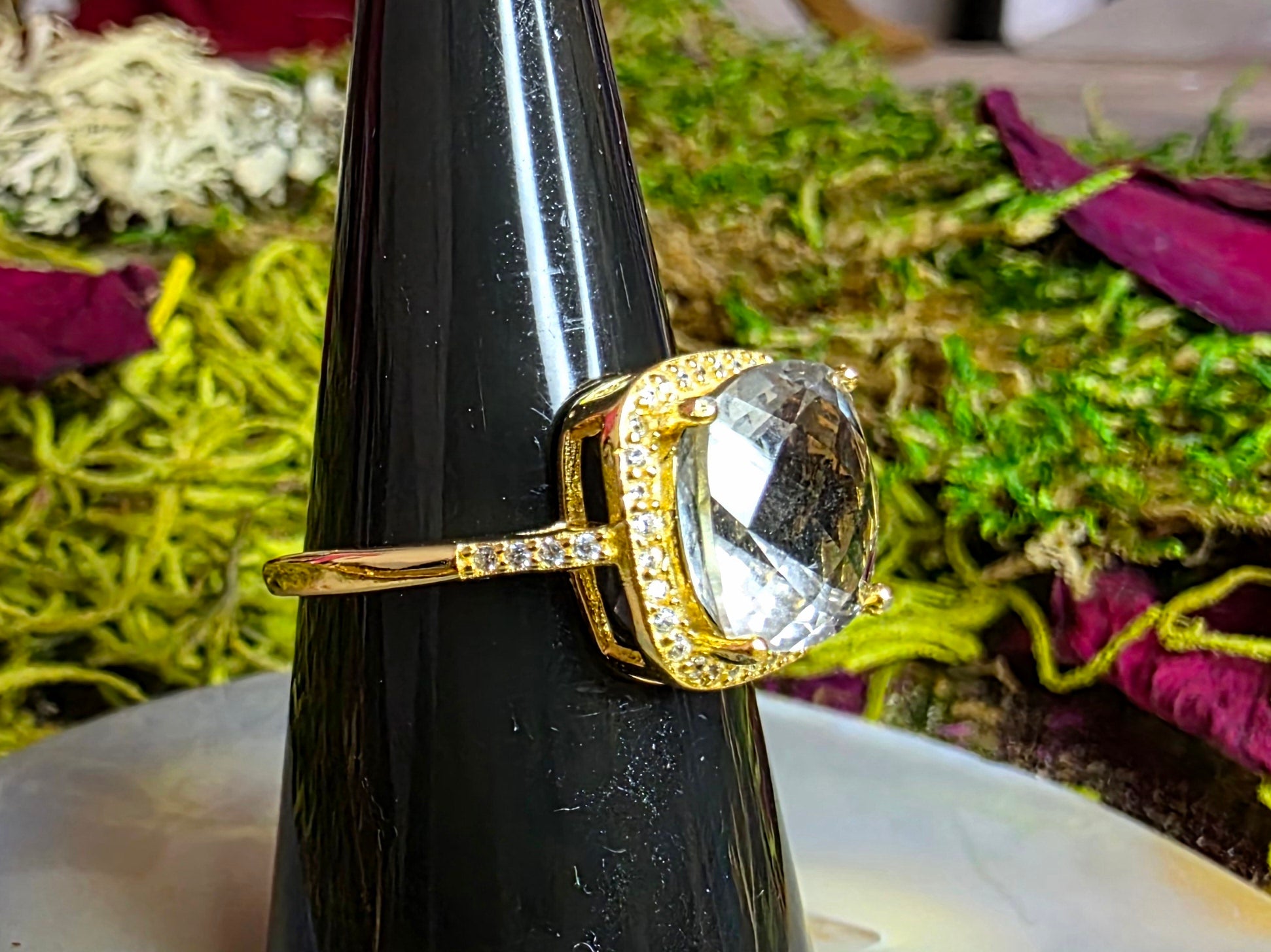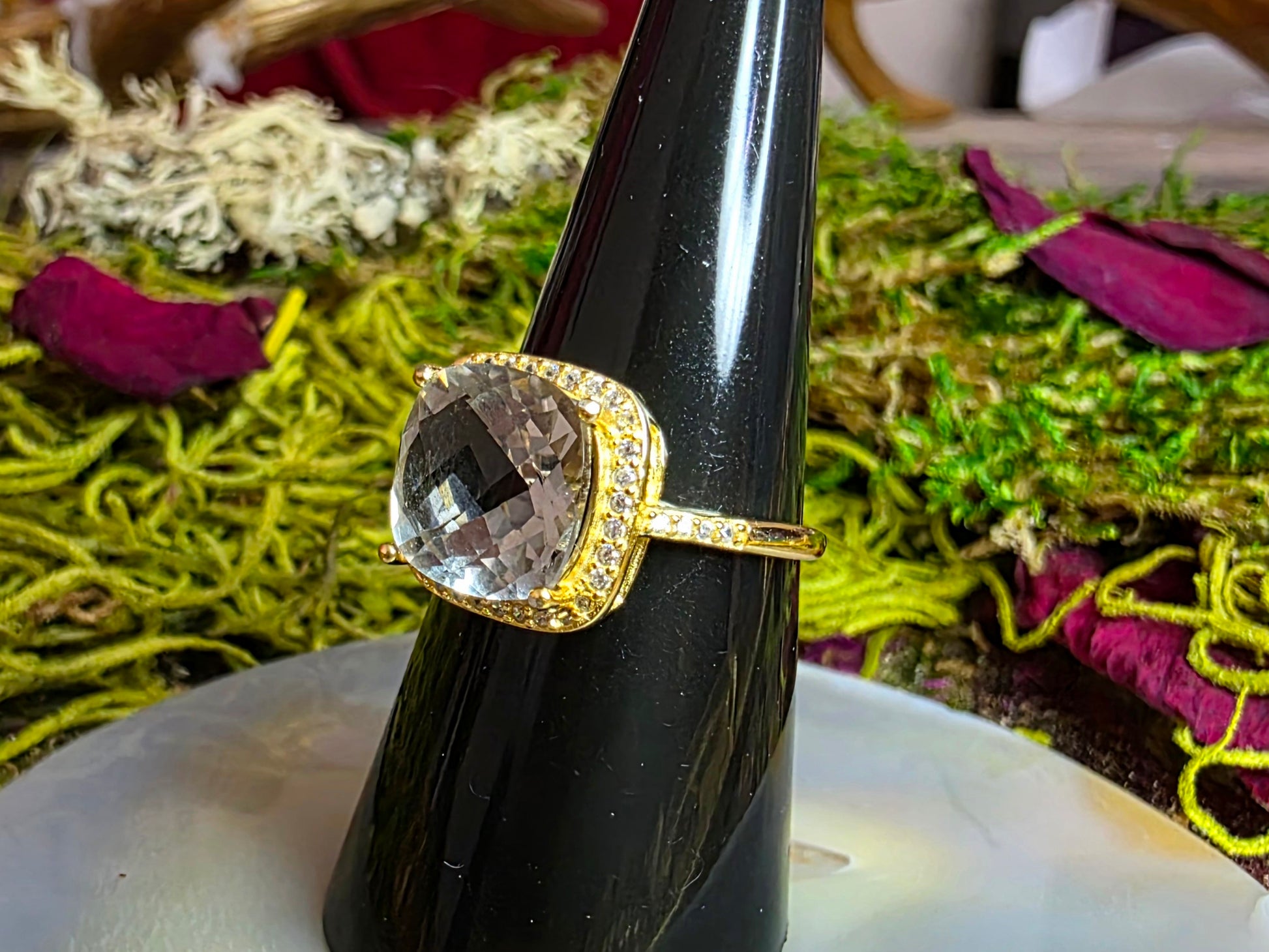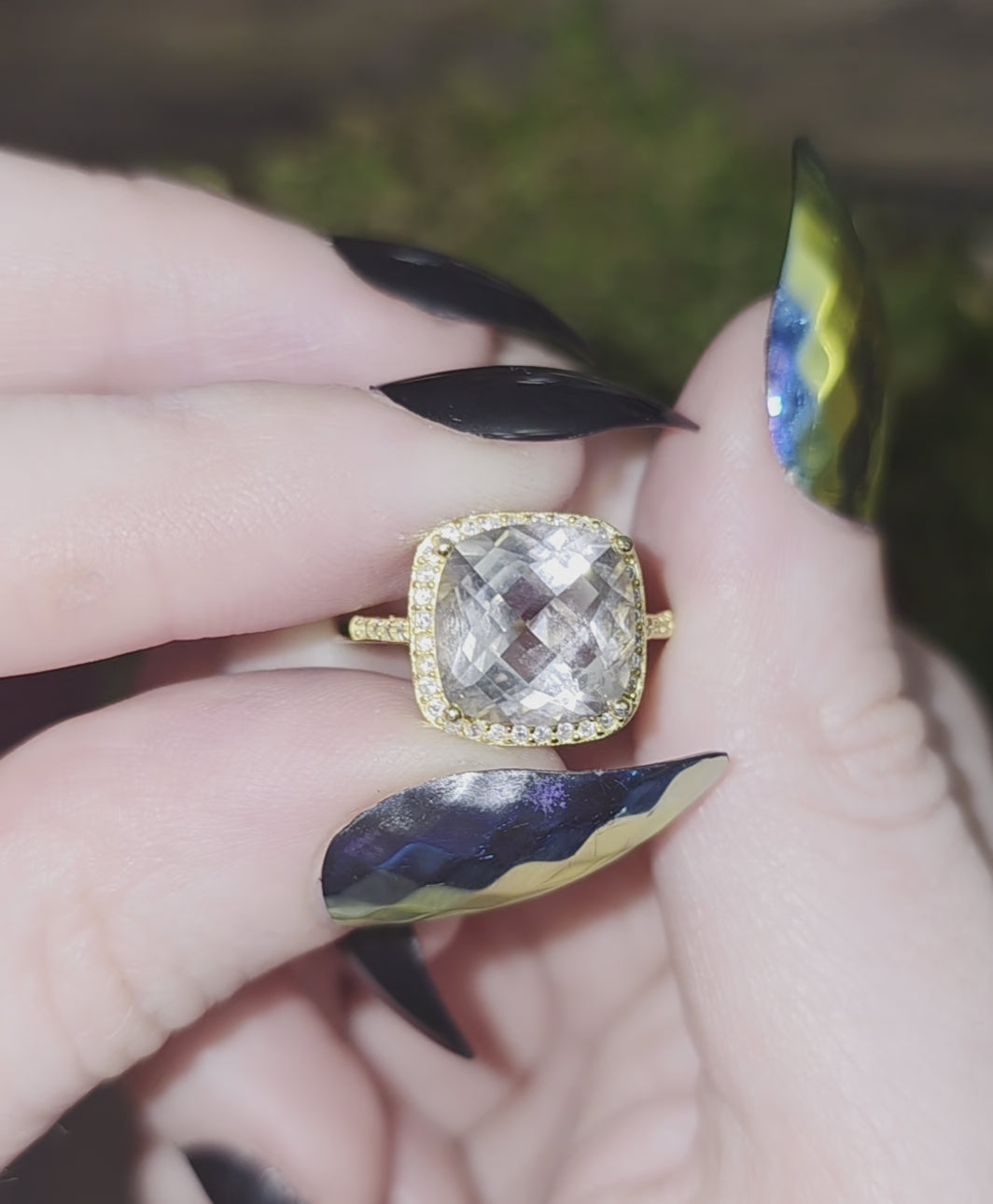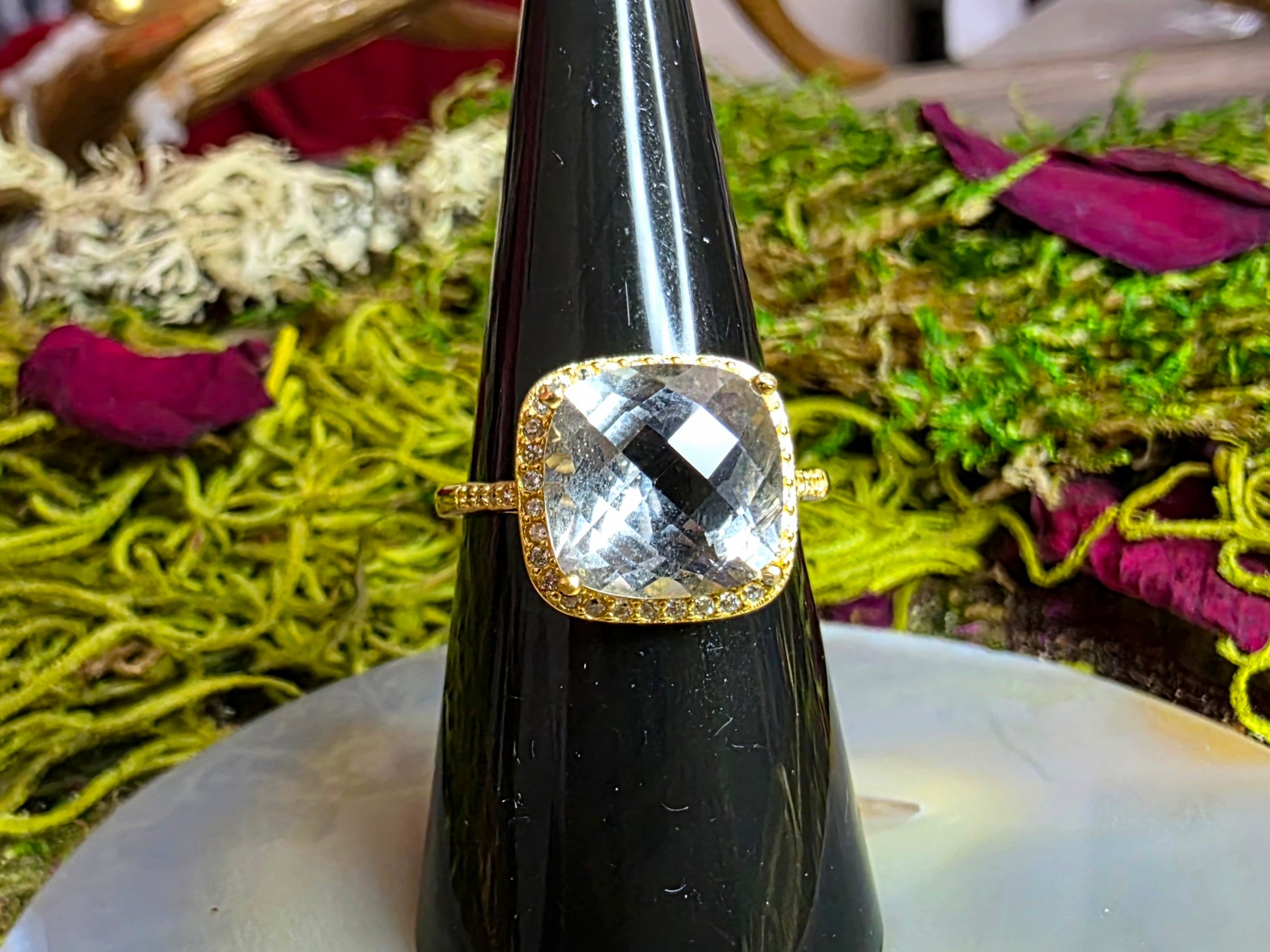 This ring features clear quartz that has been faceted and given a cushion cut that captures the lightly beautifully! The stone is set into an adjustable sterling silver ring with gold plating and zircon accents.
