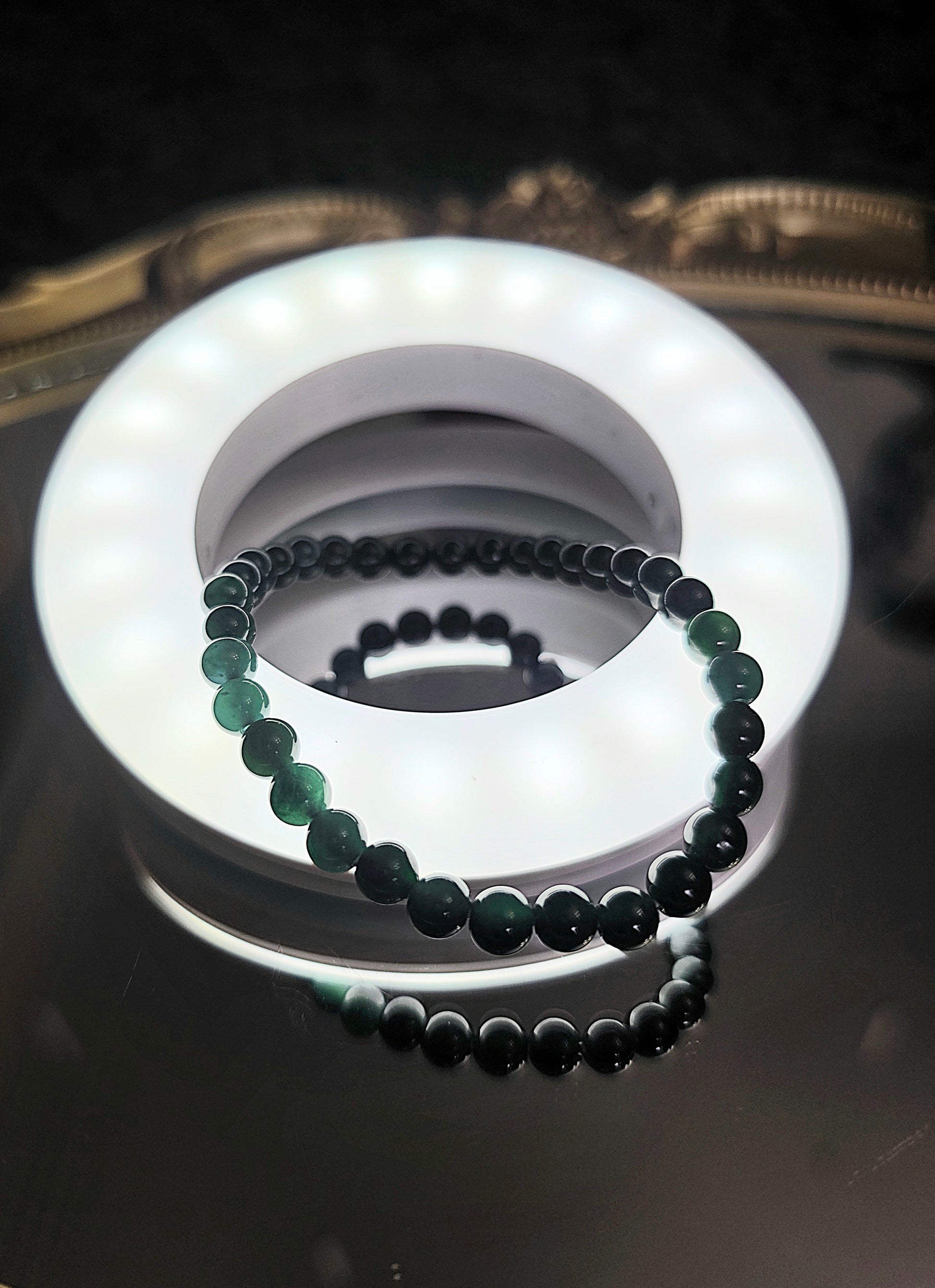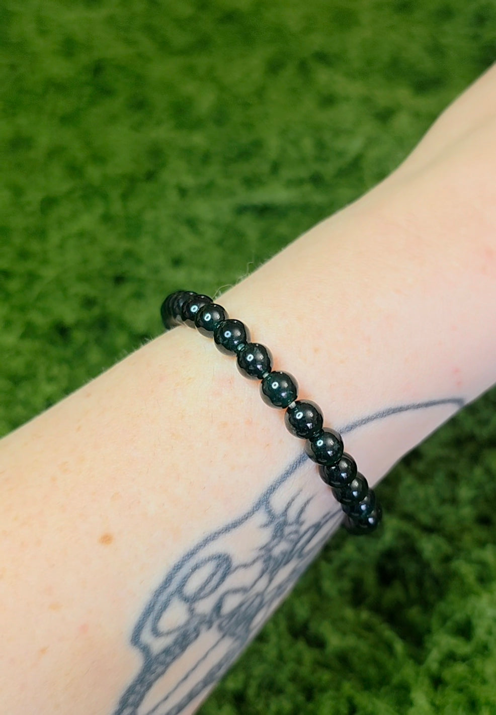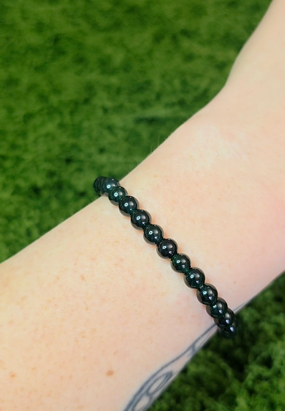 This stretch bracelet features 5.5mm deep blueish green jadeite beads set on an elastic cord.