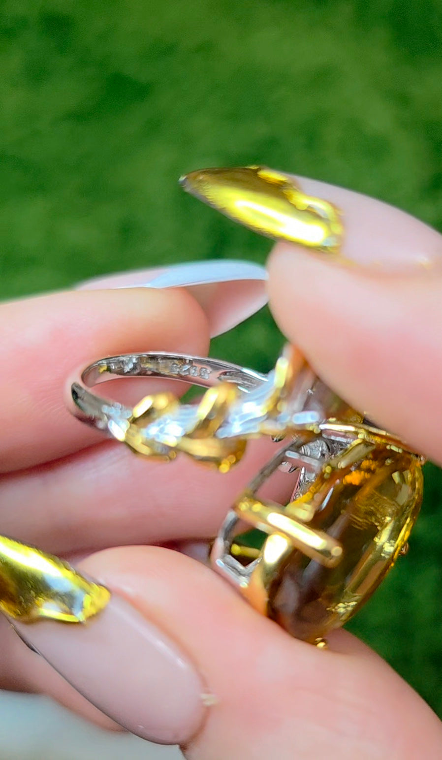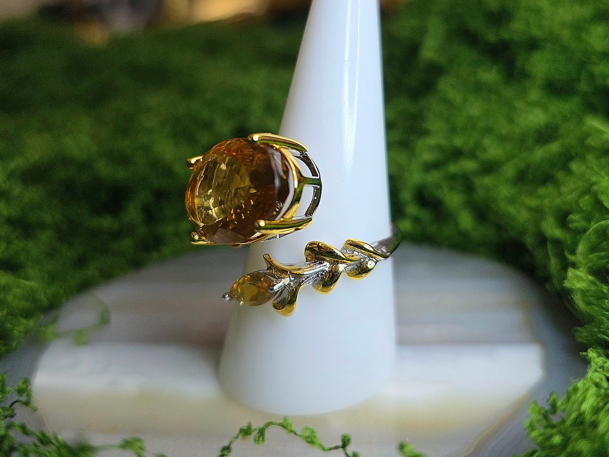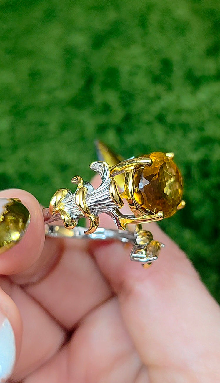 This large adjustable sterling silver and gold plated ring features two citrine (heat treated quartz) crystals. The oval cut is 18x13mm abd the marquis is 9x4mm. They are set in an ornate setting with a floral design.