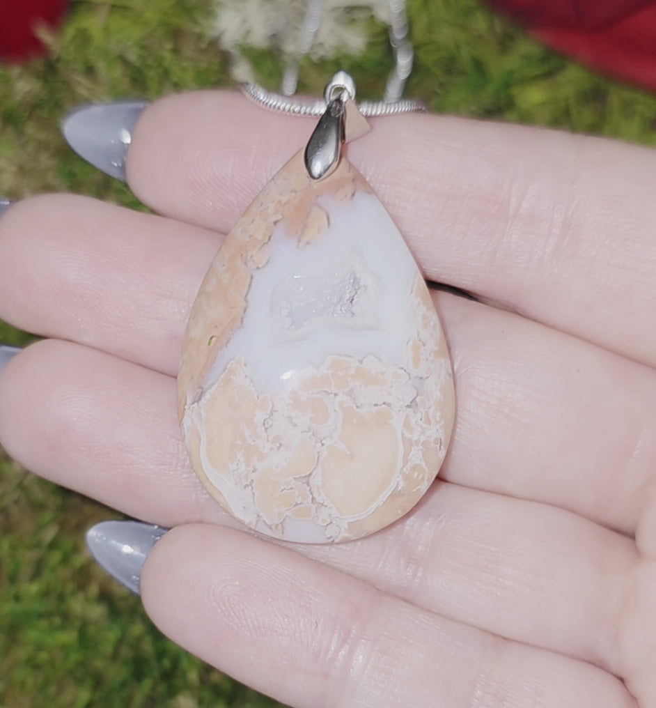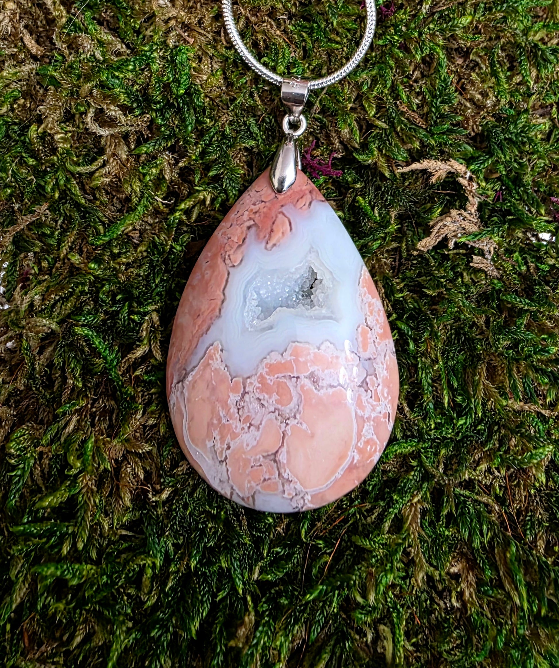 This piece features a druzy pockets and beautiful Pink and white banding. The pendant is about 1.5 inches long, has a sterling silver pendant bail, and comes with an 18 inch silver plated steel chain.