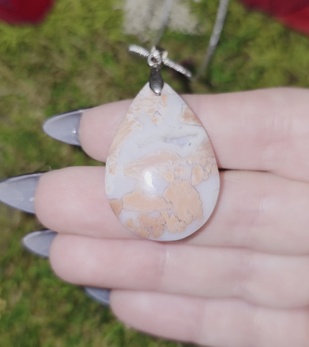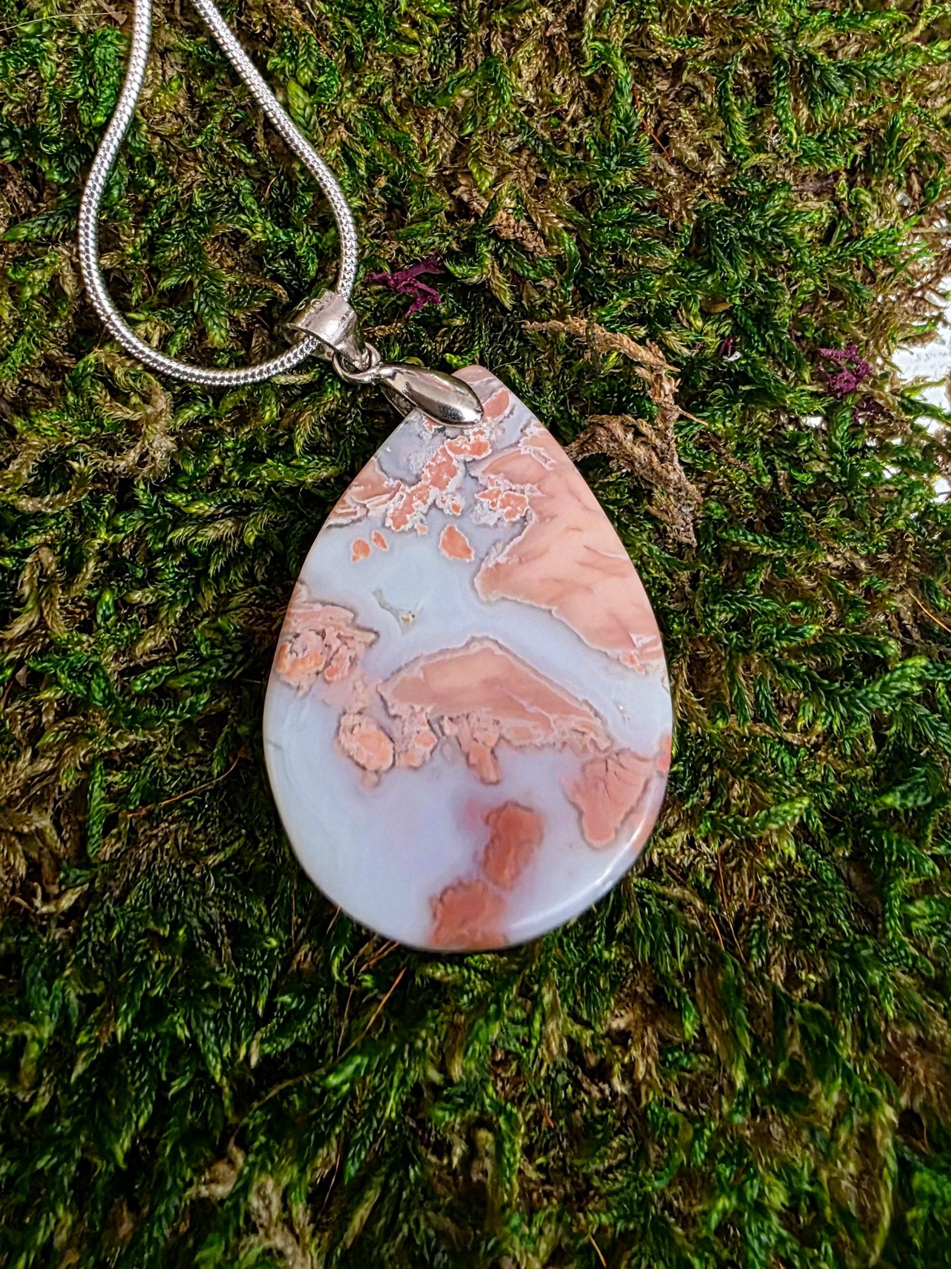 This piece features a druzy pockets and beautiful Pink and white banding. The pendant is about 1.5 inches long, has a sterling silver pendant bail, and comes with an 18 inch silver plated steel chain.