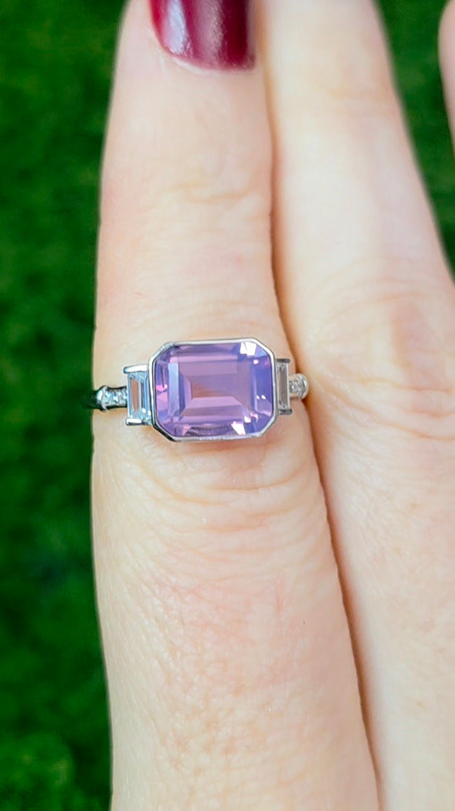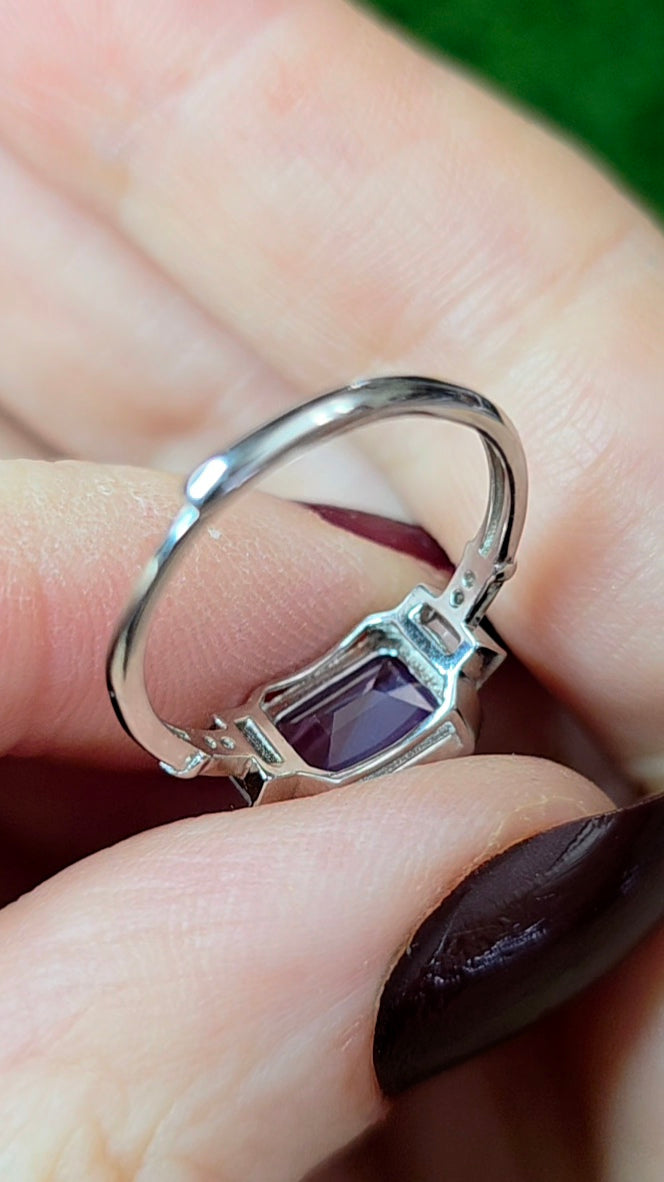 7.5 x 10 mm faceted, emerald cut, natural, lavender moon quartz set into an adjustable sterling silver ring with zircon accents.