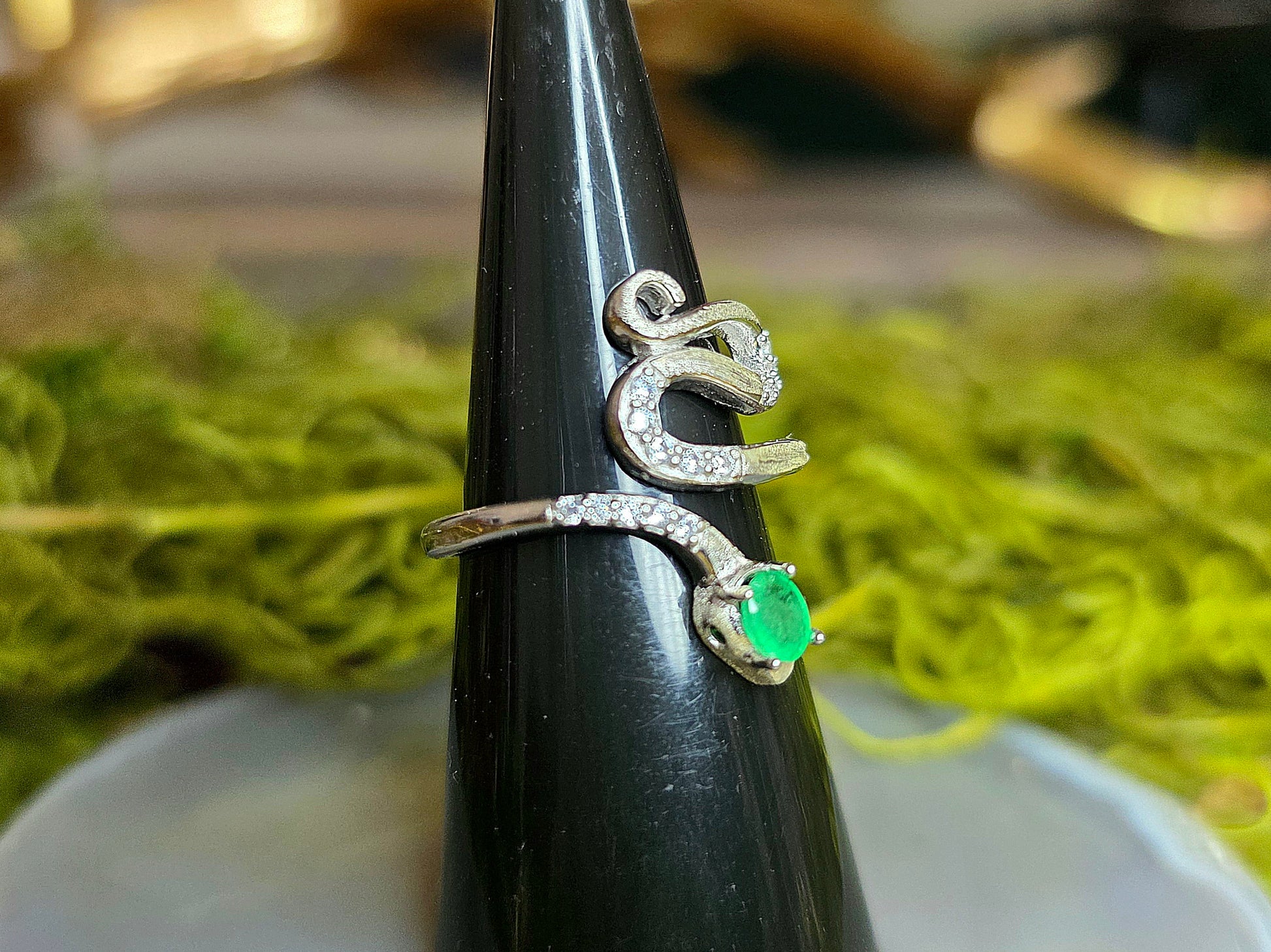 5x3mm natural emerald set into an adjustable sterling silver snake ring with diopside eyes and zircon accents. This ring is adjustable and will best fit sizes 5 - 8