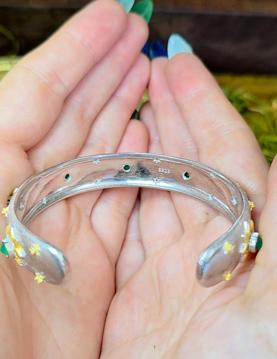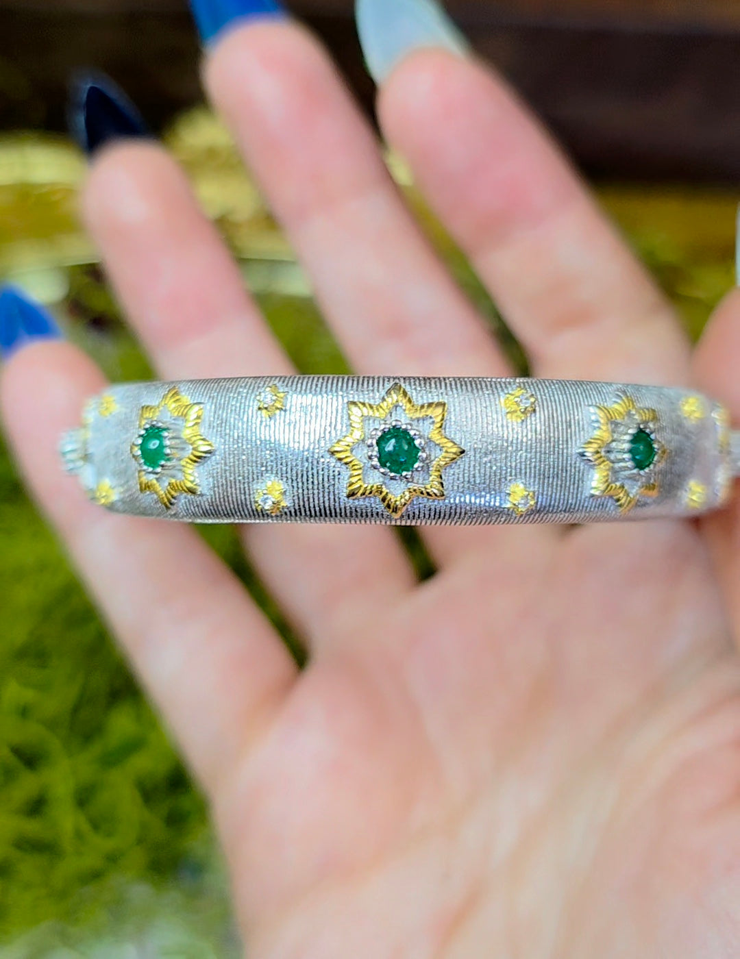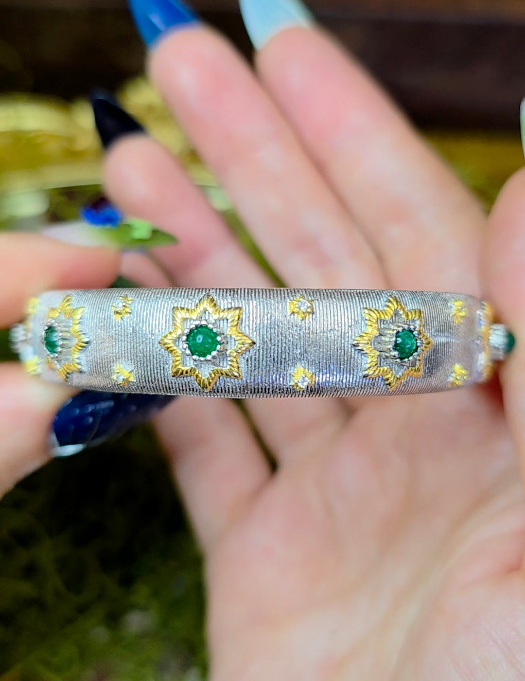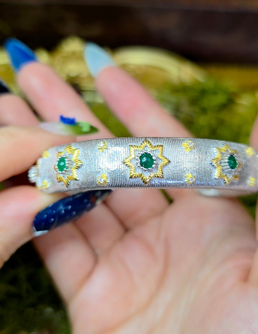This sterling silver bangle is adjustable and will best fit smaller to medium size wrists (up to 8 inches). It features seven 3mm emerald stones and a gold plated star design.