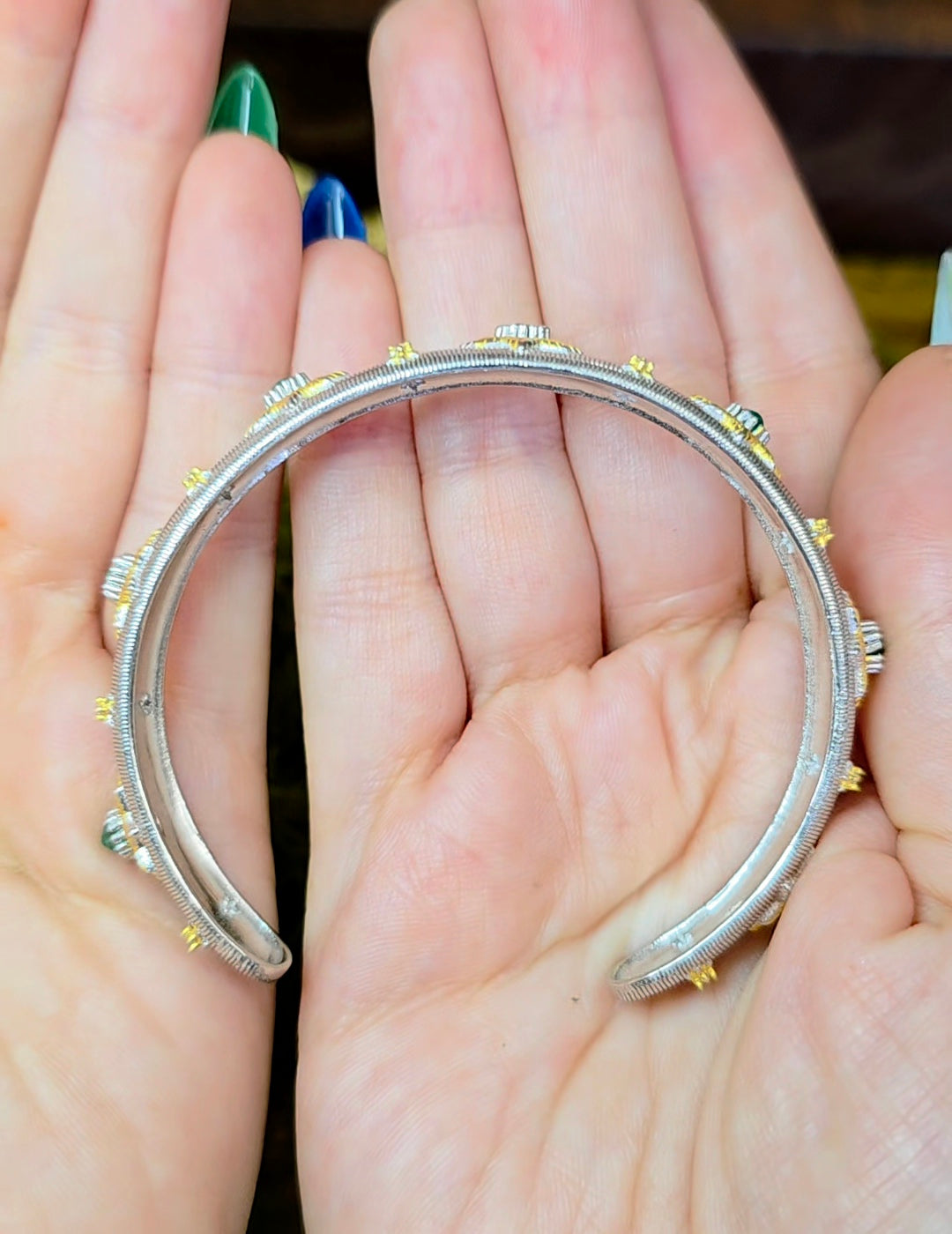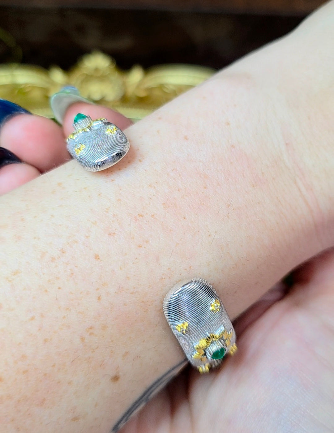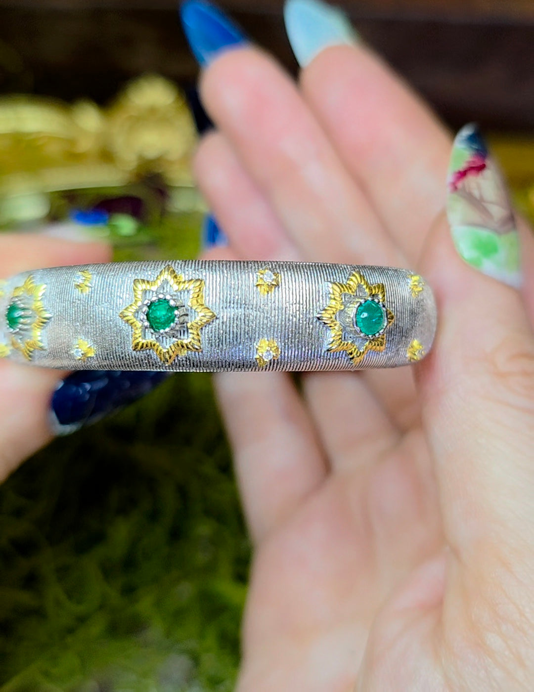 This sterling silver bangle is adjustable and will best fit smaller to medium size wrists (up to 8 inches). It features seven 3mm emerald stones and a gold plated star design.
