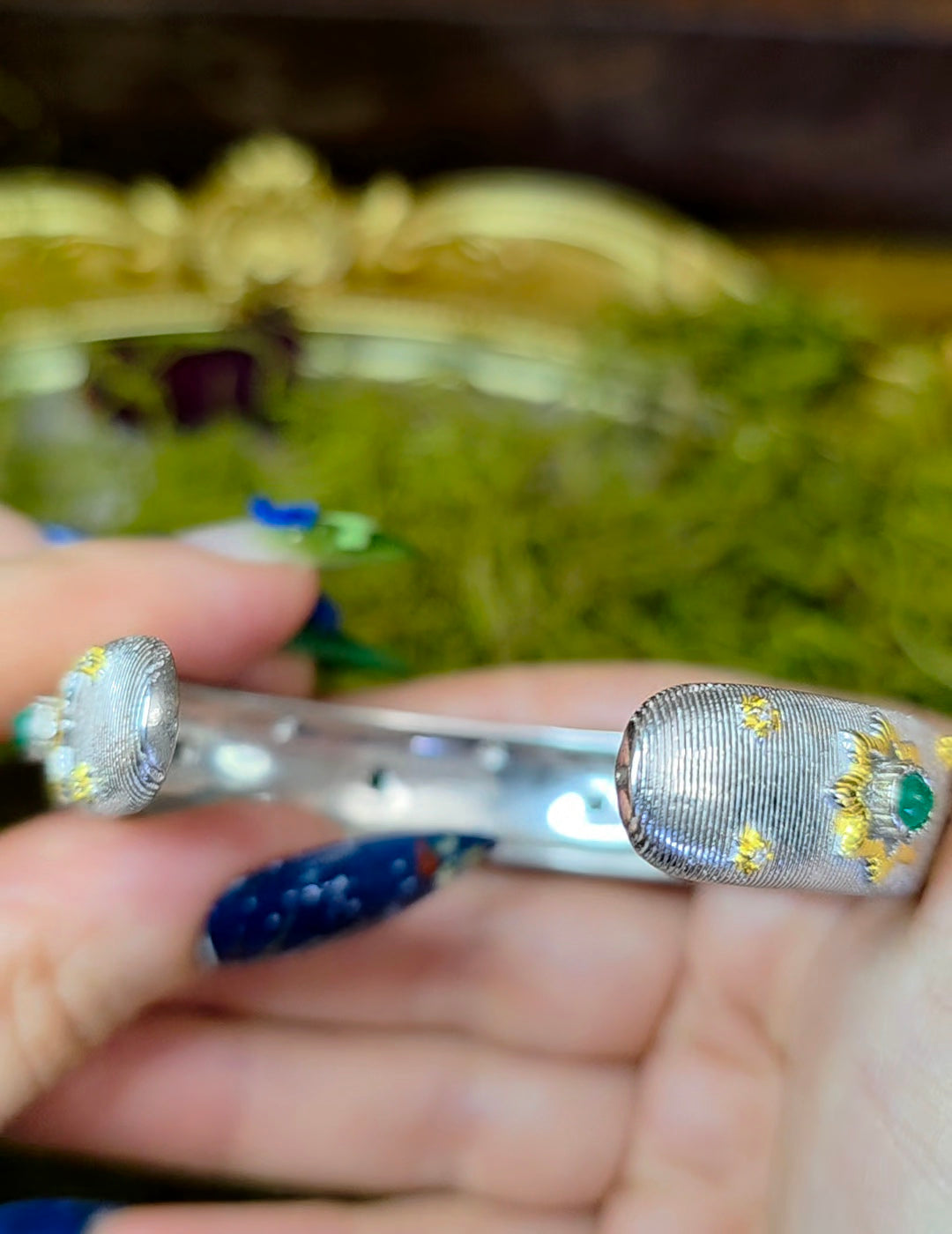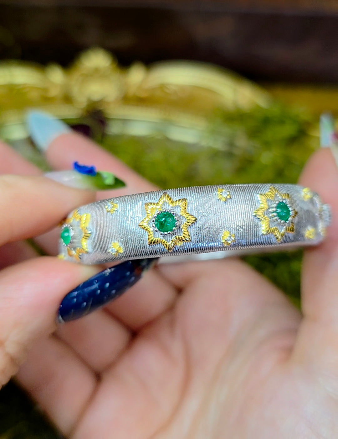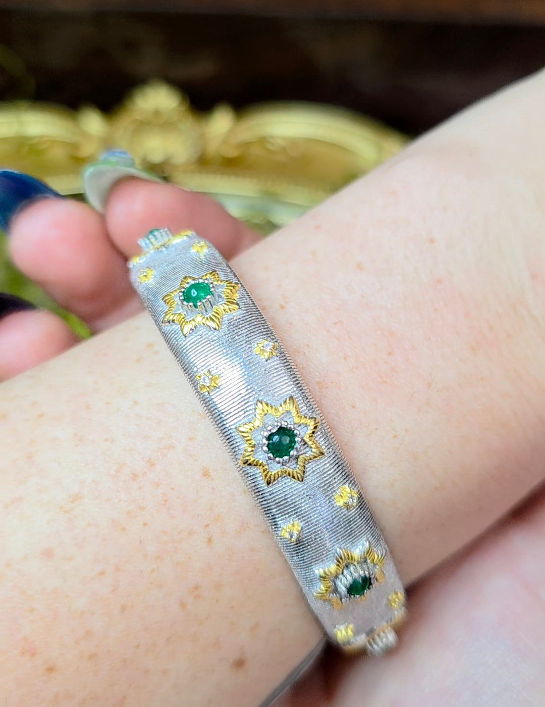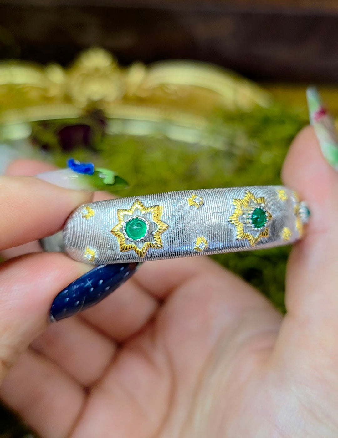 This sterling silver bangle is adjustable and will best fit smaller to medium size wrists (up to 8 inches). It features seven 3mm emerald stones and a gold plated star design.