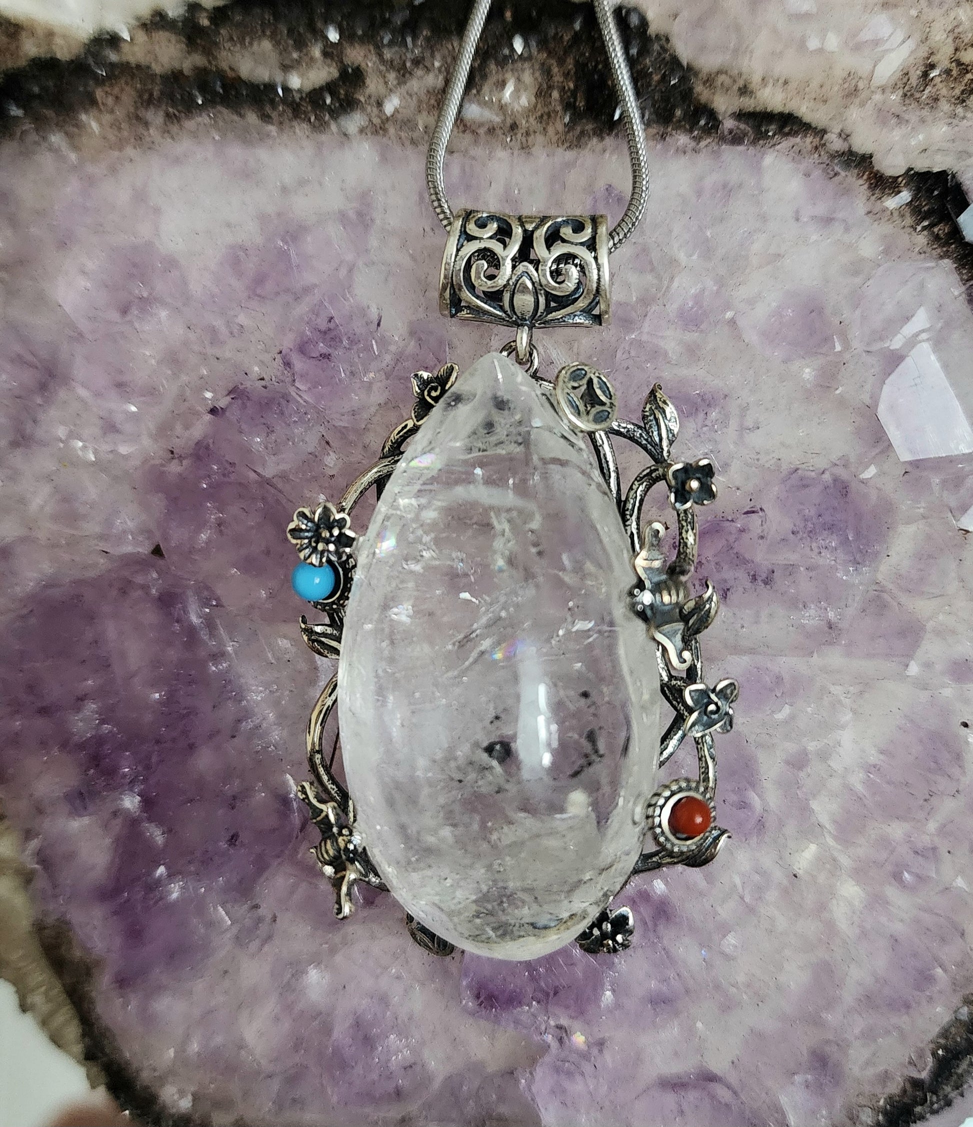 This pendant features a natural quartz crystal with water and black sand trapped inside of it and pleanty of rainbows. It is set in a sterling silver bail with flower and moth details, and carnelian turquoise accents.