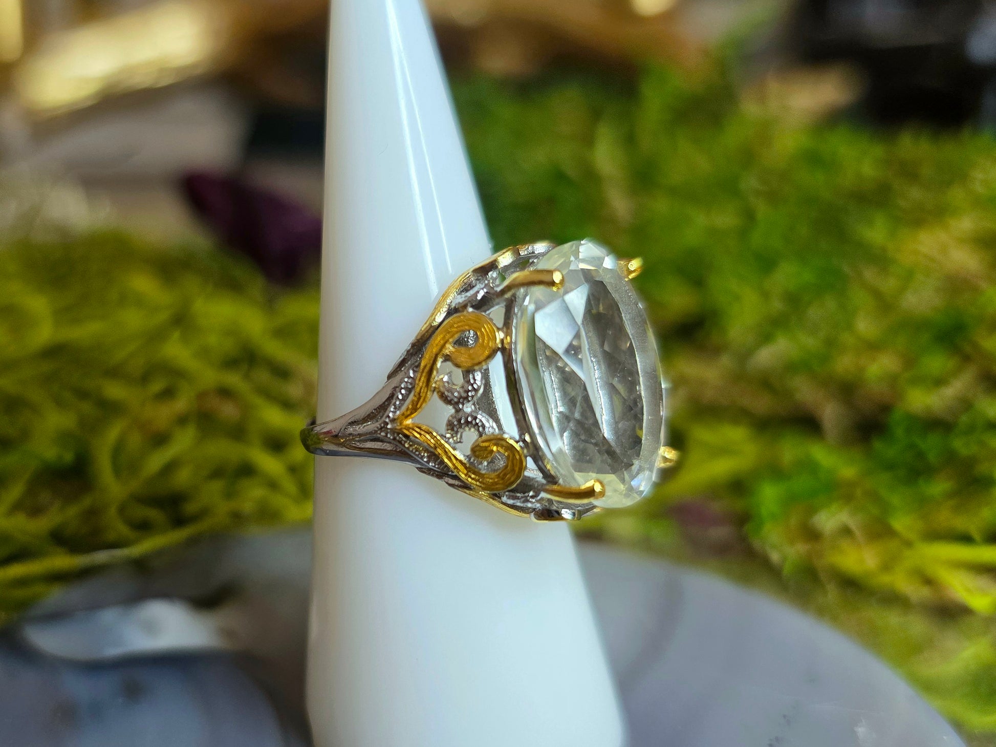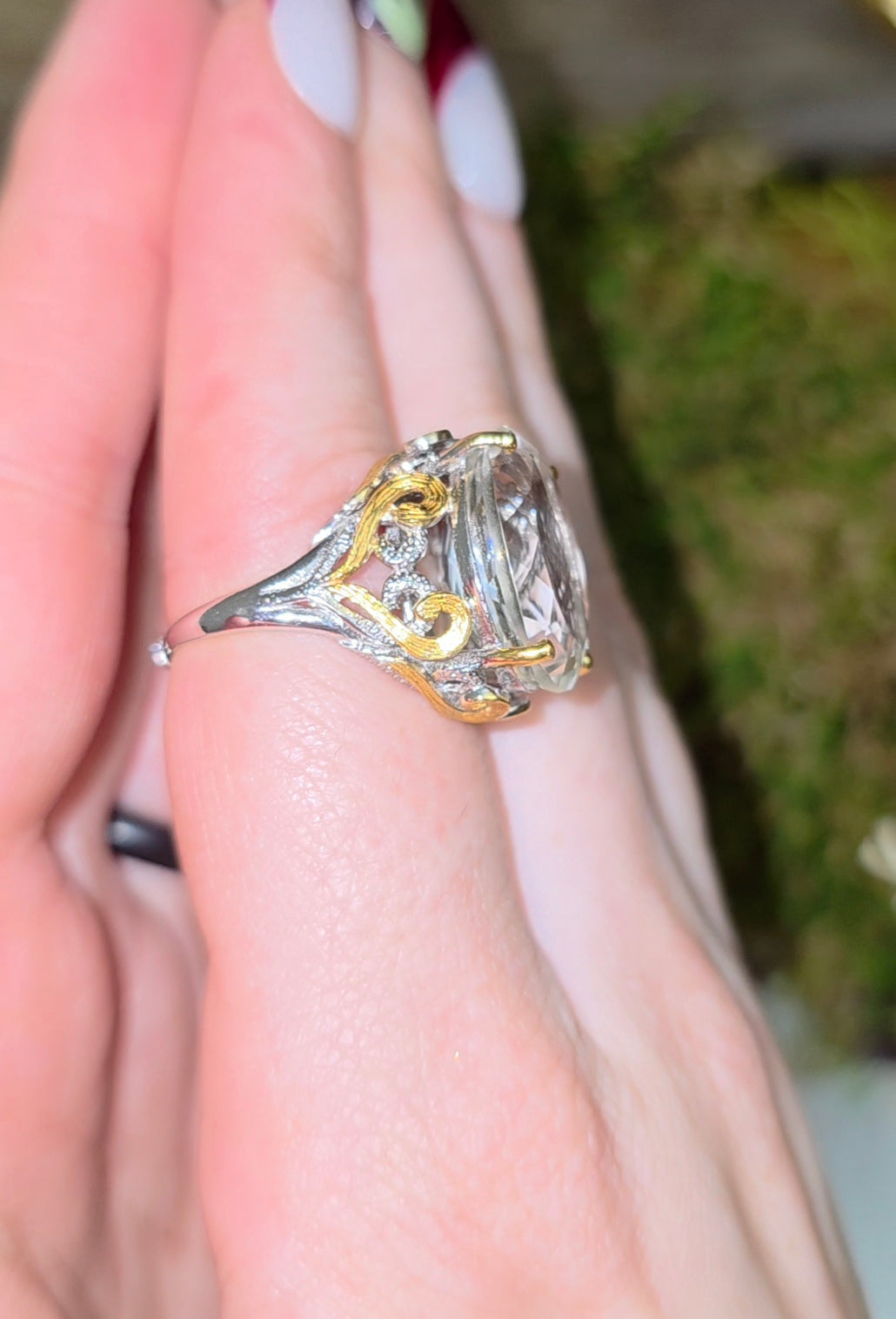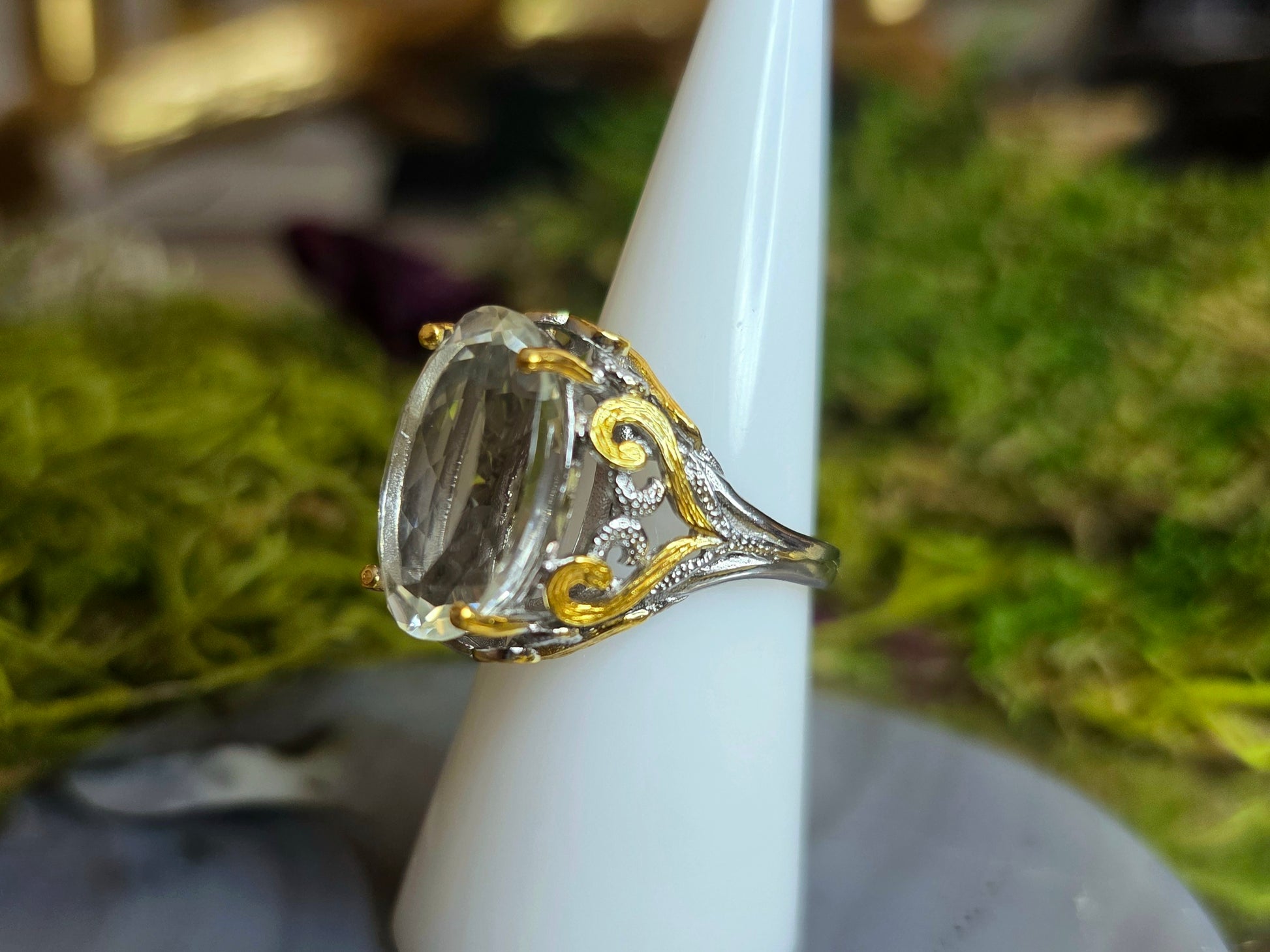 This 18 x 12.5 faceted crystal is set into an adjustable sterling silver ring with gold plated details.