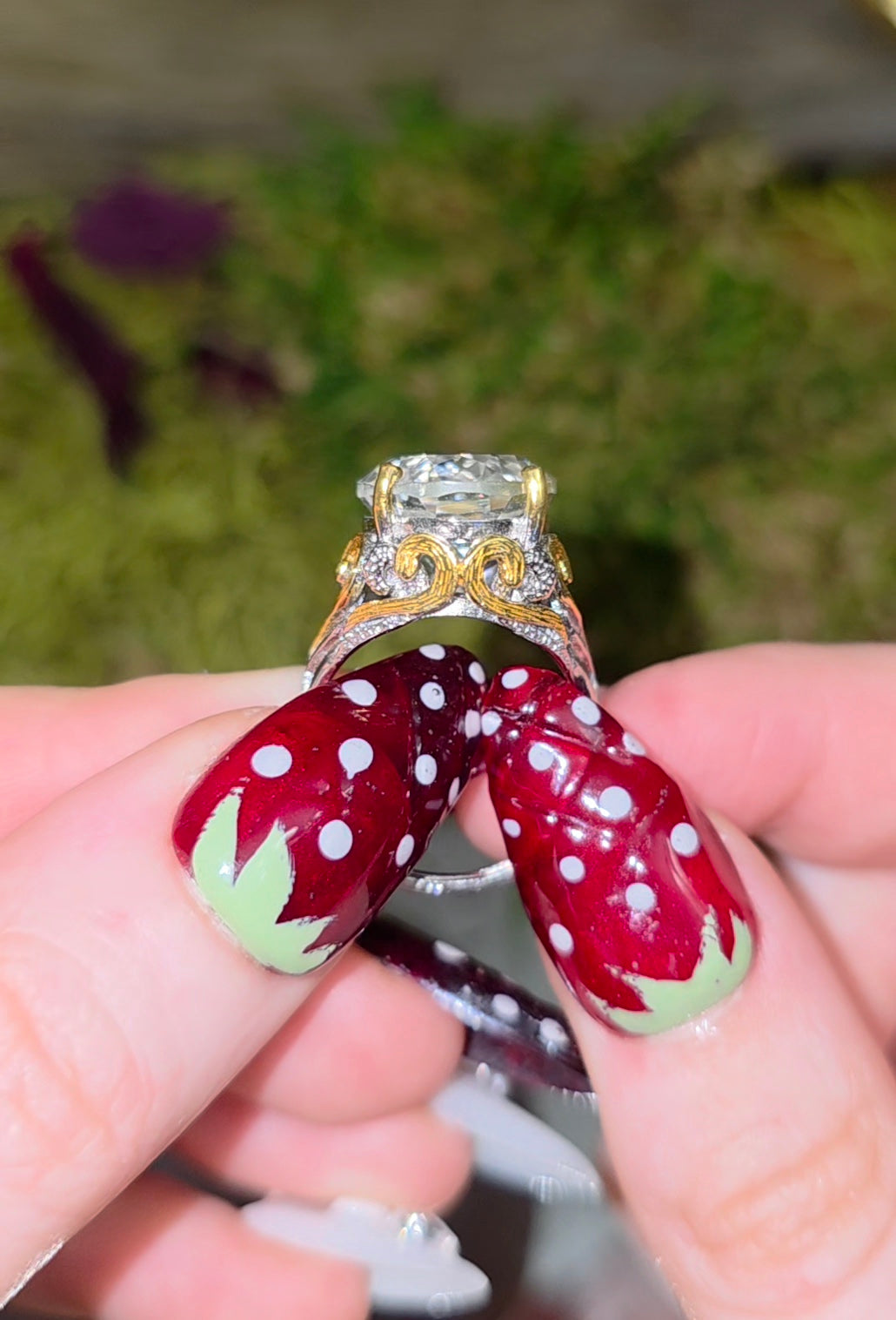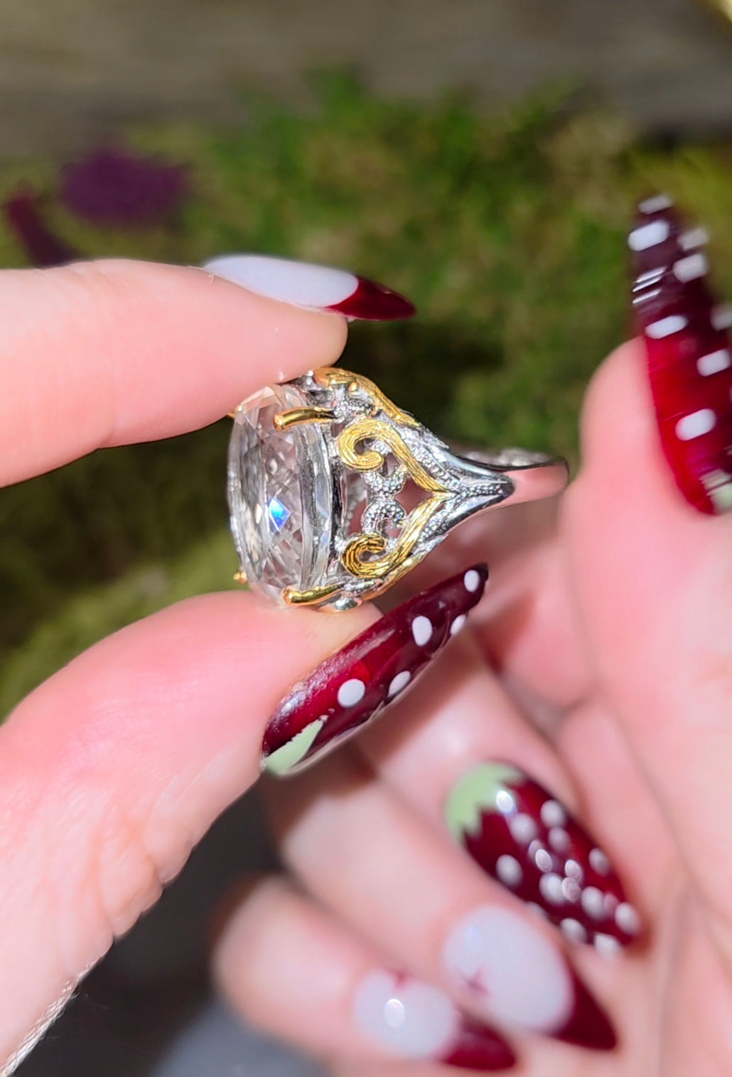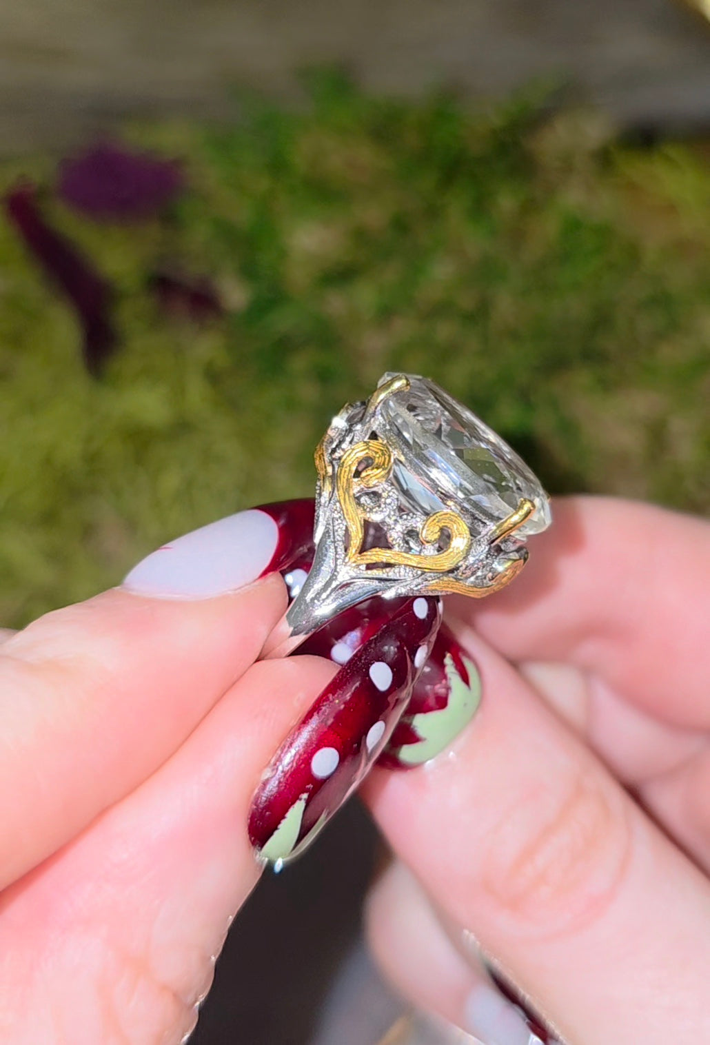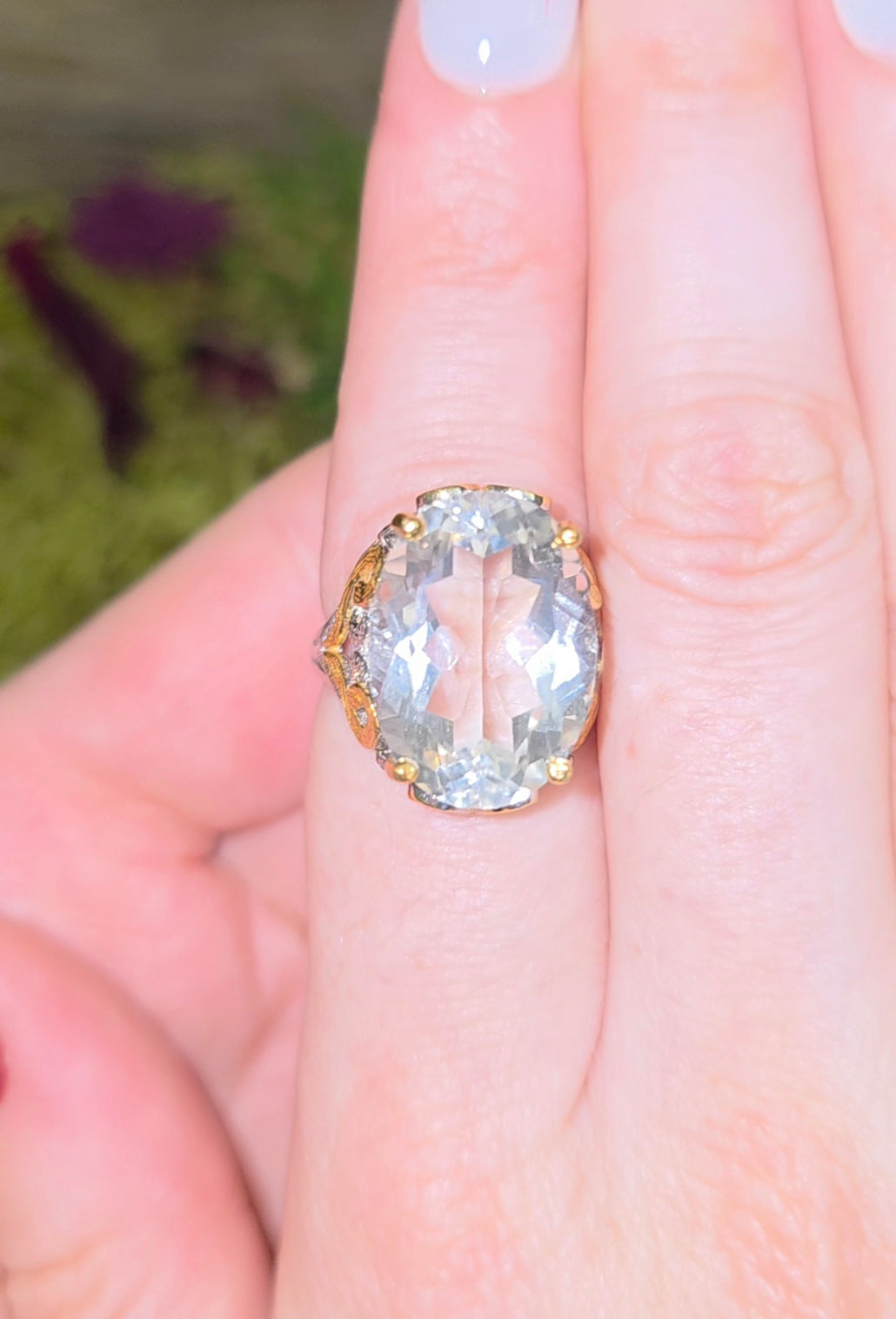 This 18 x 12.5 faceted crystal is set into an adjustable sterling silver ring with gold plated details.