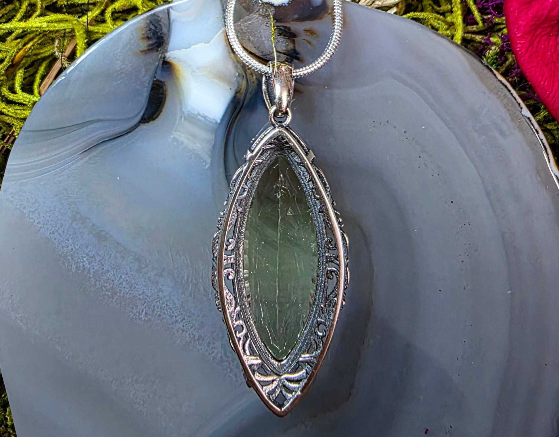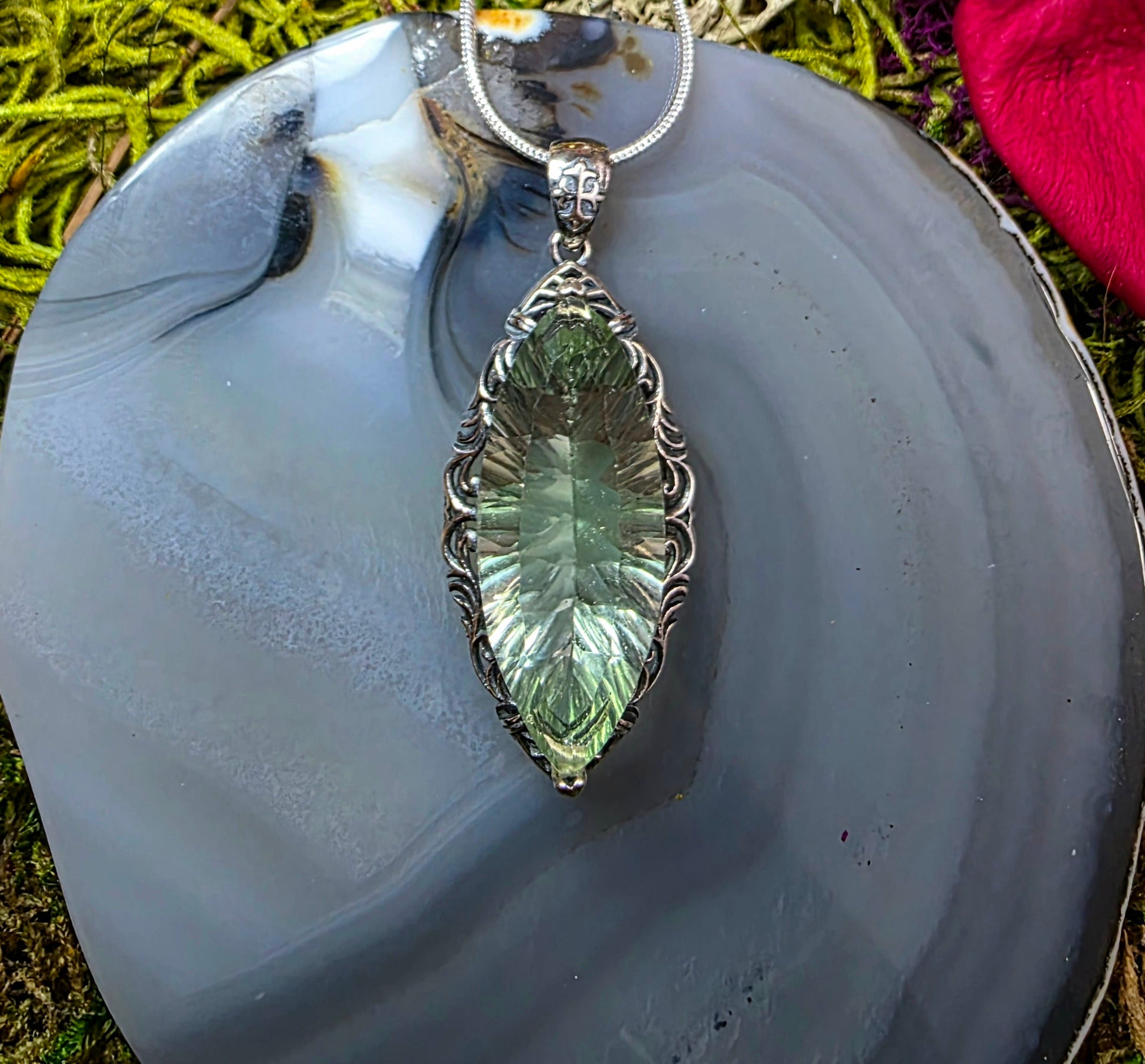 This pendant features a 29mm high quality faceted green fluorite crystal. It is set into a sterling silver bail with a vintage design.