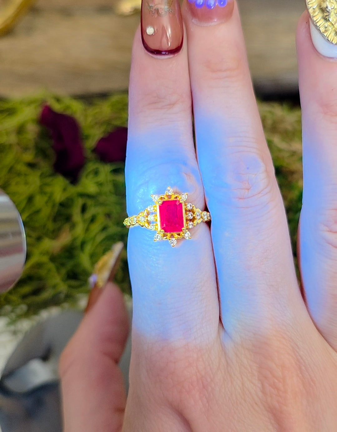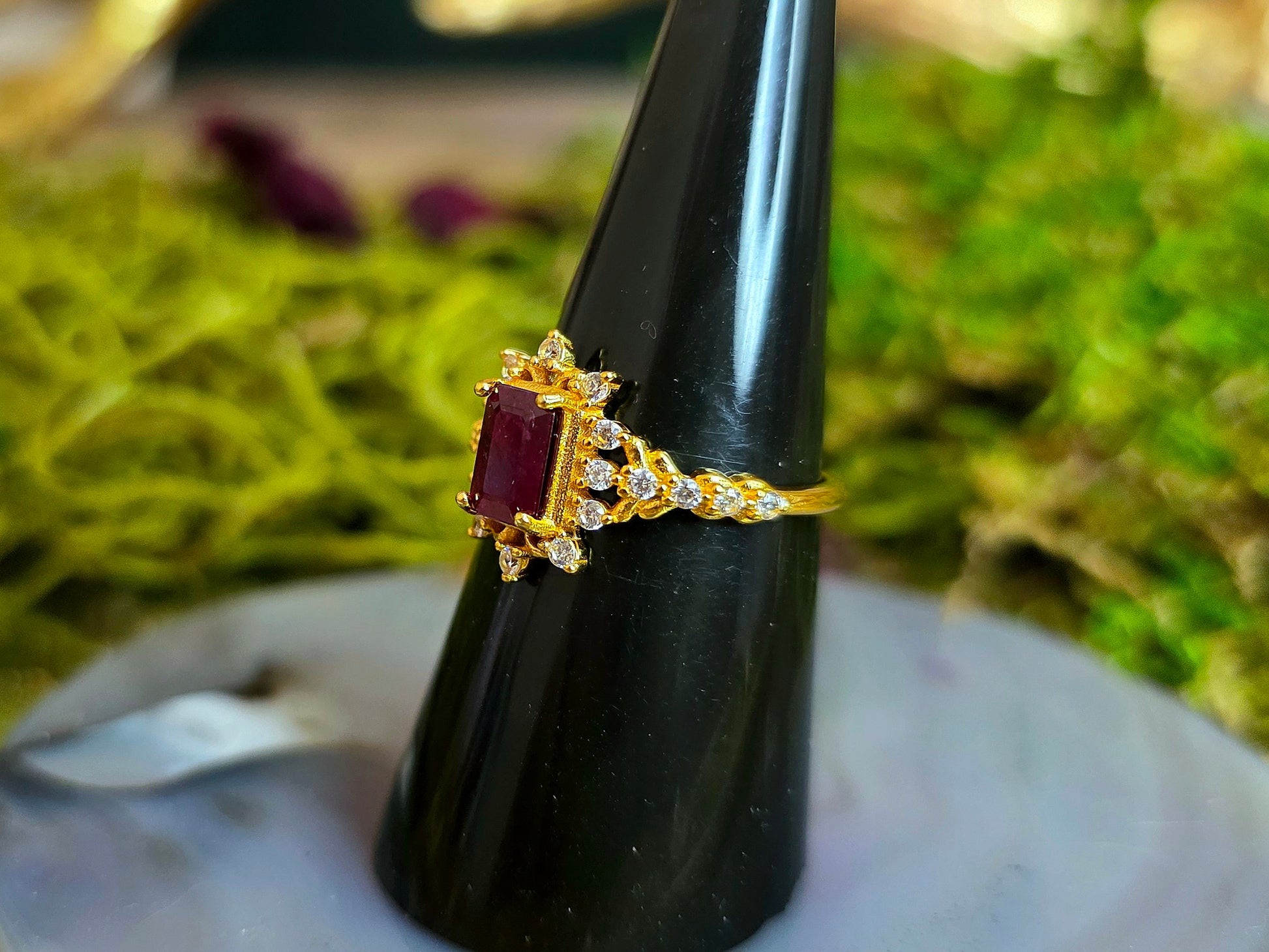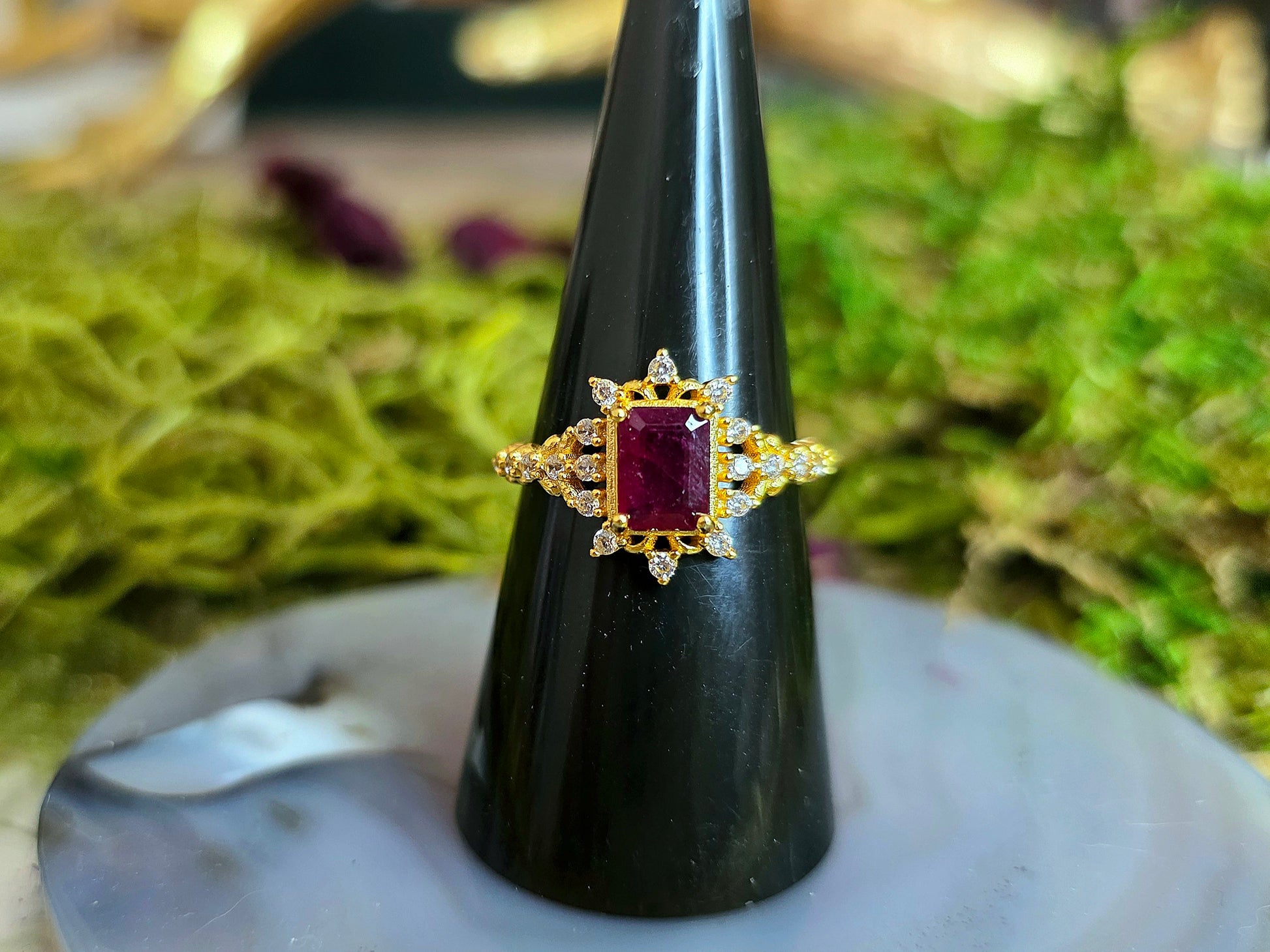 This rings features a 7mm natural ruby with a subtle flash. The stone has been set into an adjustable sterling silver ring with gold plating and zircon accents.