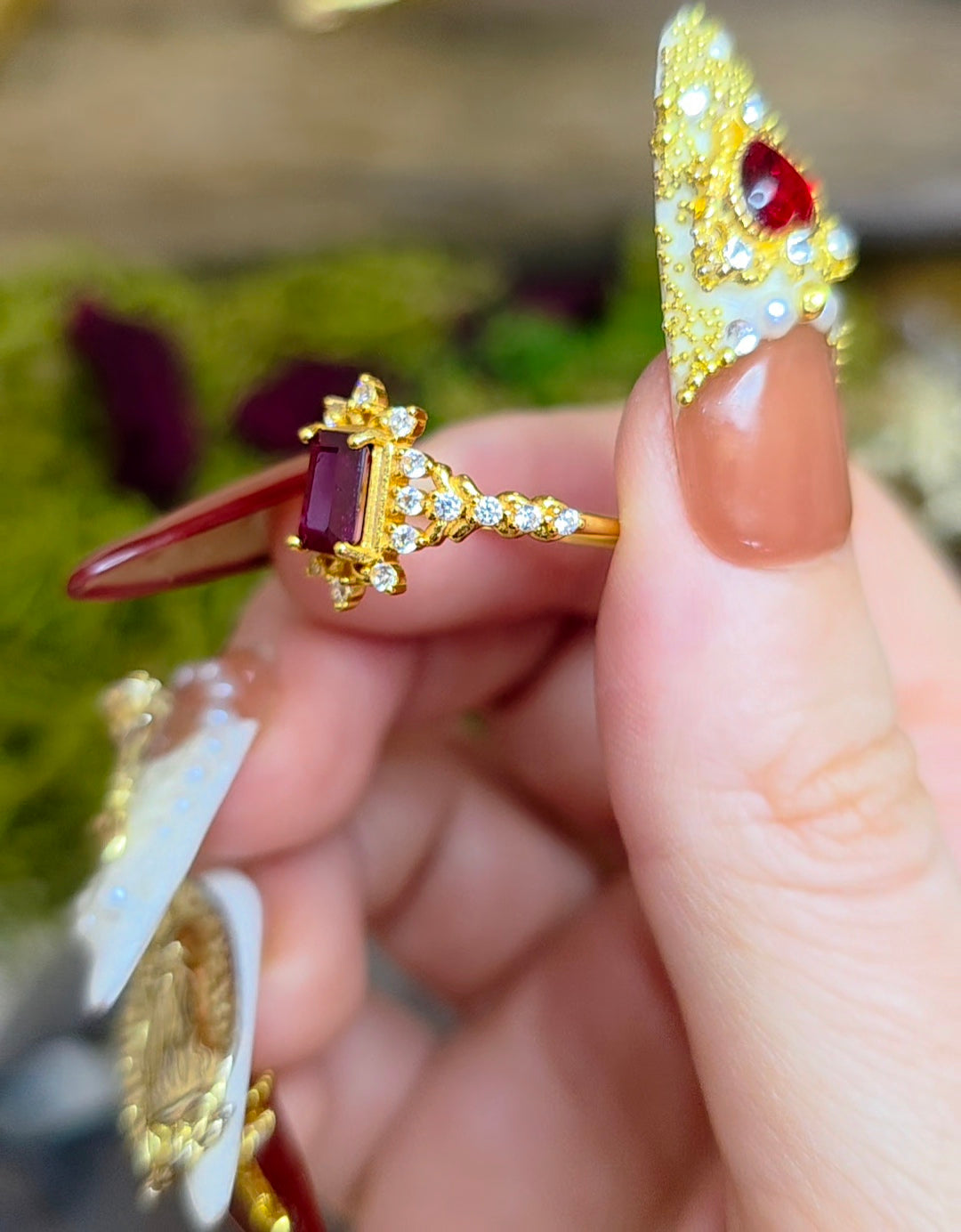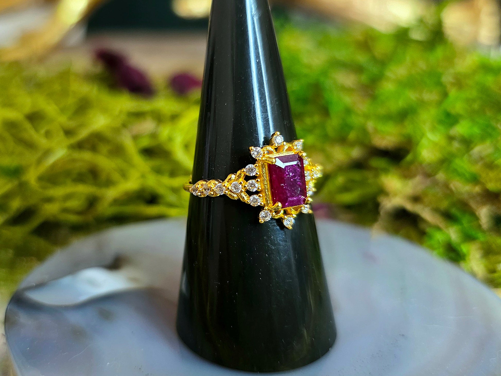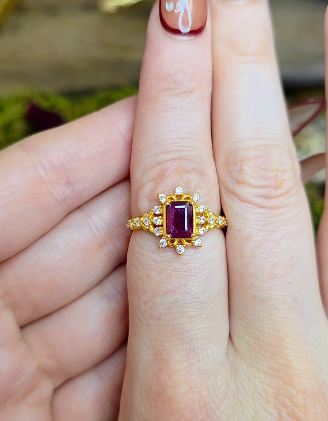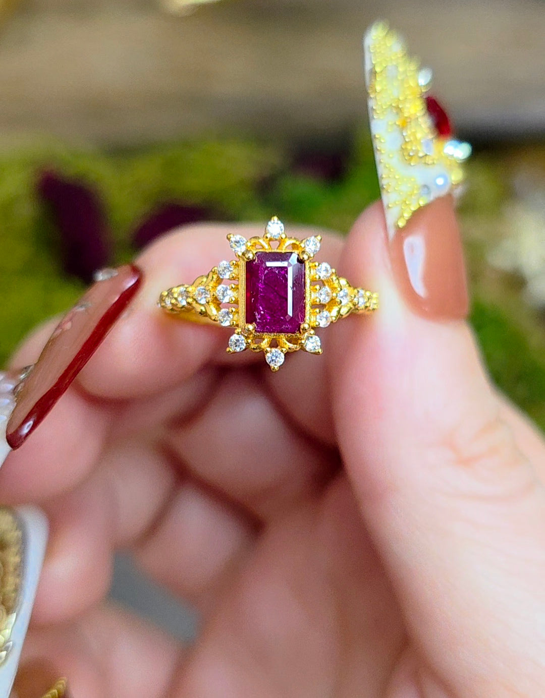 This rings features a 7mm natural ruby with a subtle flash. The stone has been set into an adjustable sterling silver ring with gold plating and zircon accents.