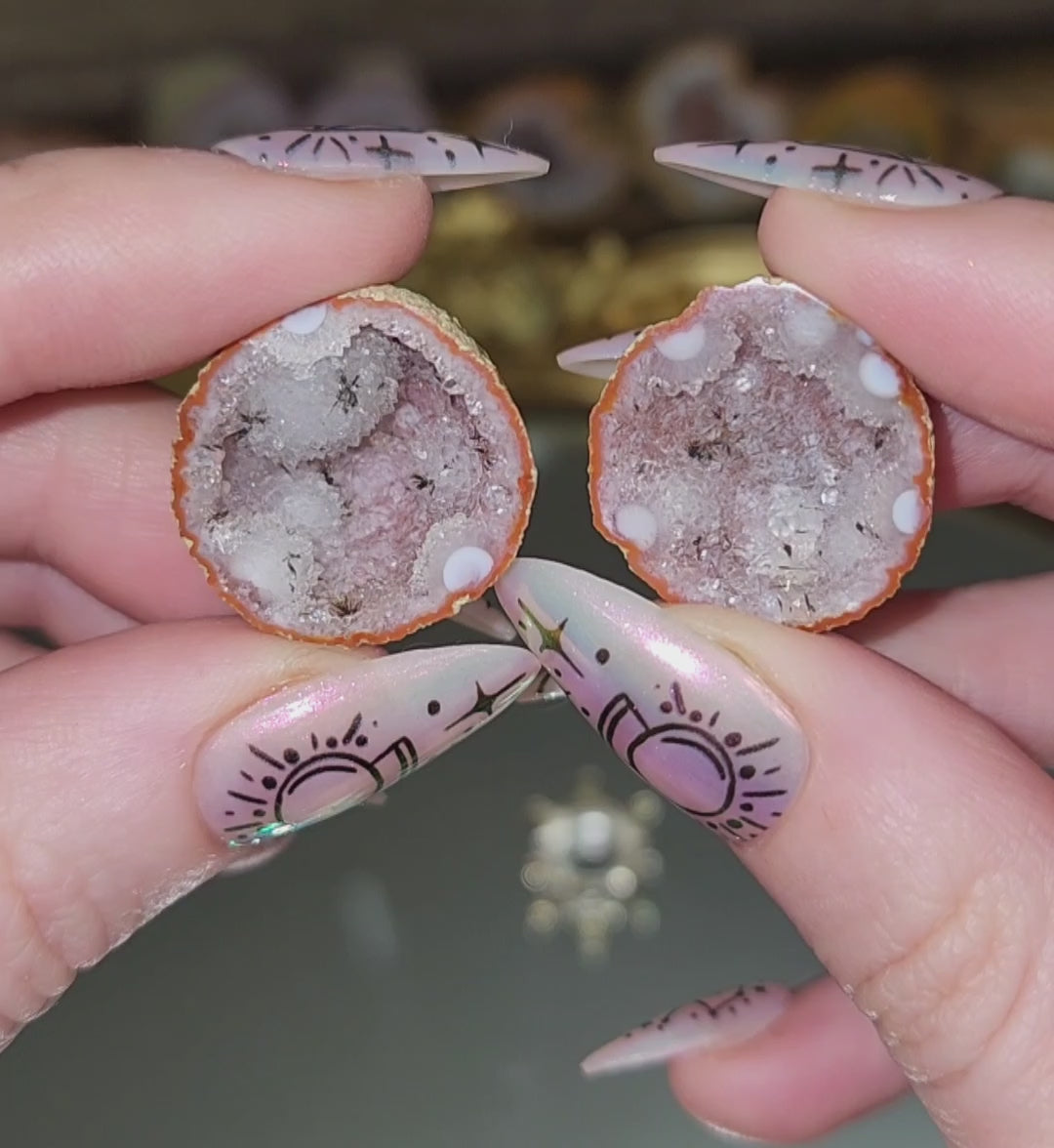 These geodes have been cut and polished. Listing is for 1 whole geode (2 pieces) plus two display stands.
