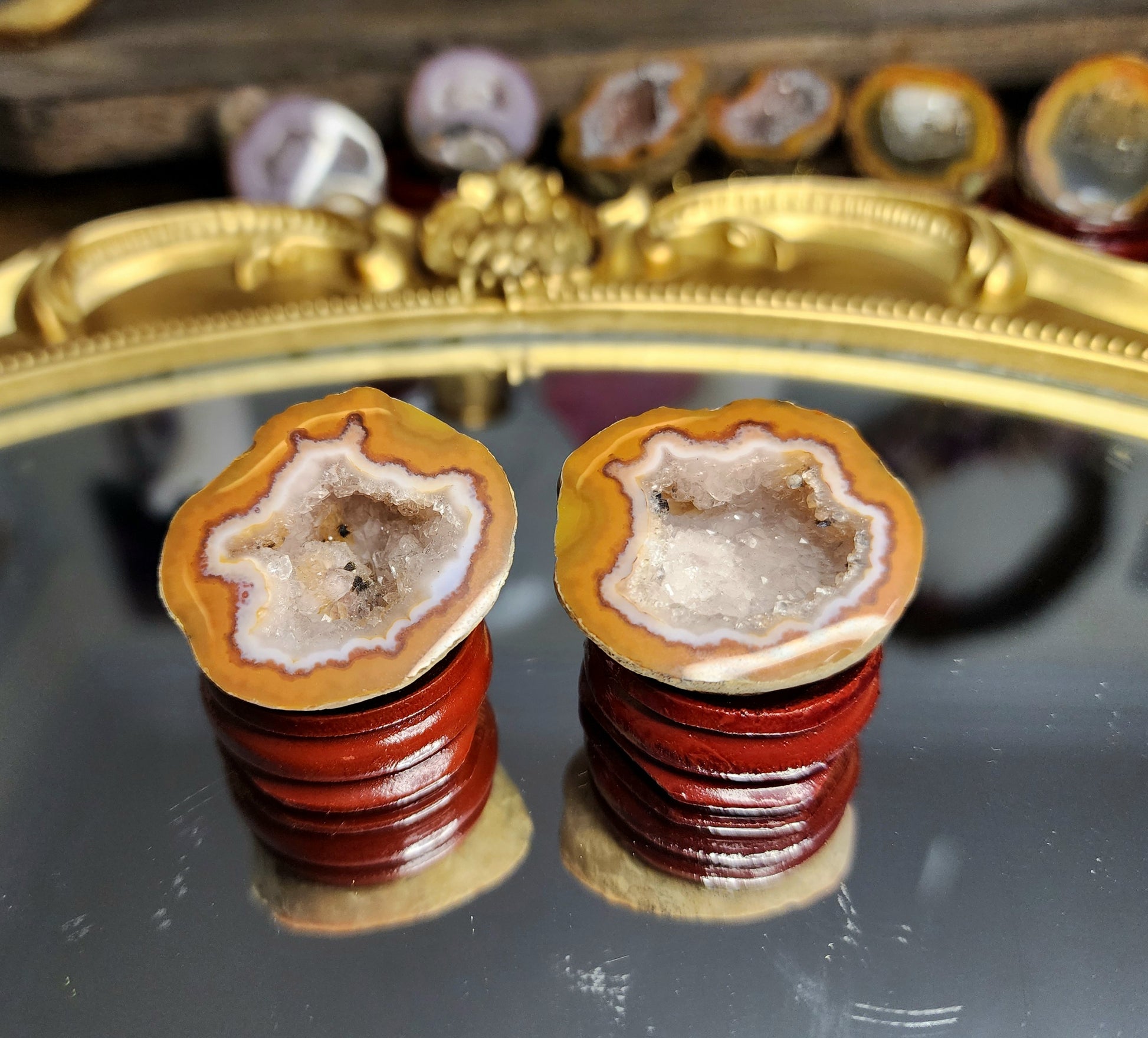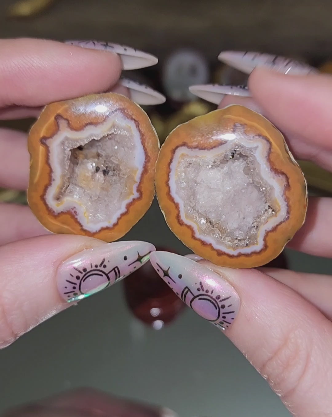These geodes have been cut and polished. Listing is for 1 whole geode (2 pieces) plus two display stands.
