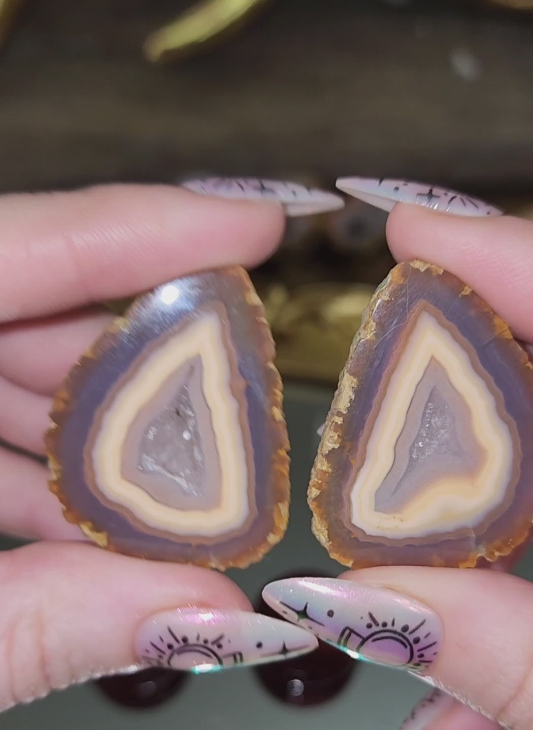 These geodes have been cut and polished. Listing is for 1 whole geode (2 pieces) plus two display stands.