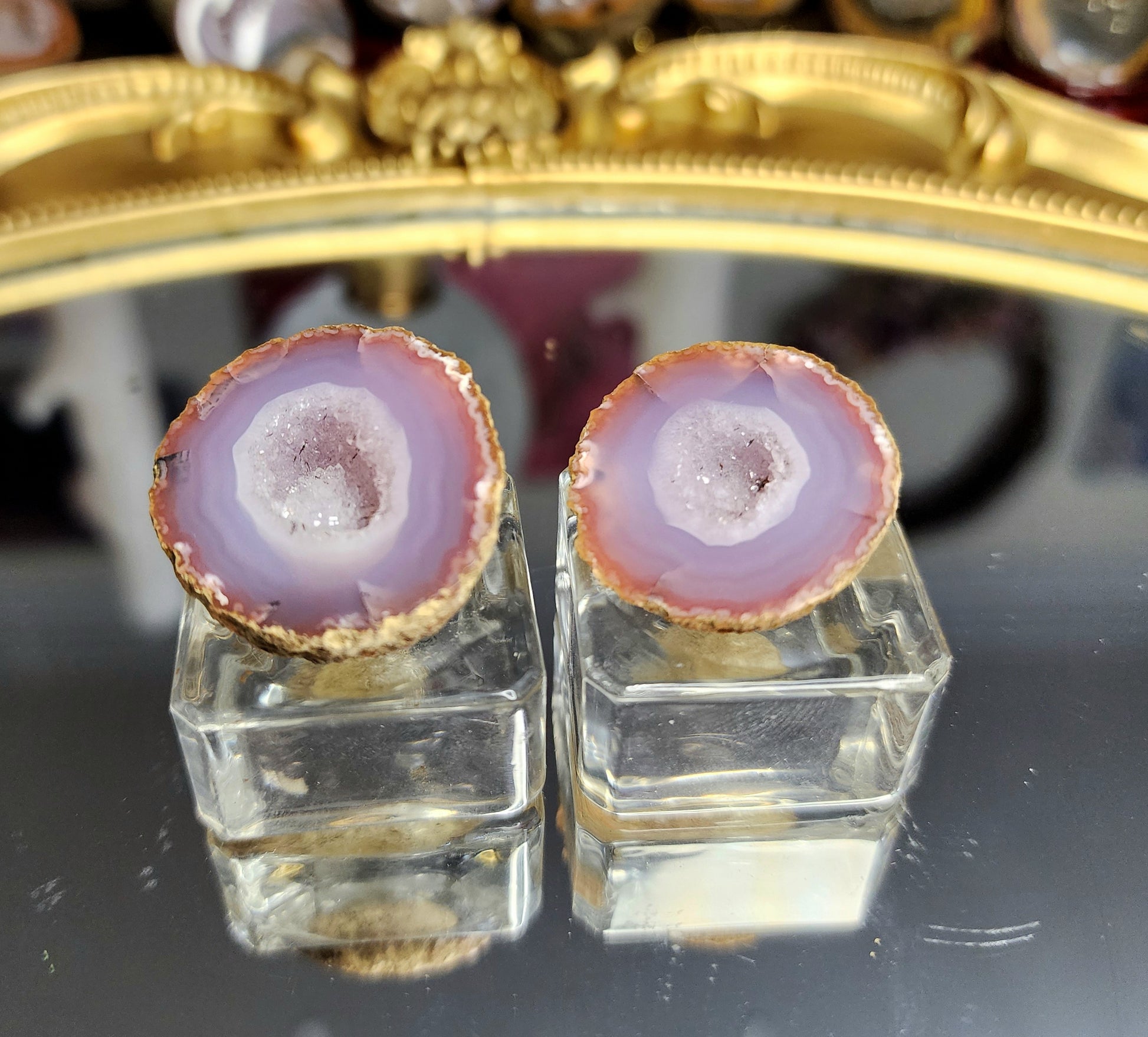 These geodes have been cut and polished. Listing is for 1 whole geode (2 pieces) plus two display stands.