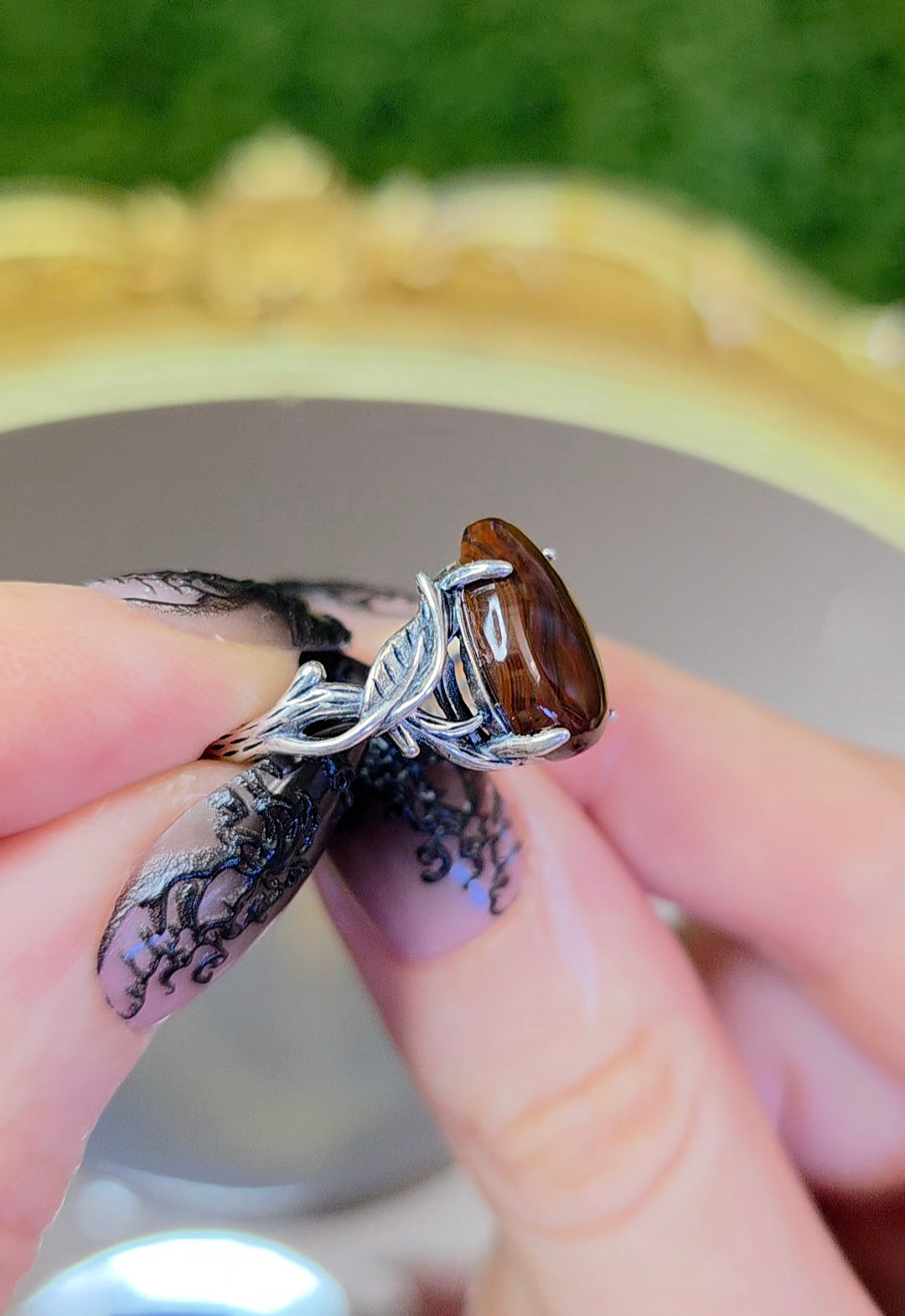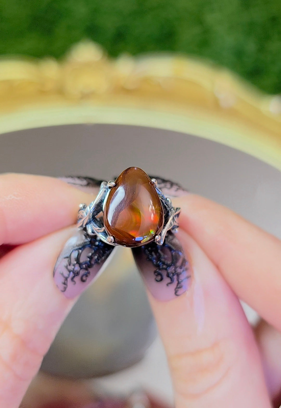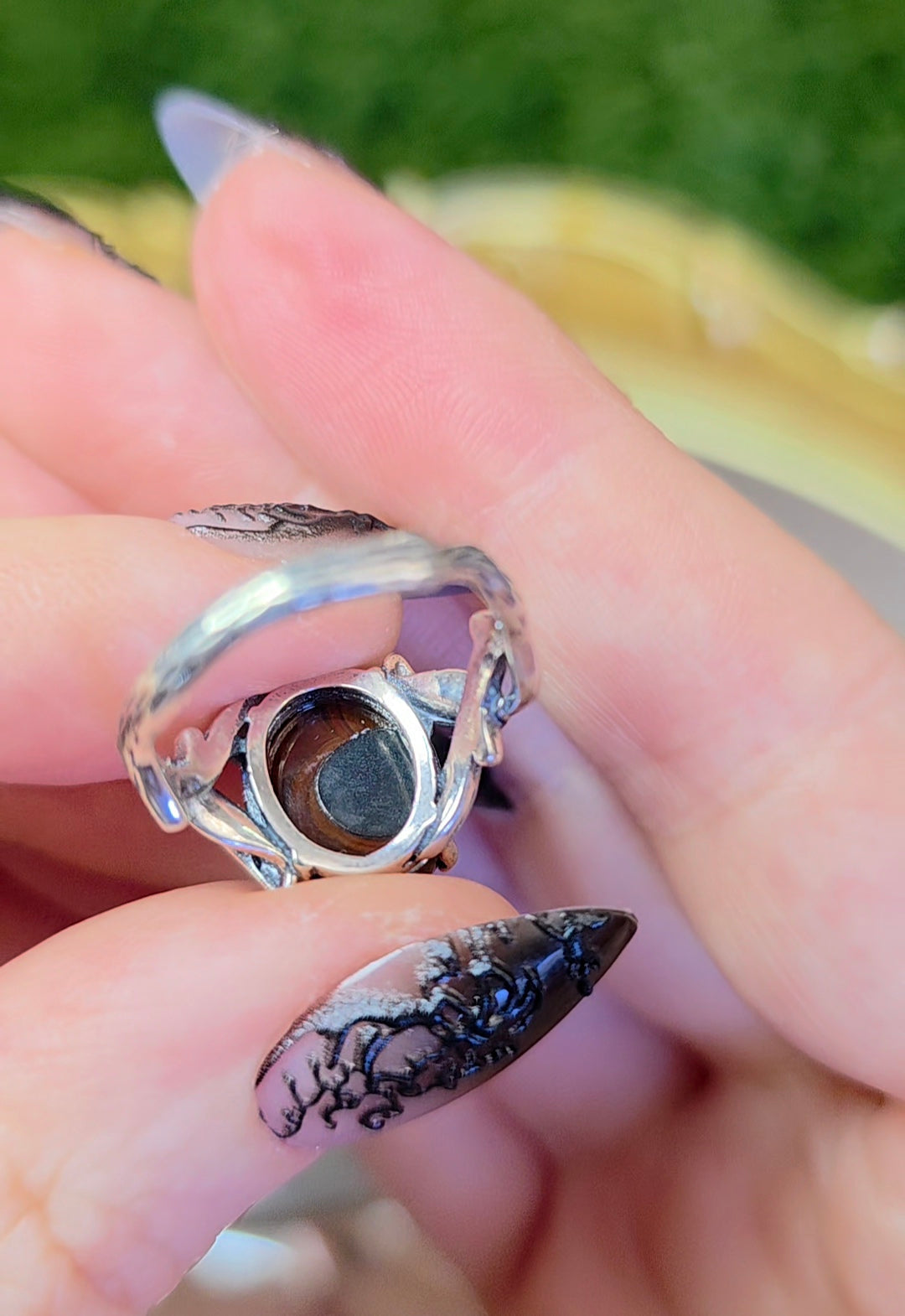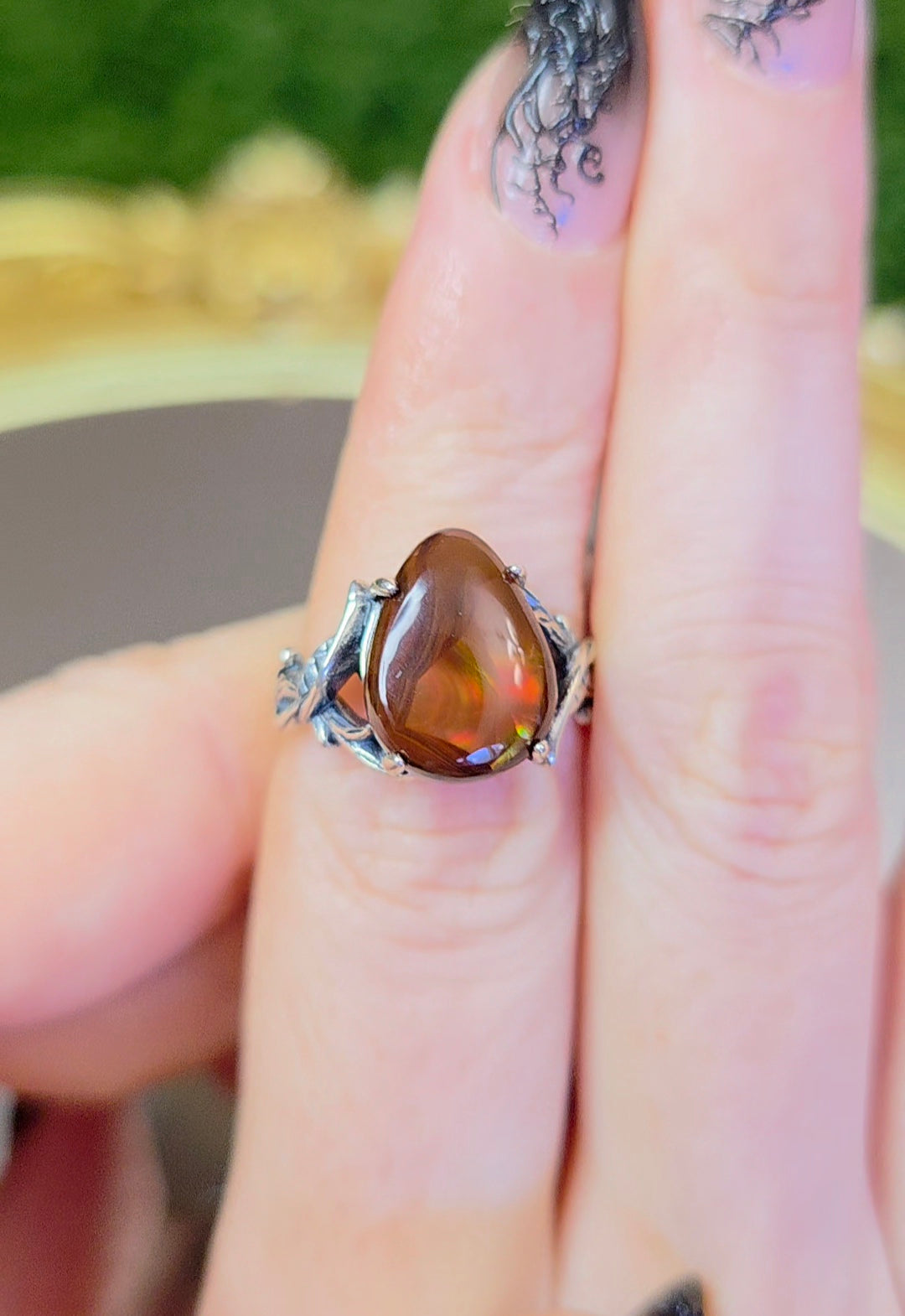 This stone is 13 x 10mm and has flashes of green and yellow. It is set in an adjustable sterling silver band that will bet fit sizes 6-8.