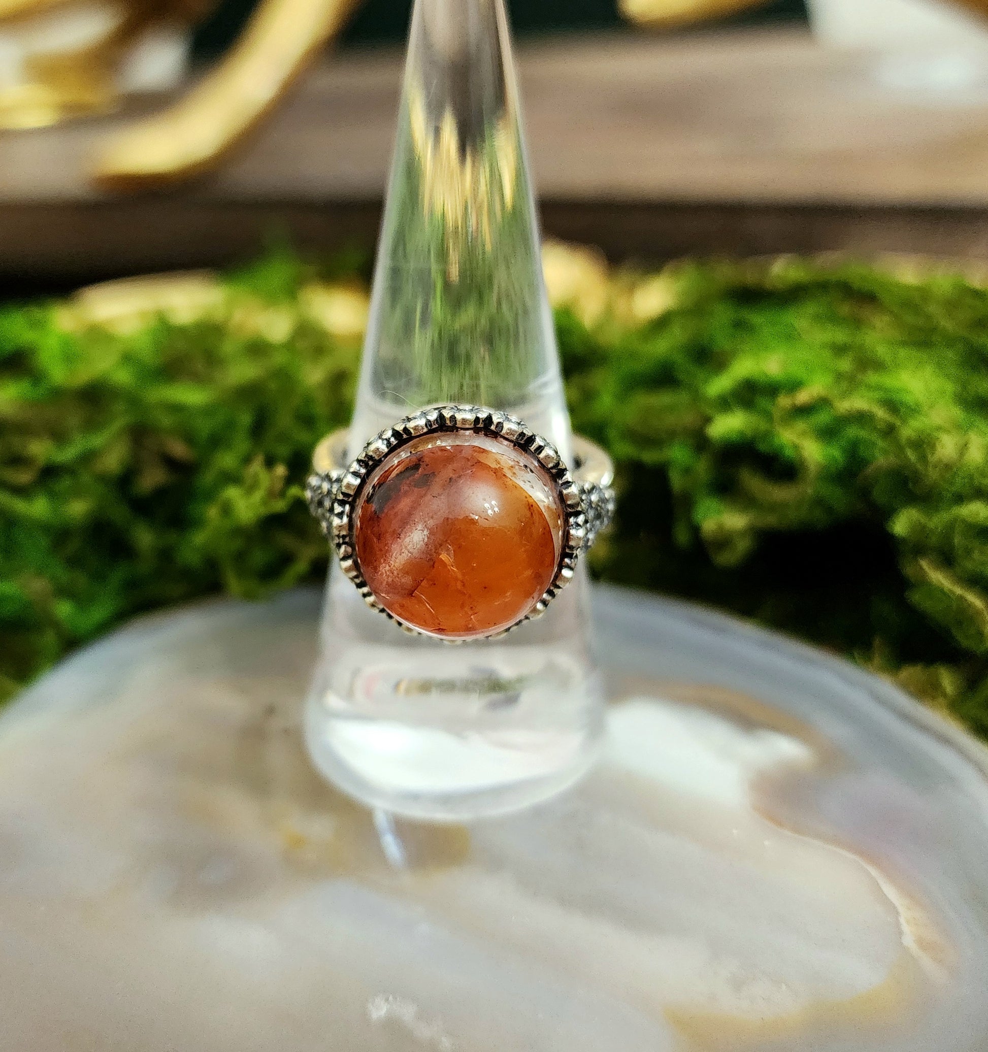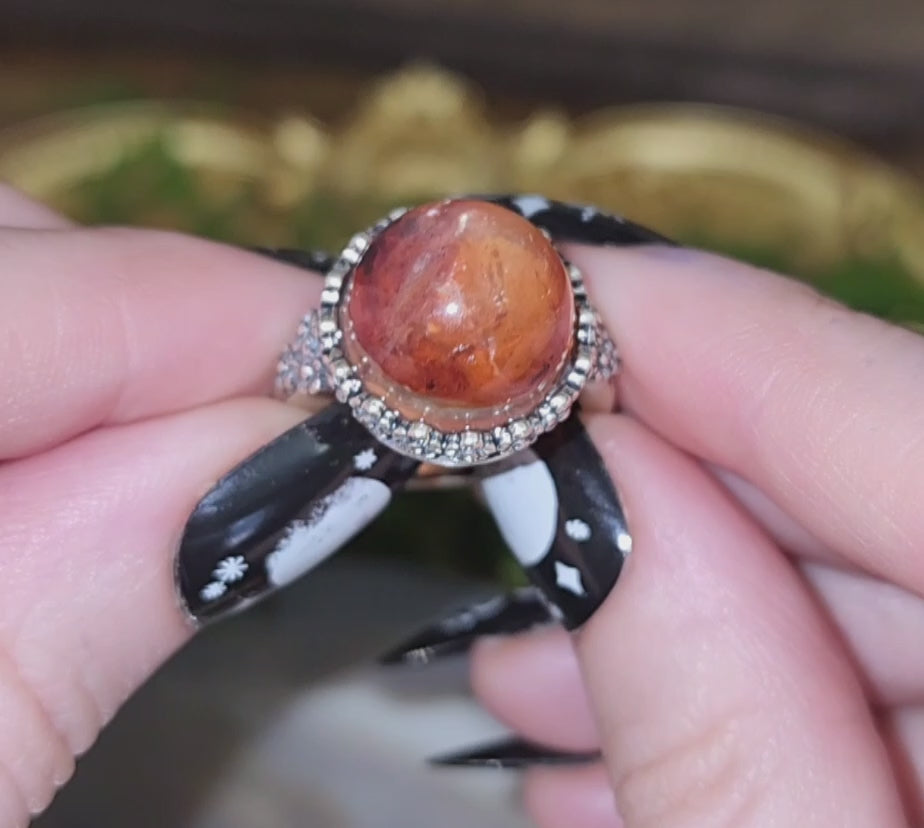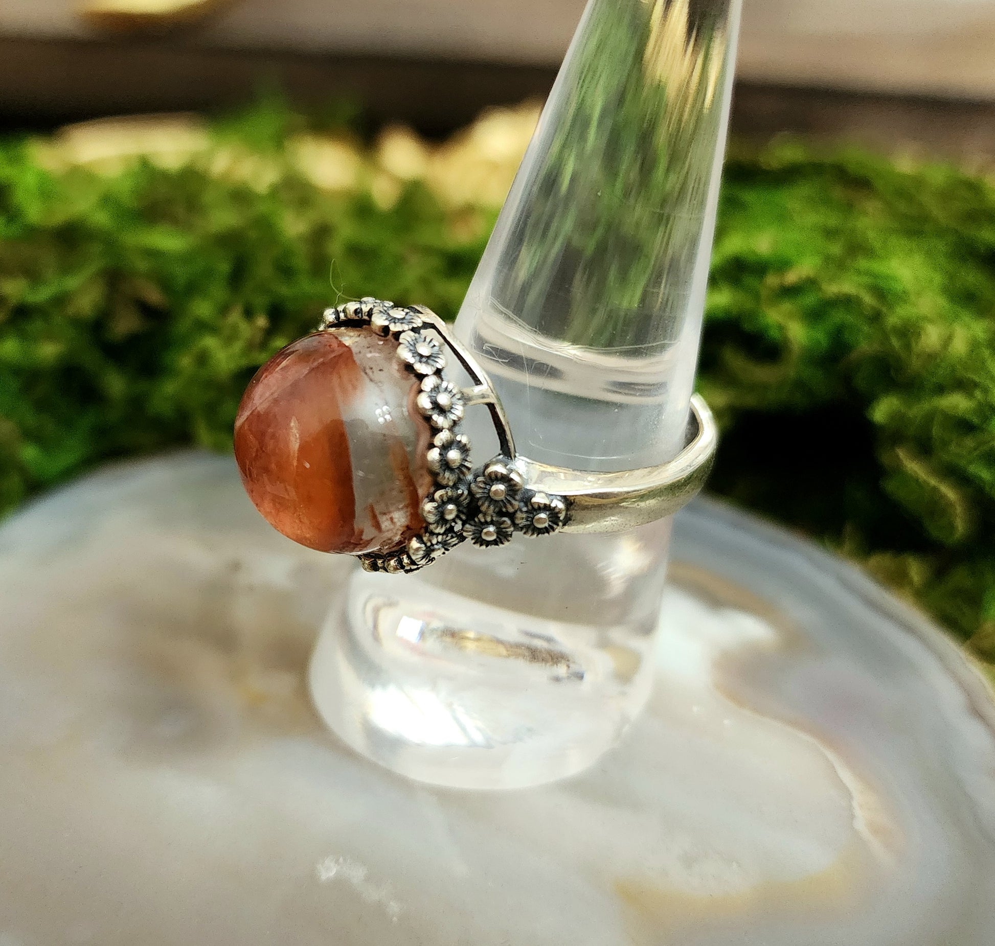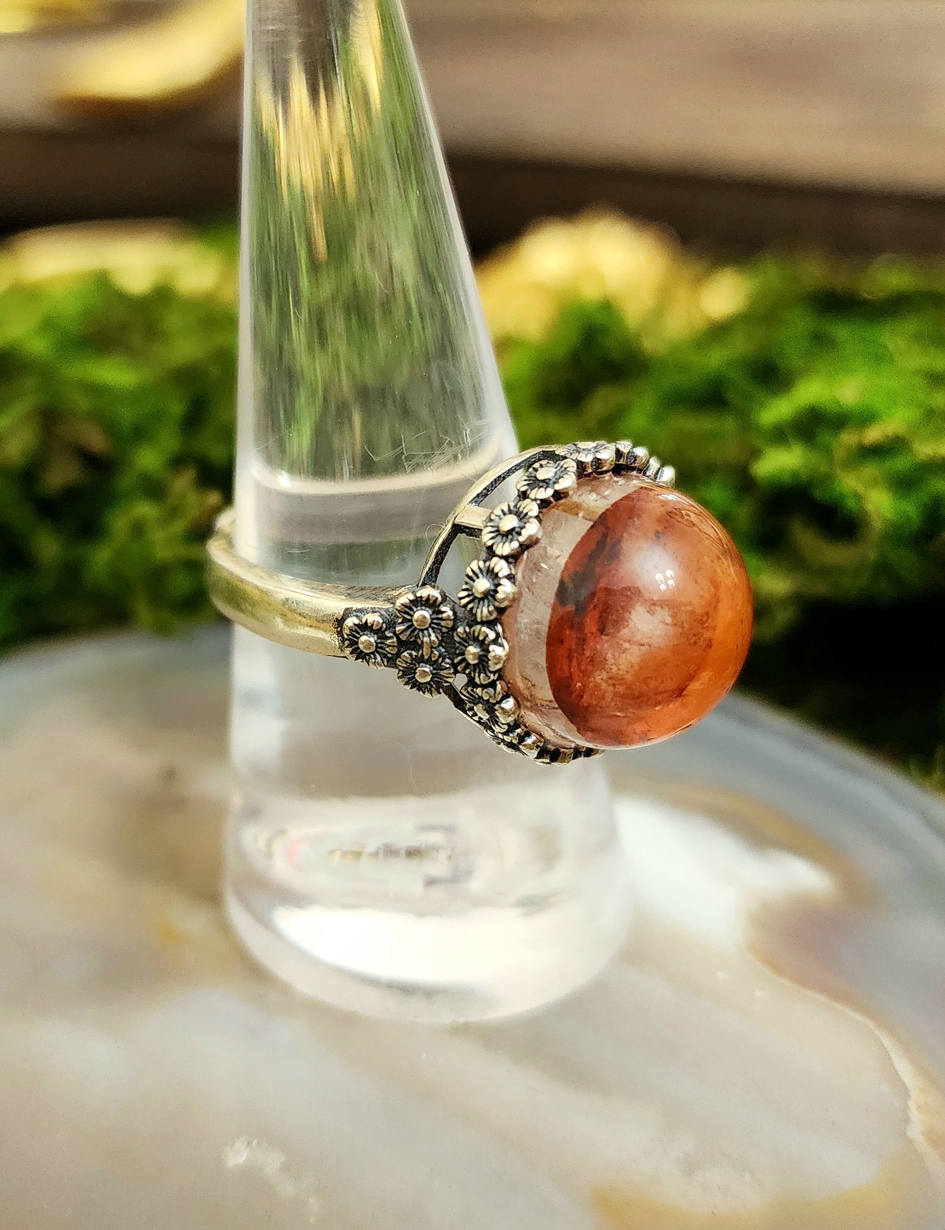 Flashy fire quartz mini sphere set into an adjustable sterling silver ring with floral decorations.