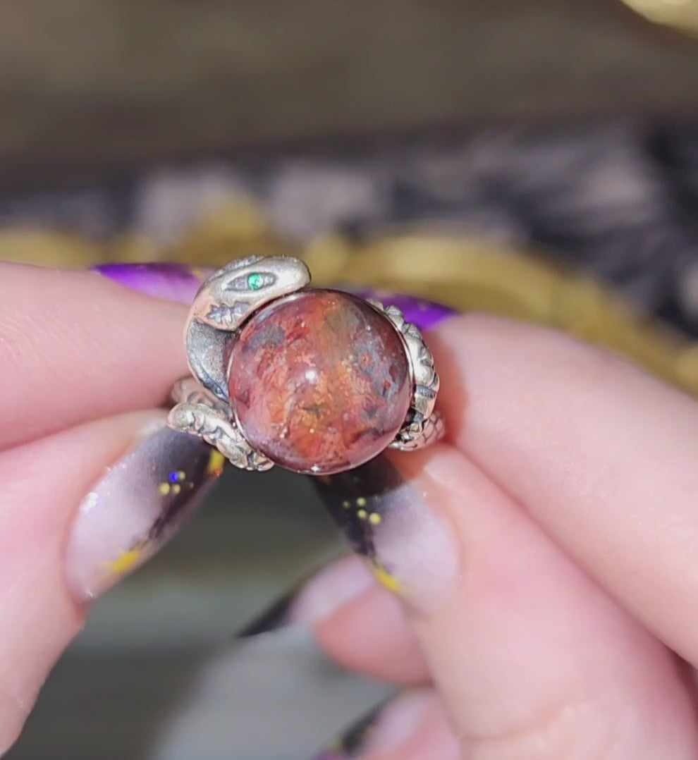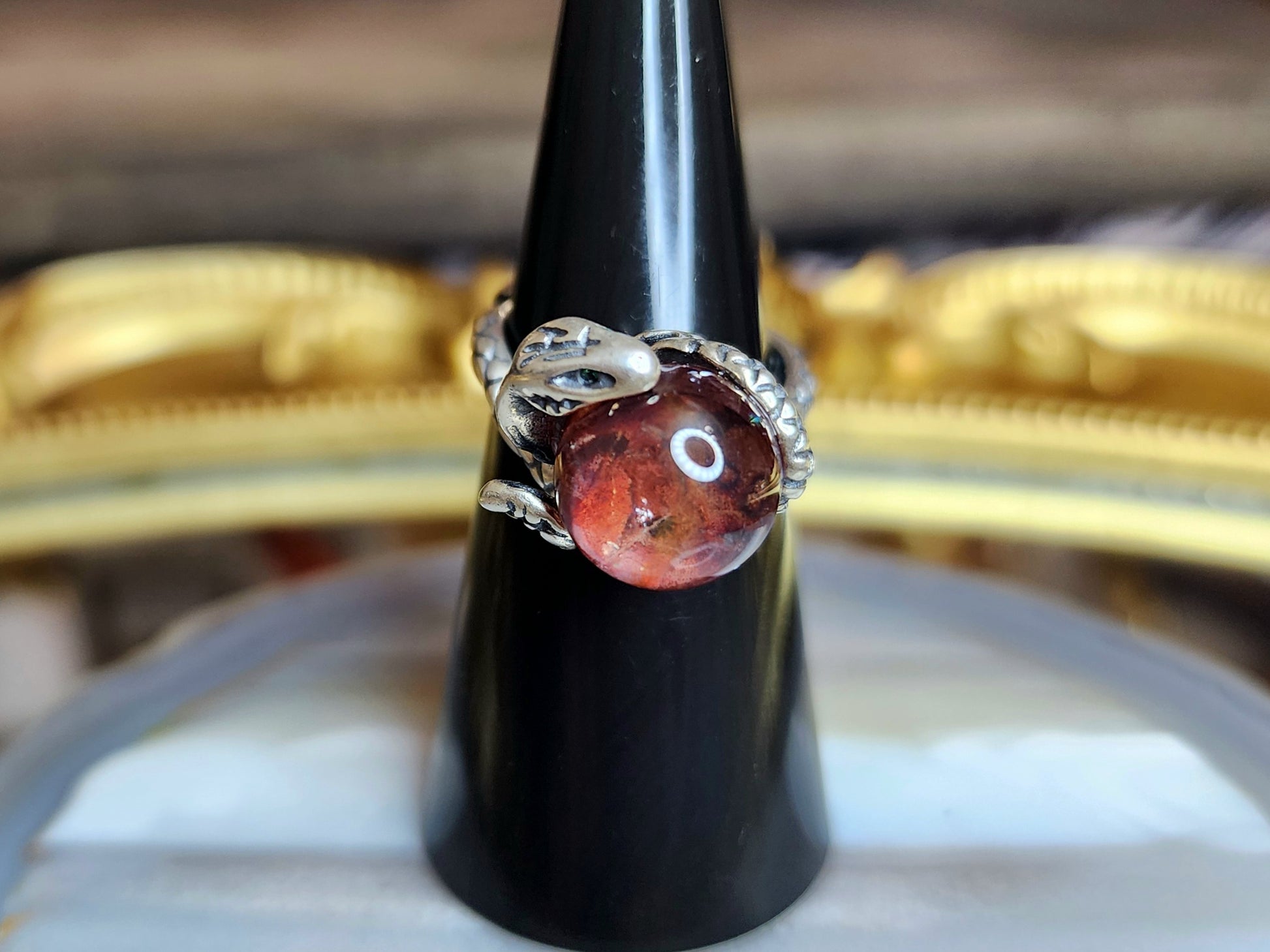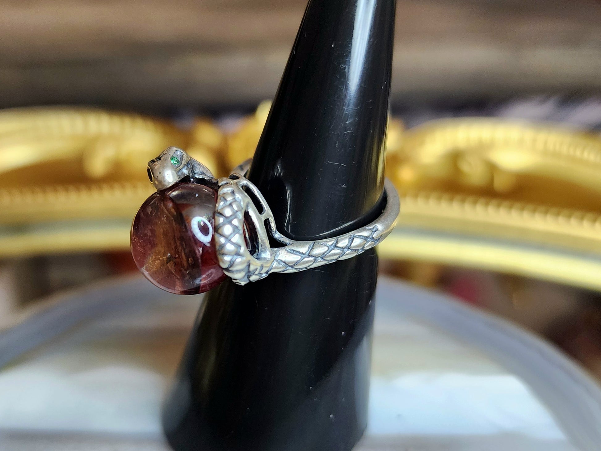 Flashy fire quartz mini sphere set into an adjustable sterling silver ring with a snake design.