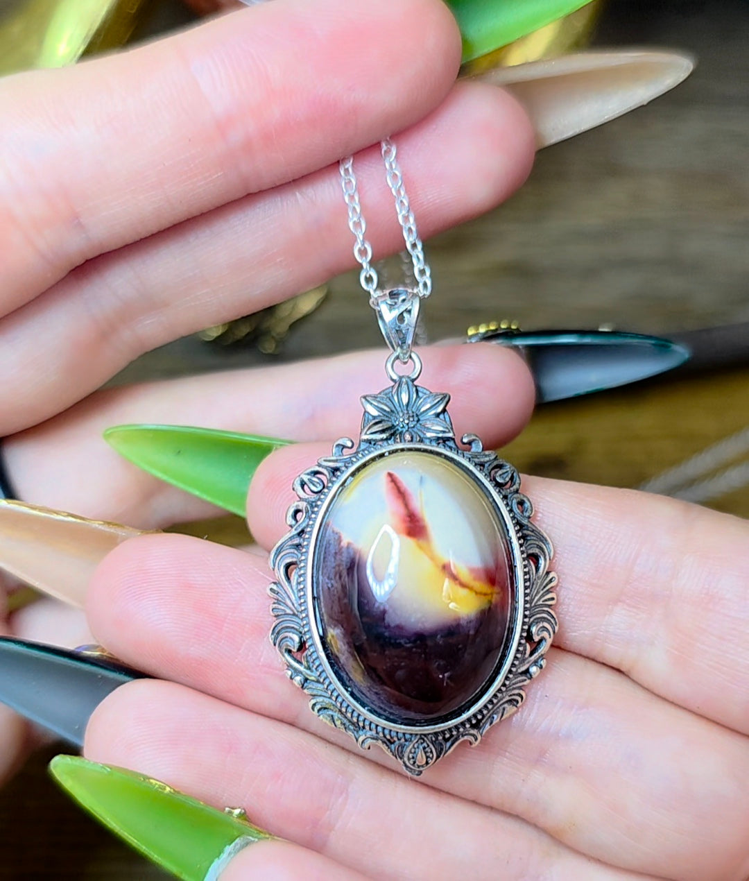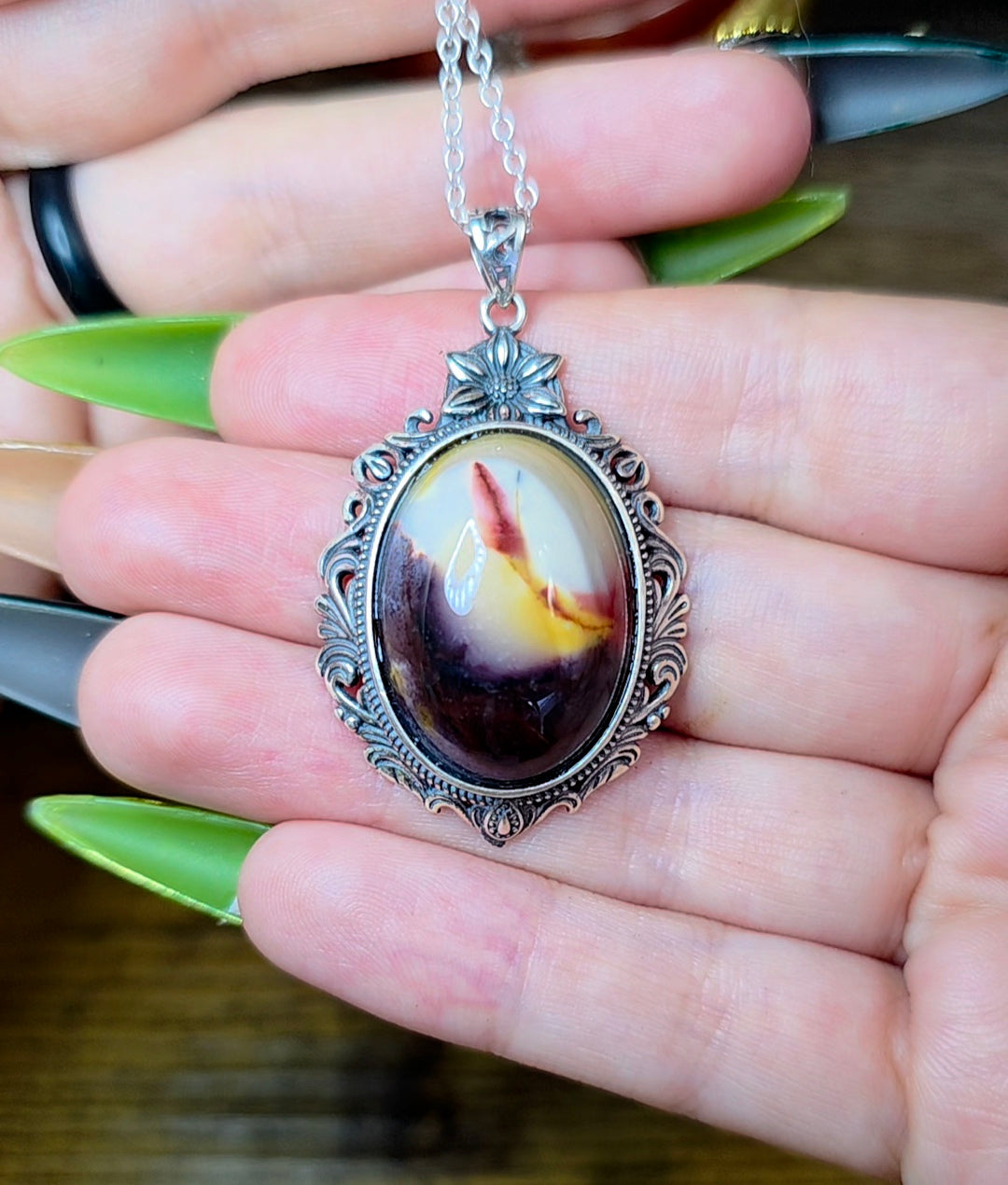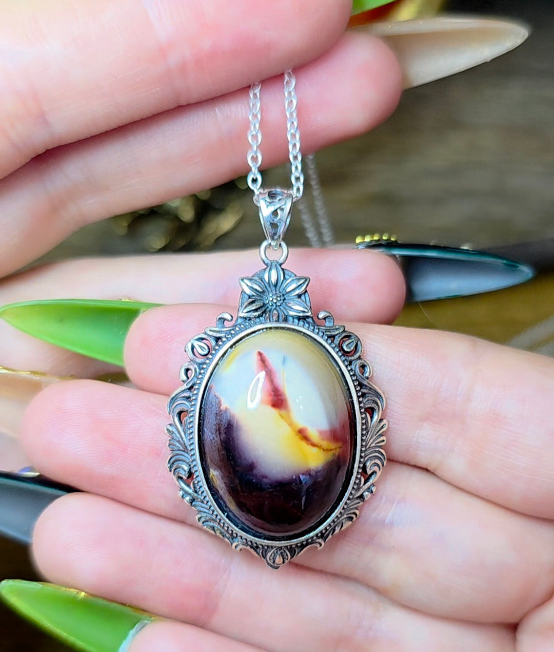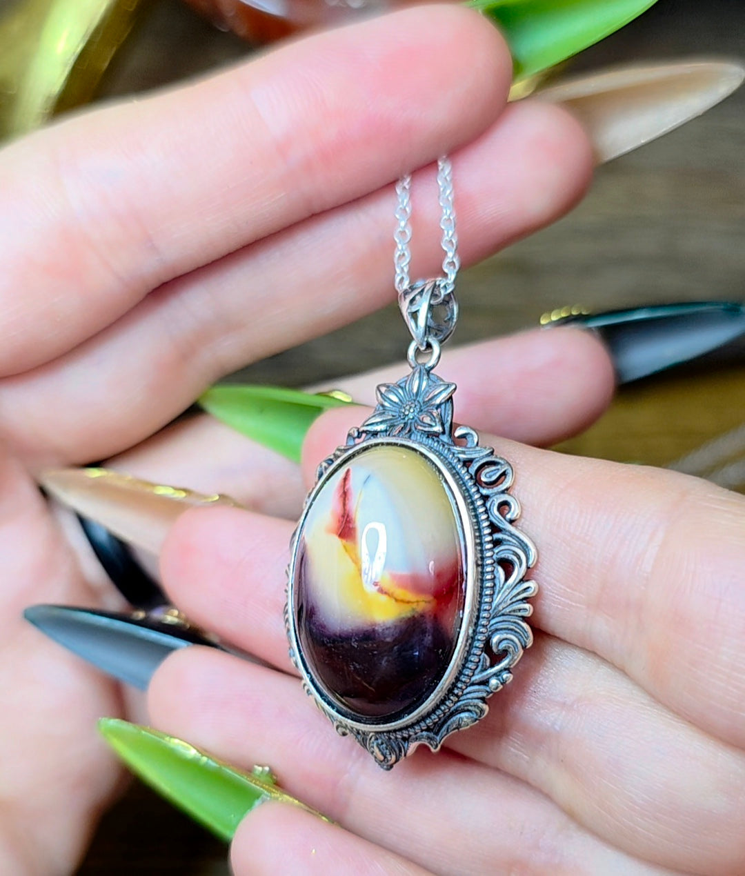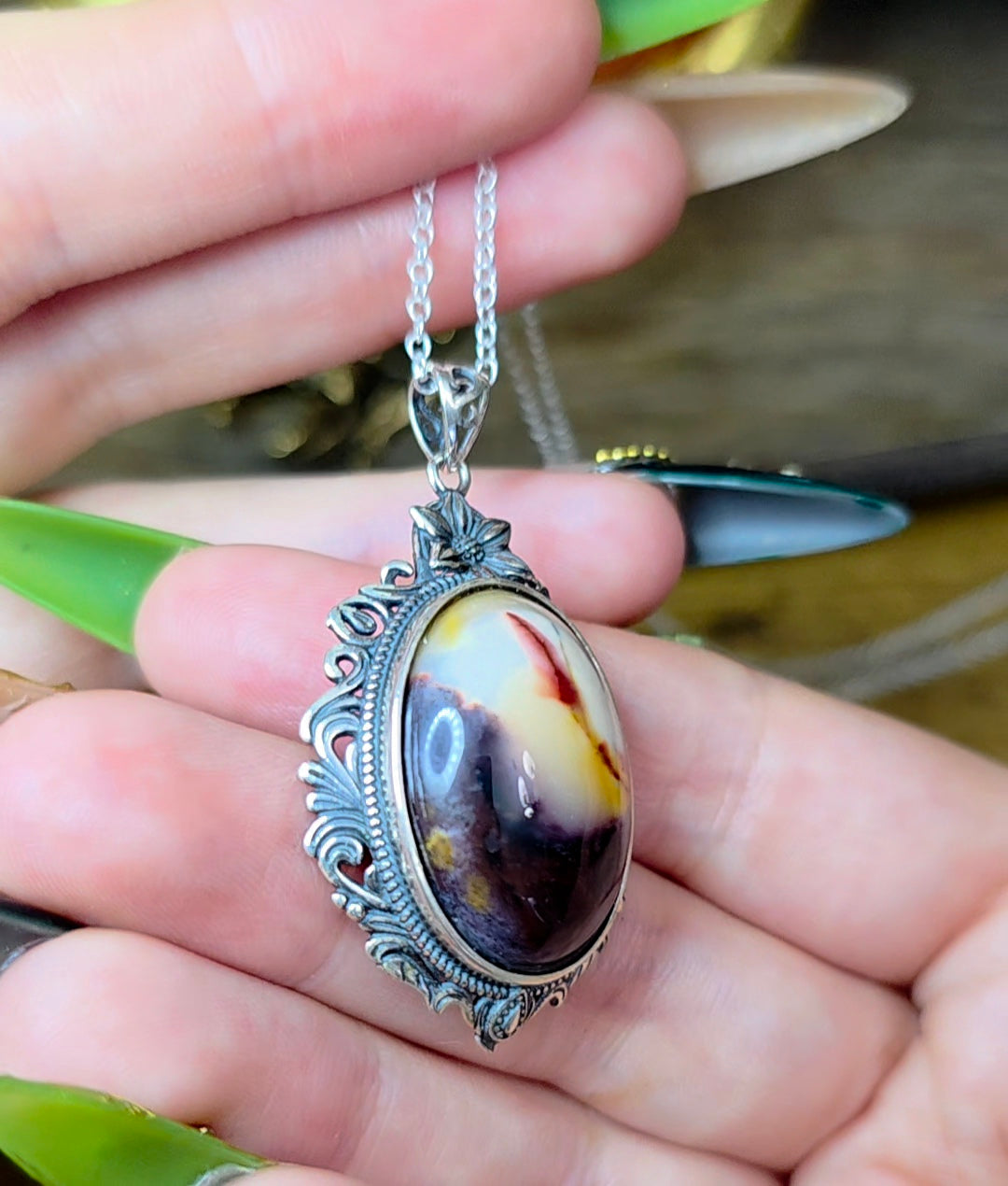 This necklace features a high quality mookaite pendant in shades of purple, yellow, tan, white, and red and set into a sterling silver pendant bail.