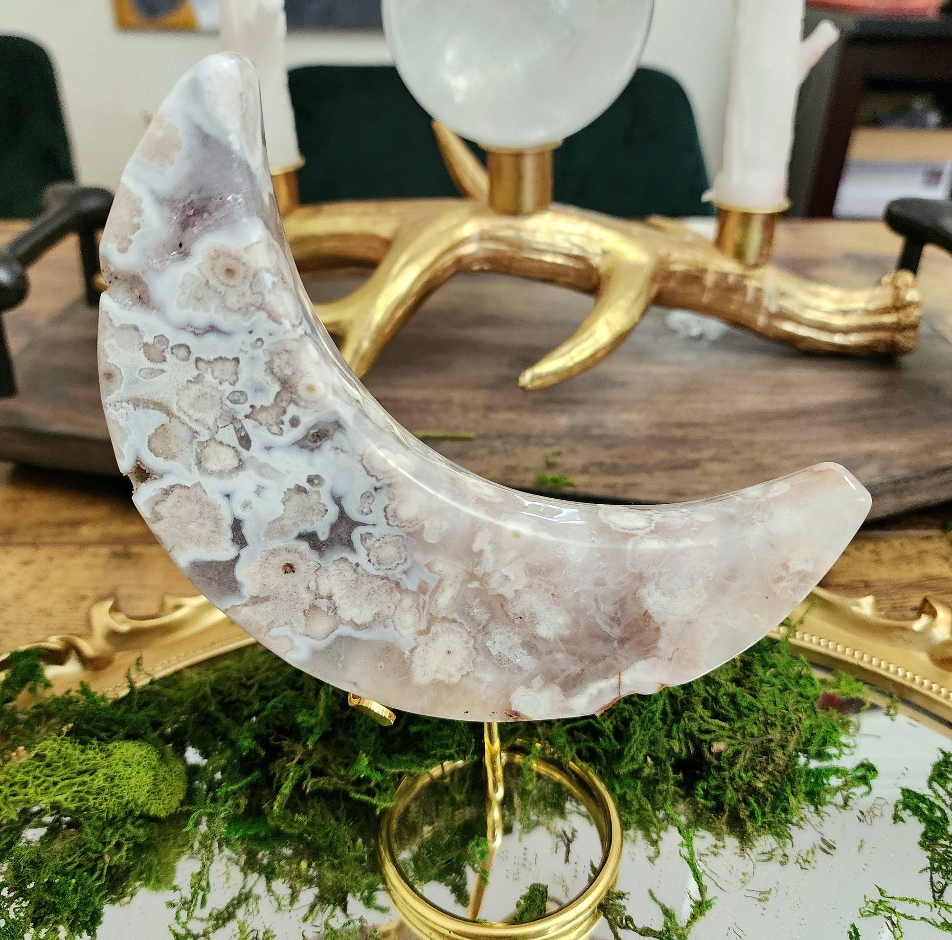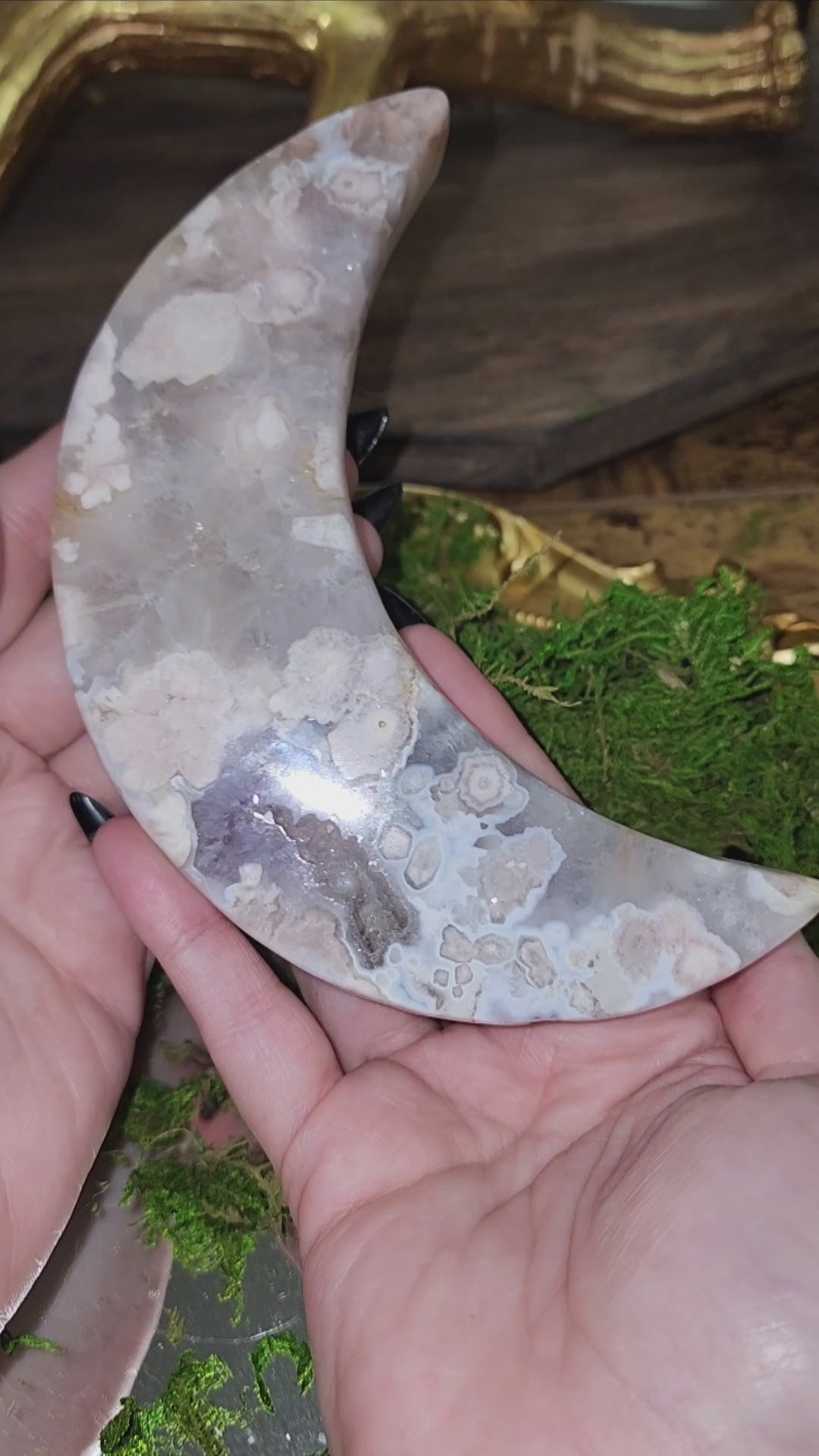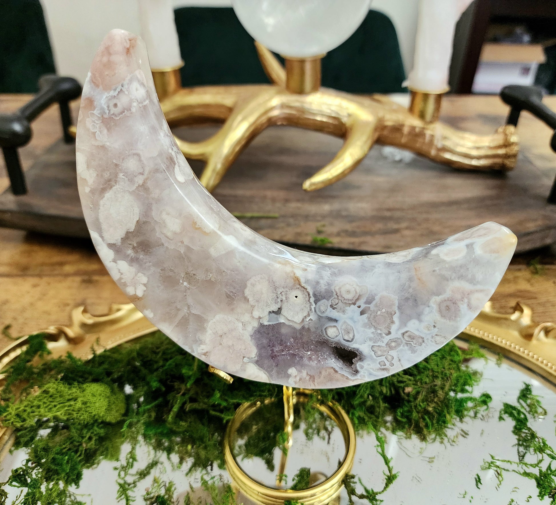 Beautiful pink flower agate and purple amethyst combination stone with druzy pockets that has been carved into a crescent moon shape.