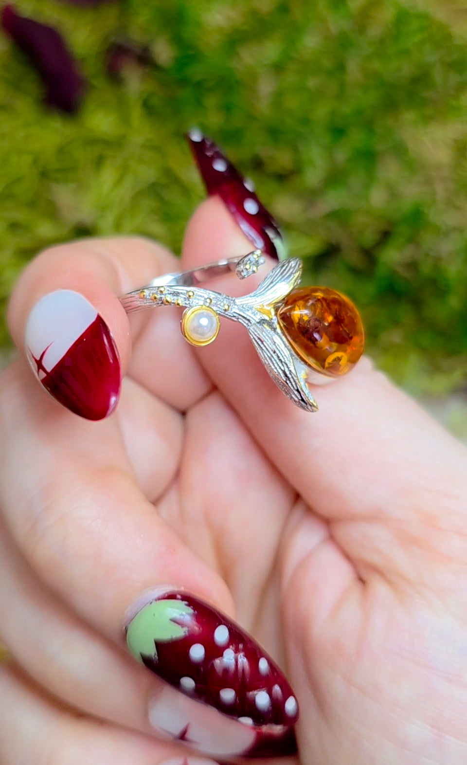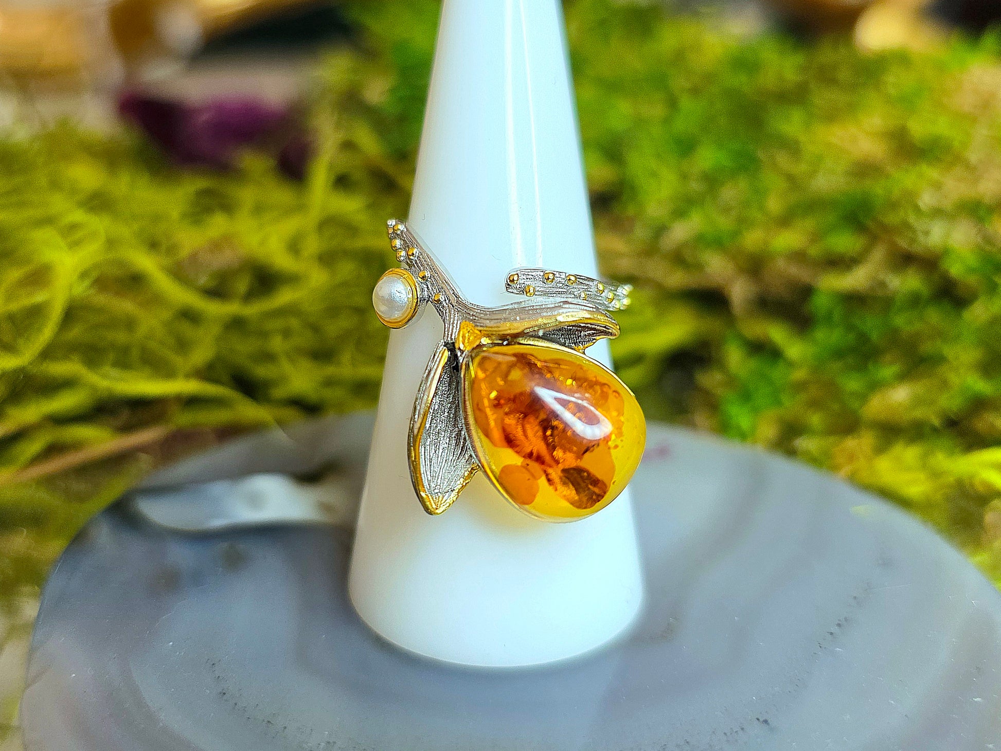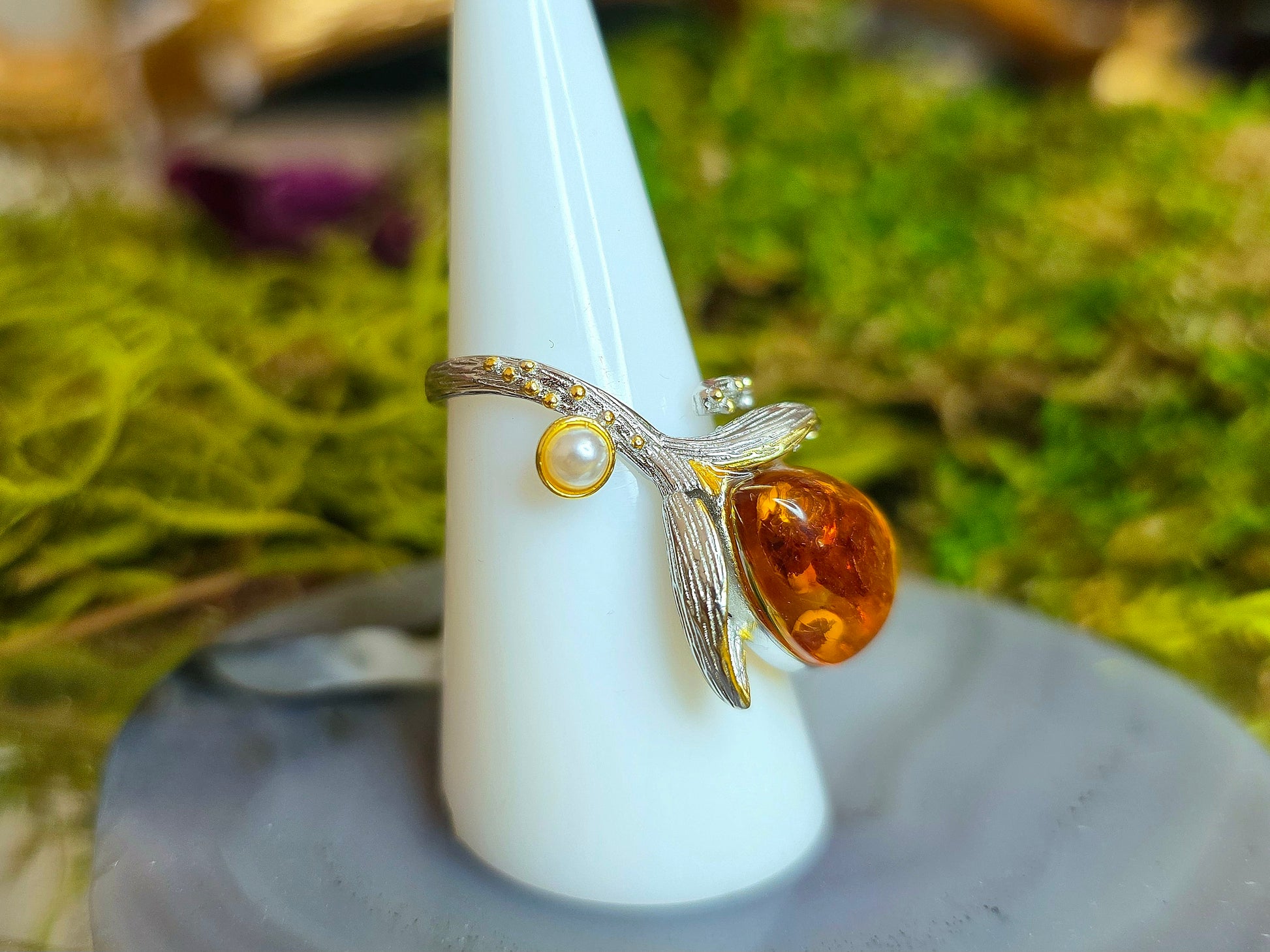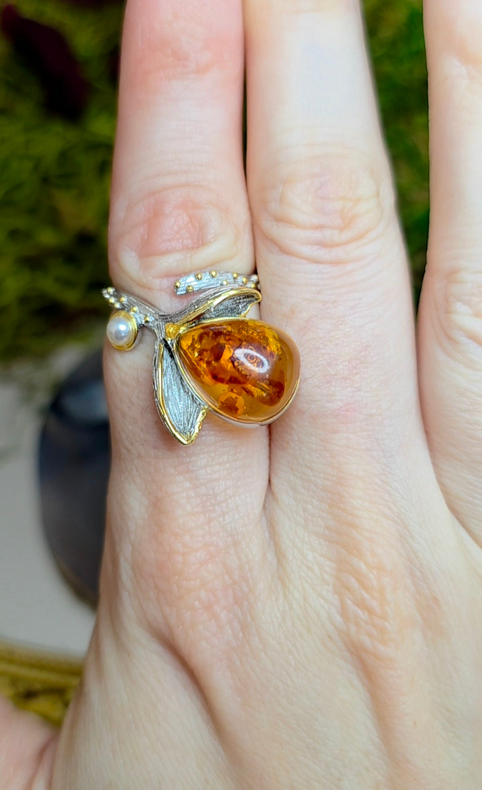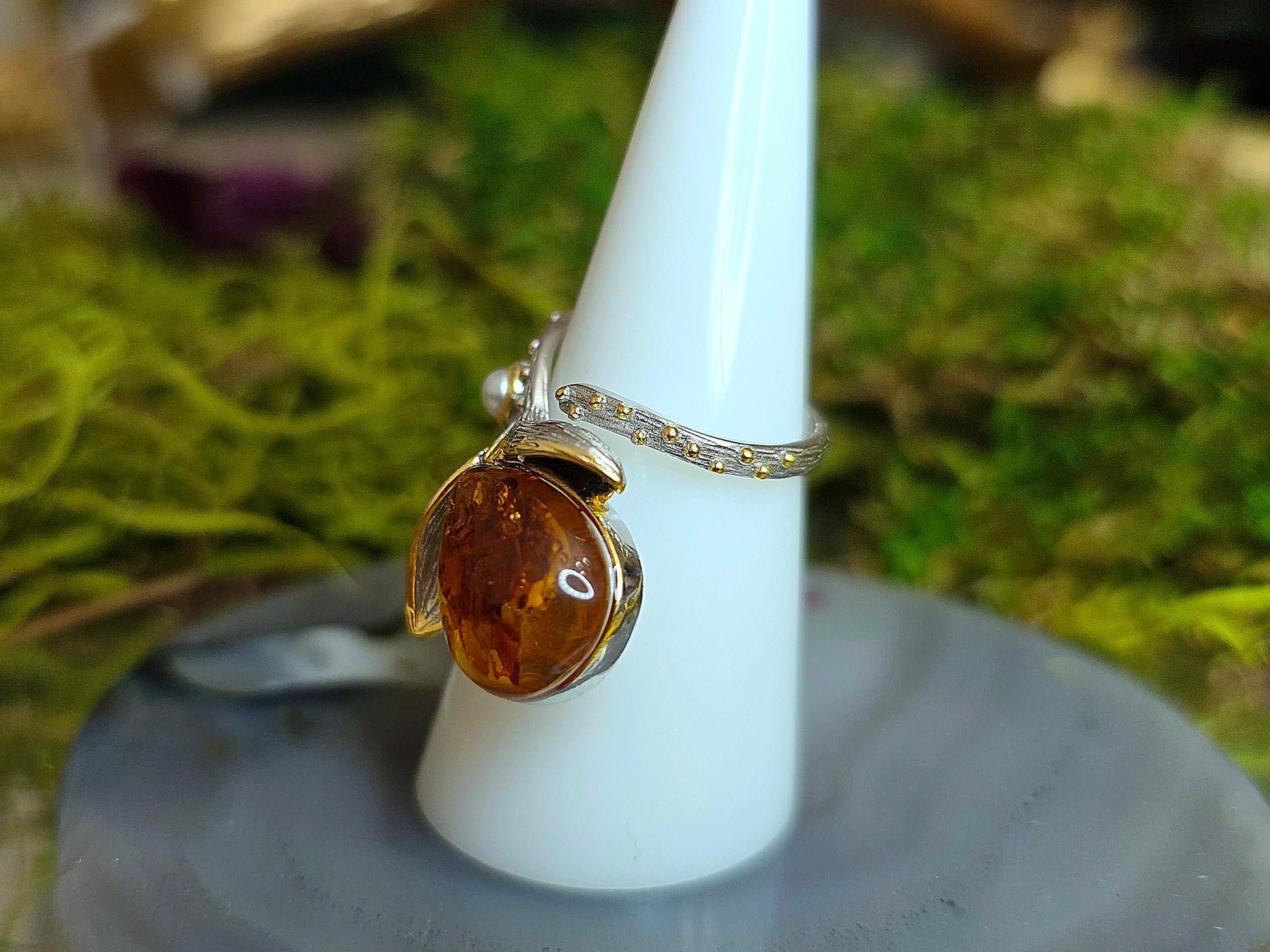 14mm Baltic amber cabochon set into an adjustable sterling silver ring with gold plating and a pearl accent.