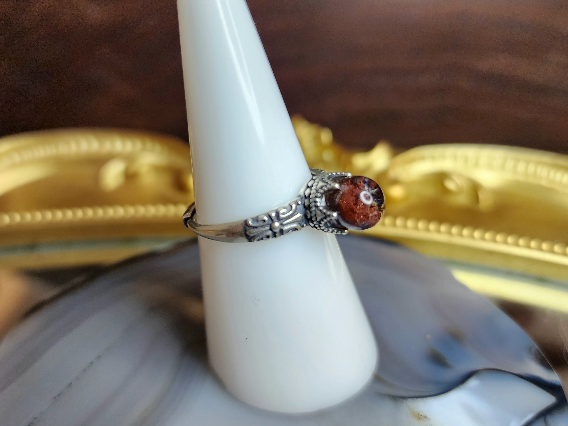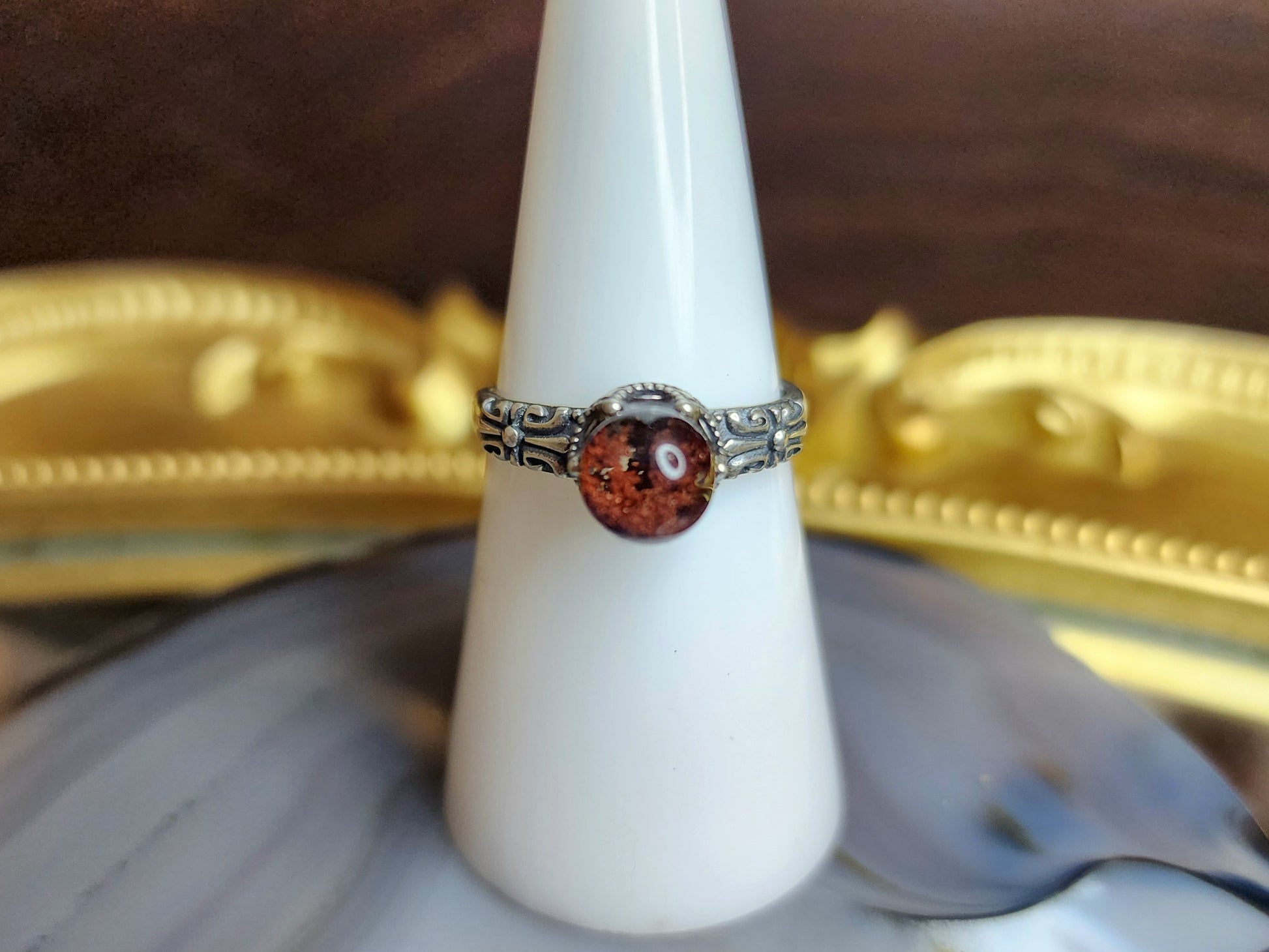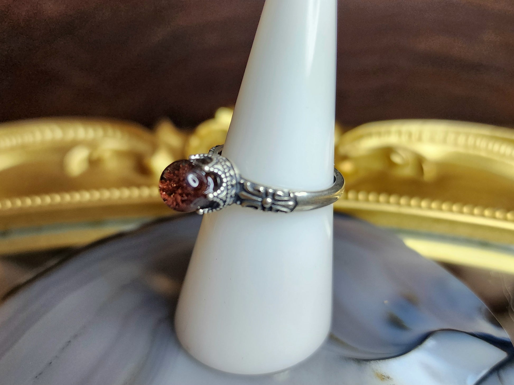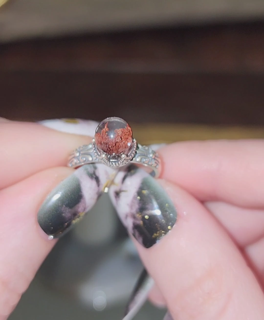 Red garden quartz mini sphere with set into an adjustable sterling silver ring with intricate details.