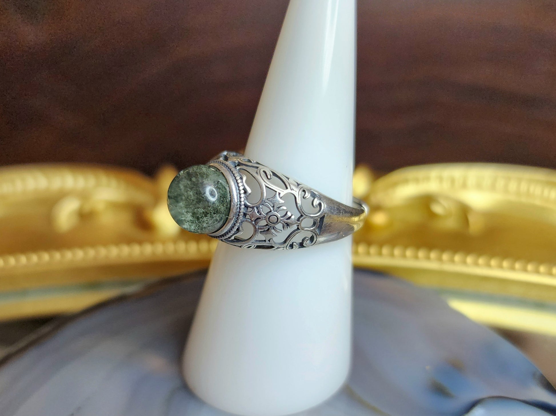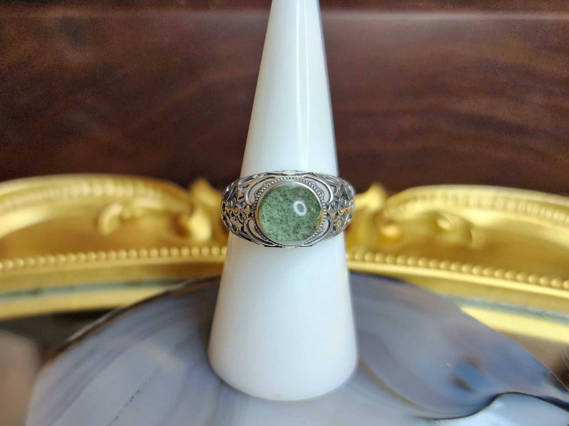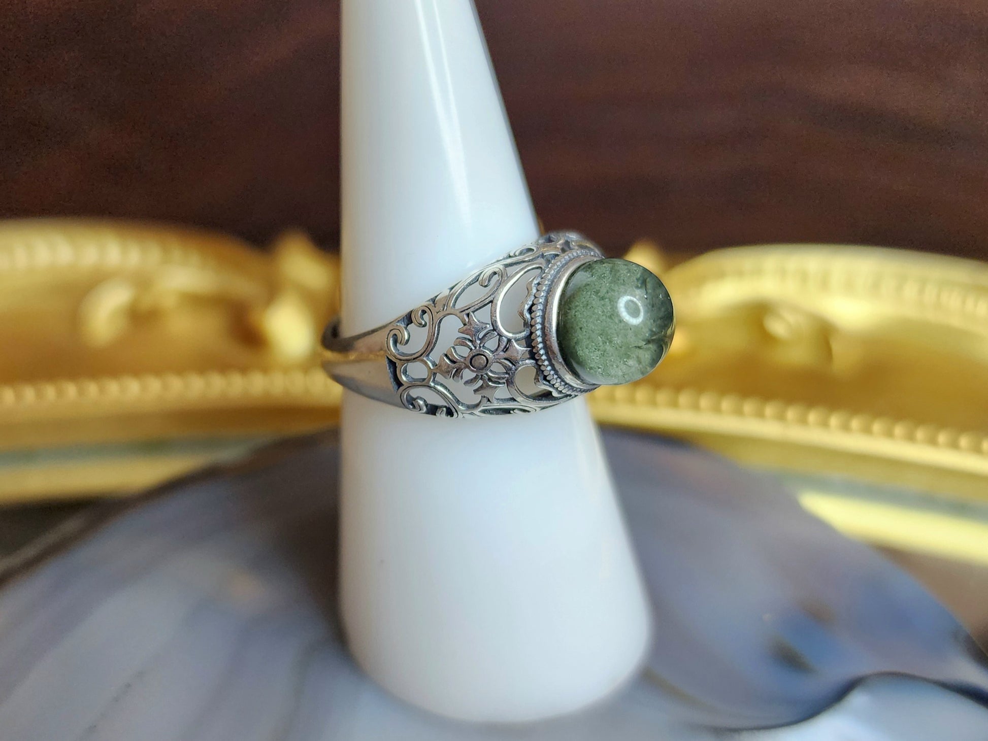 Green garden quartz mini sphere with set into an adjustable sterling silver ring with intricate details.
