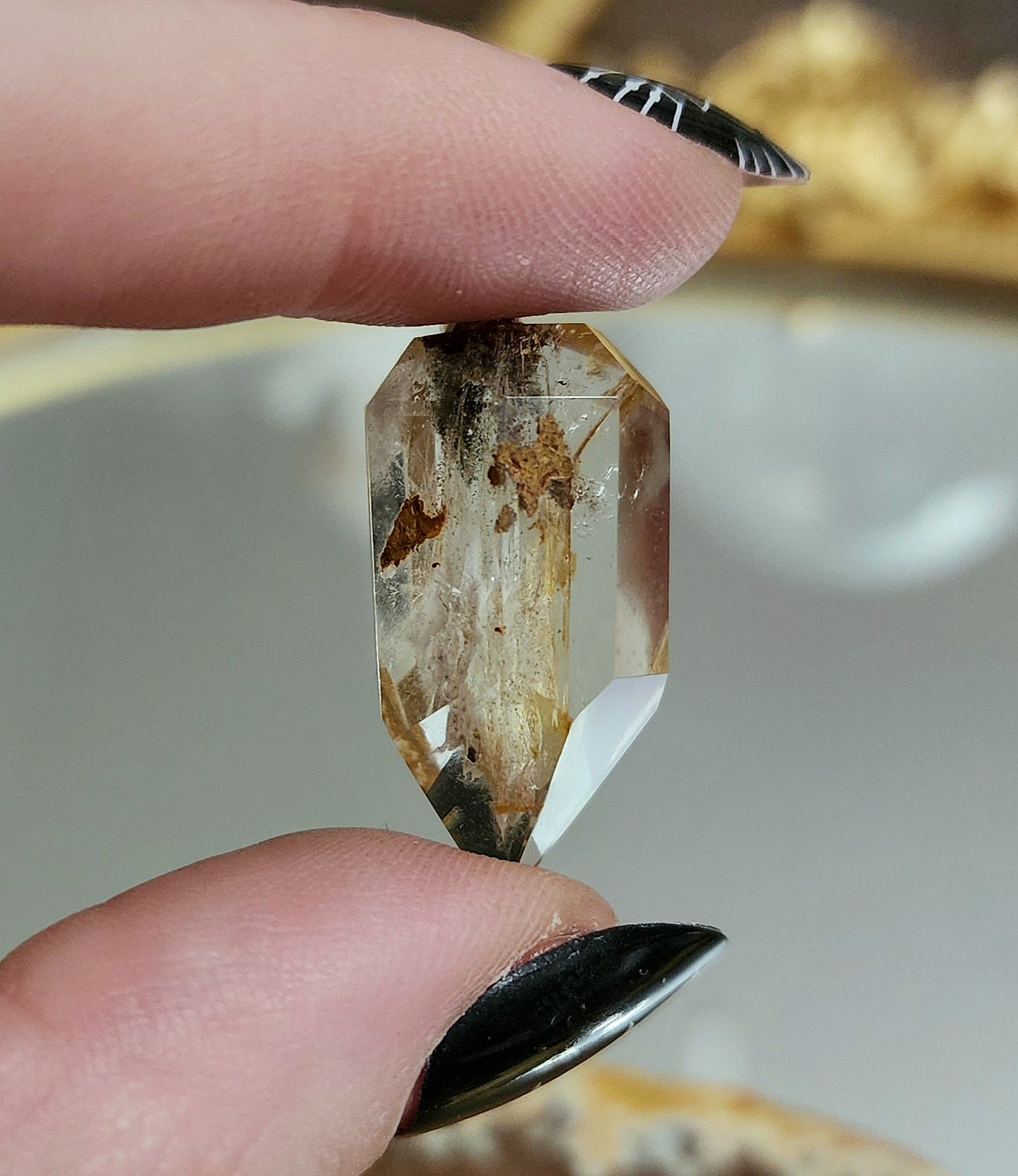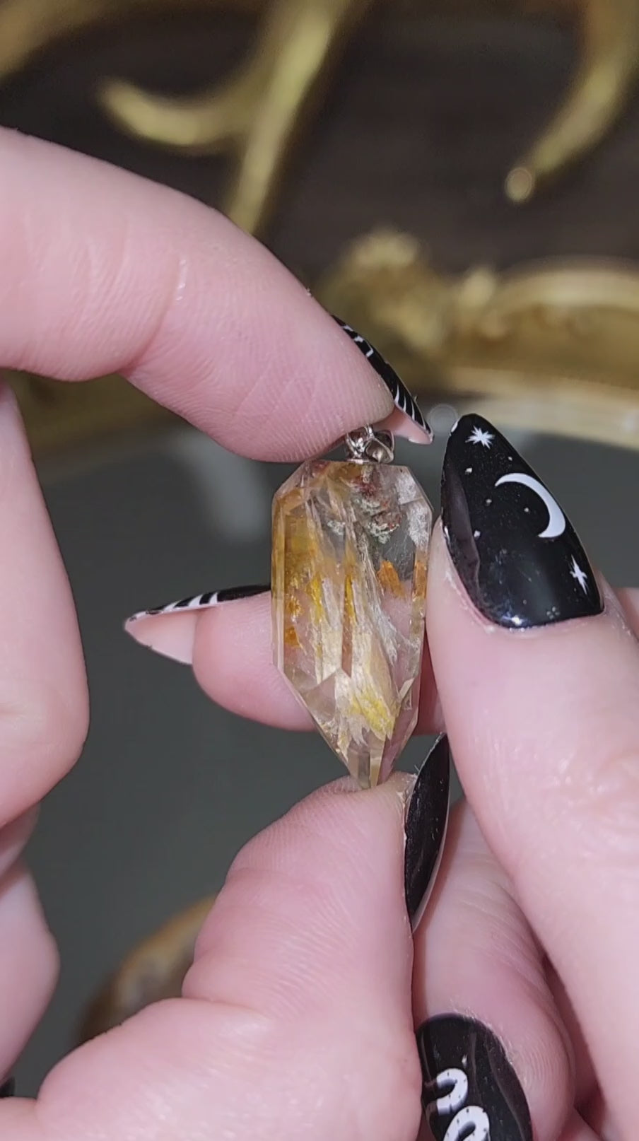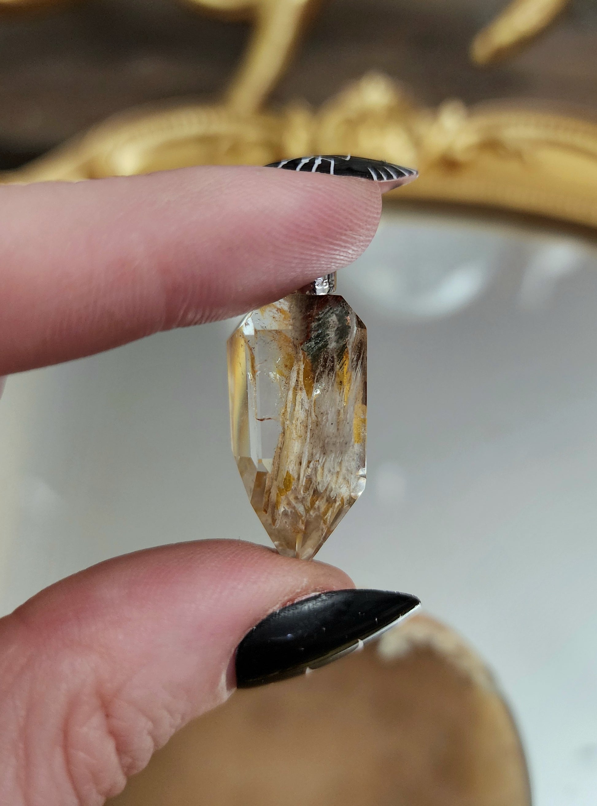 Very clear and expertly cut garden quartz (lodalite) freeform that has been set with a sterling silver pendant bail.