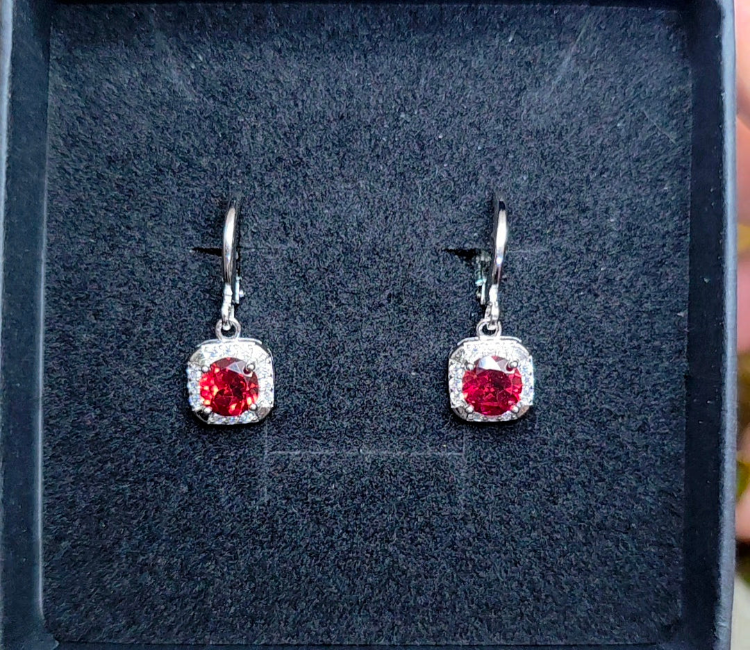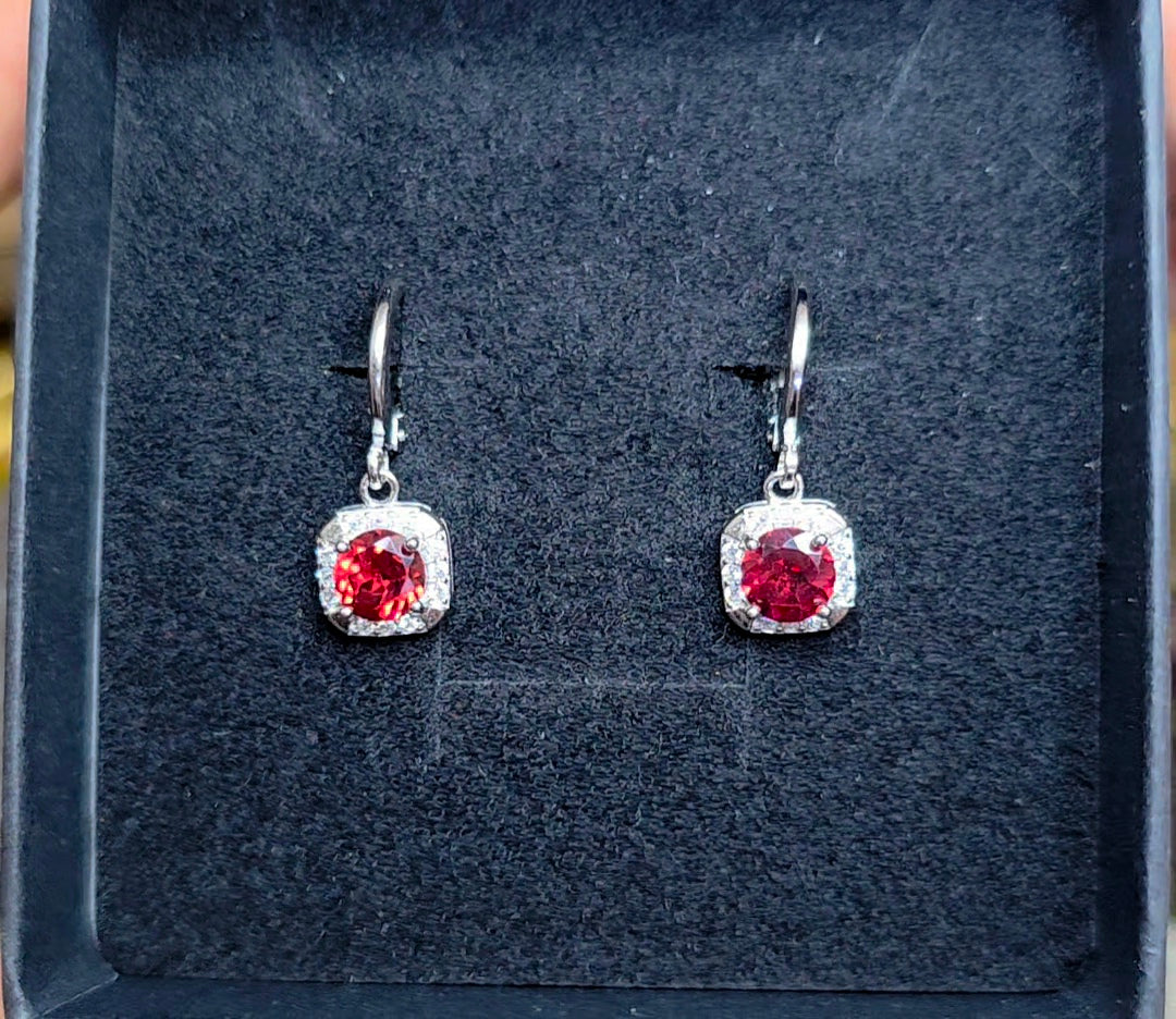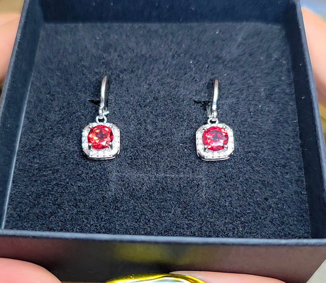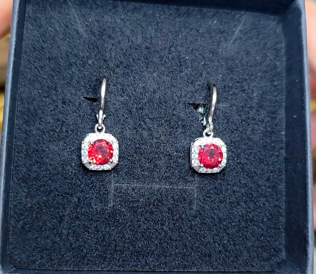 These hoop earrings feature 6mm bright red faceted garnets set into a zircon decorated sterling silver setting.