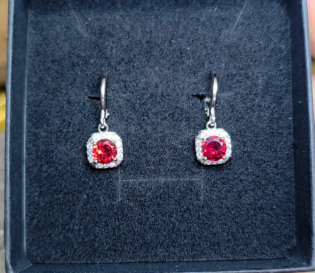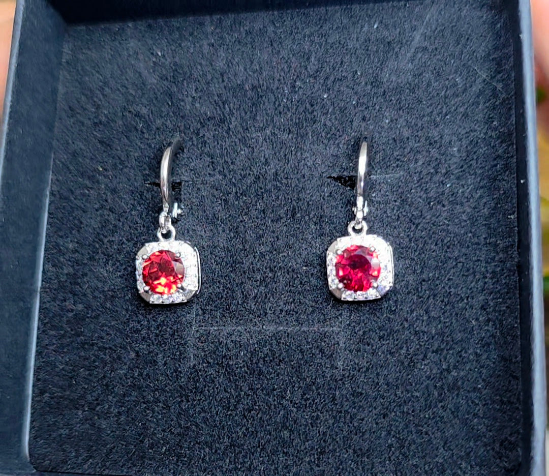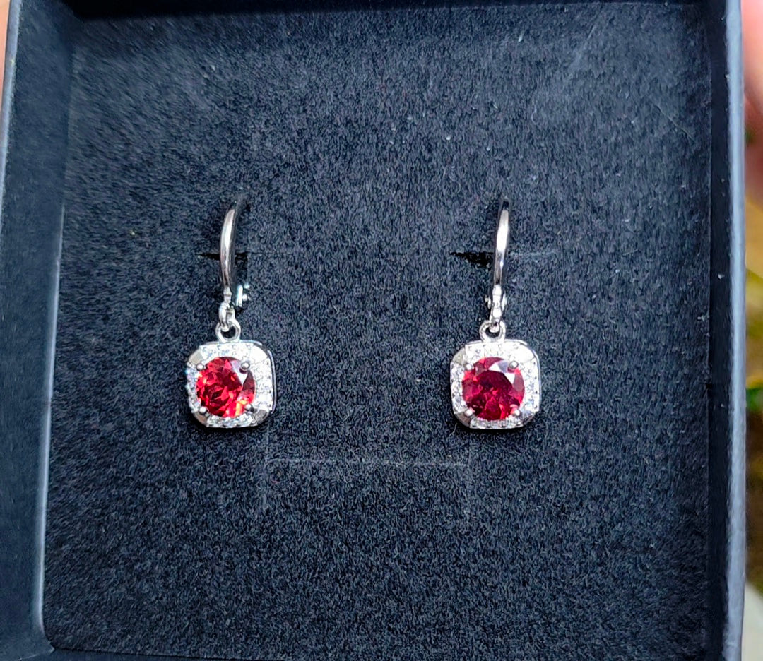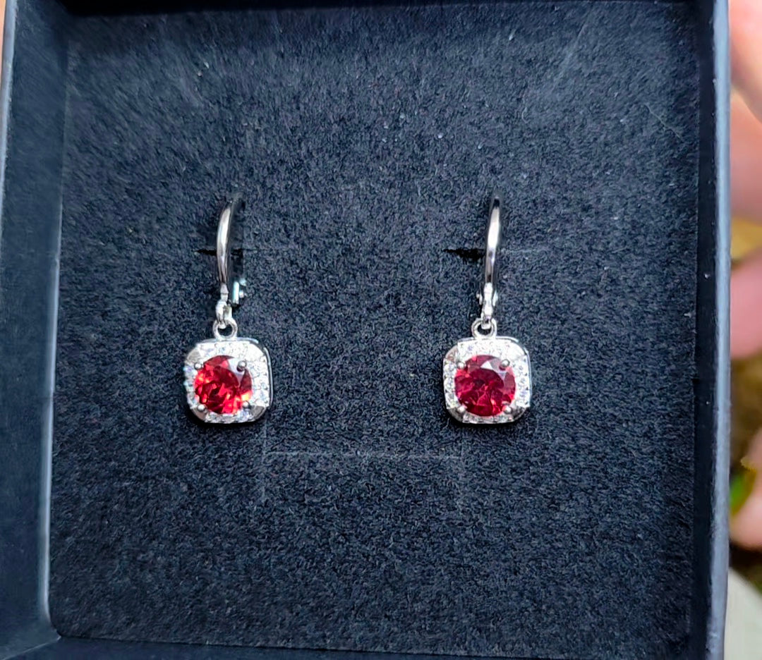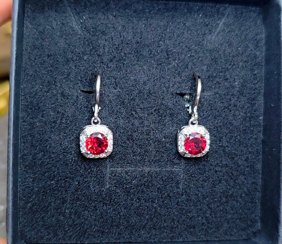 These hoop earrings feature 6mm bright red faceted garnets set into a zircon decorated sterling silver setting.