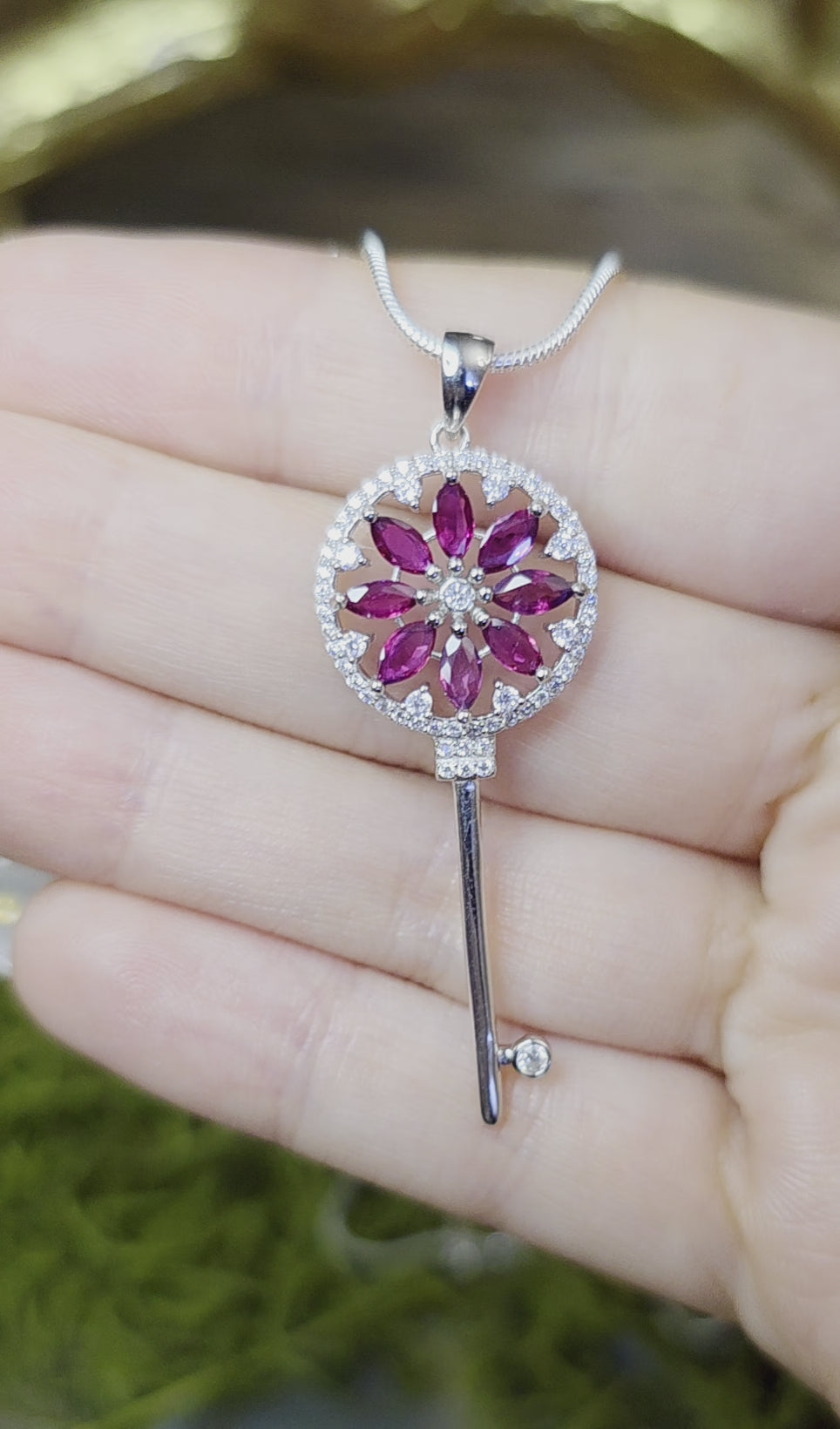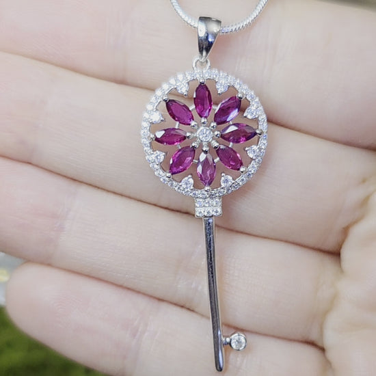 This piece features eight 5x2mm faceted garnets set into a pendant with a key design and zircon accent stones.