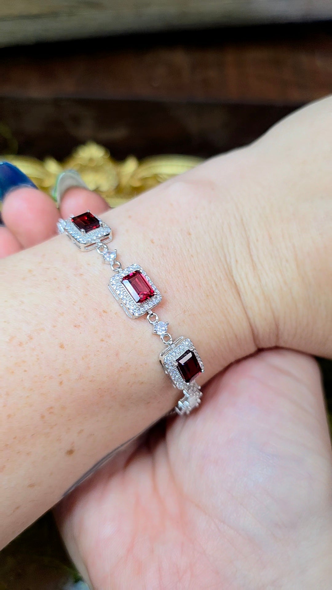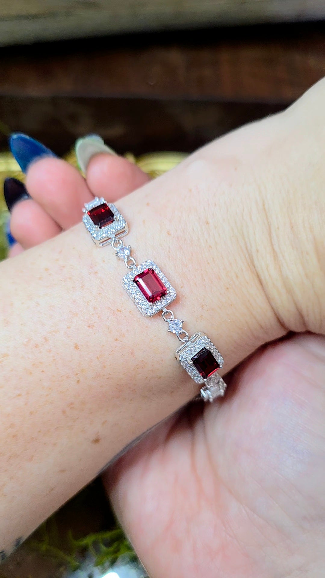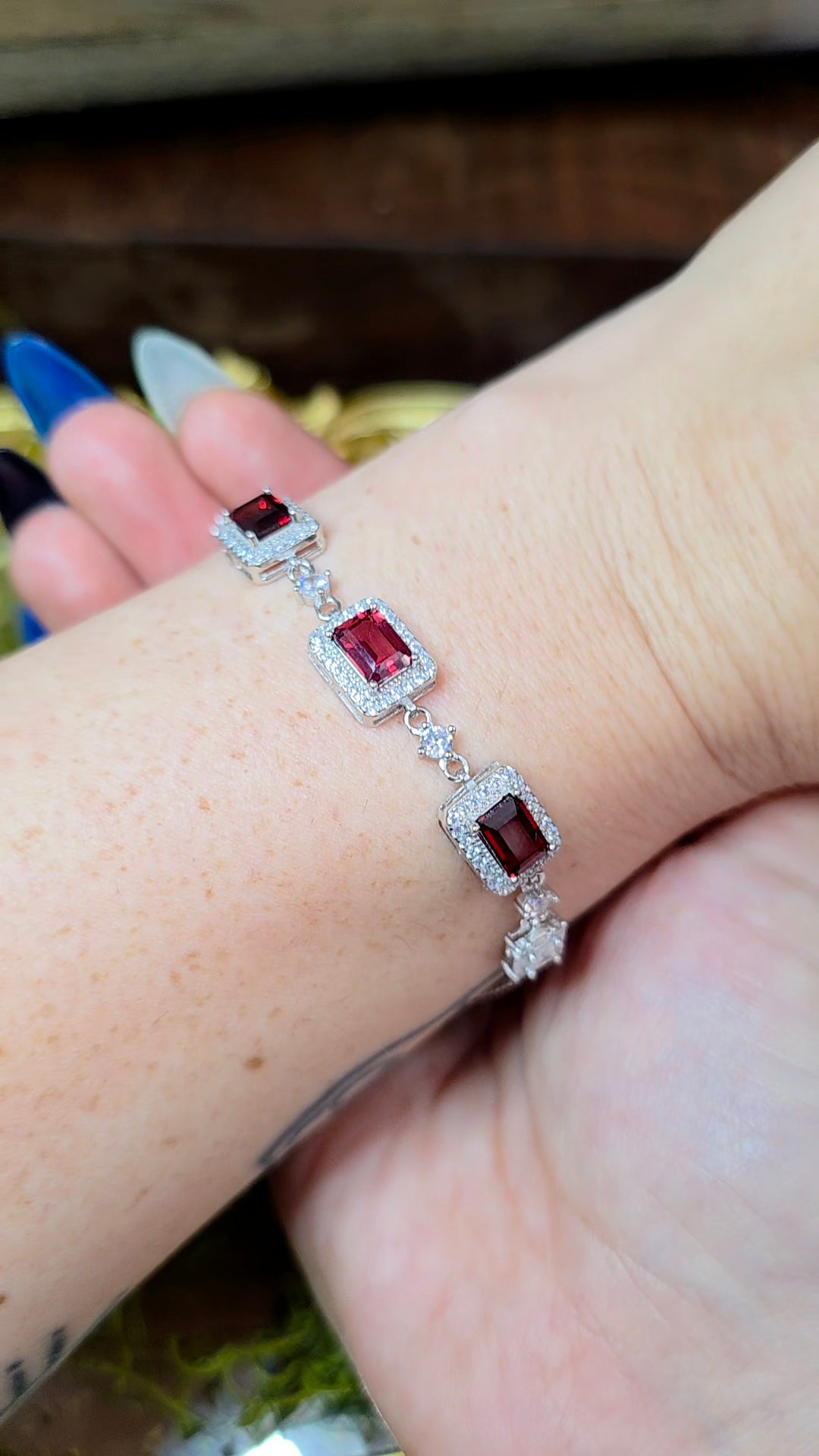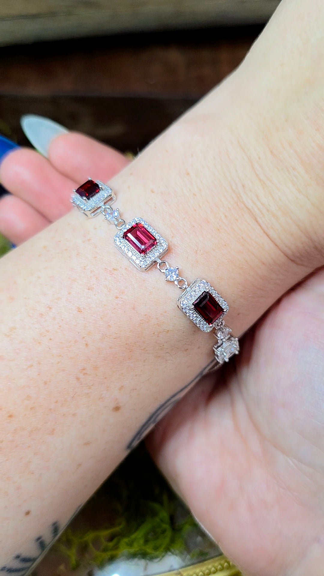 This adjustable sterling silver bracelet is about 8 inches long and features three 7x5mm high quality, faceted, garnet crystals with great color and clarity. The bracelet is also decorated with zircon accents.
