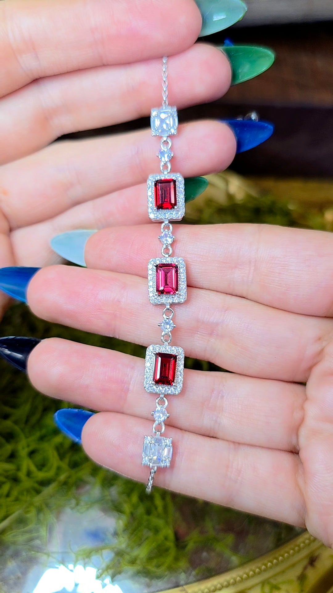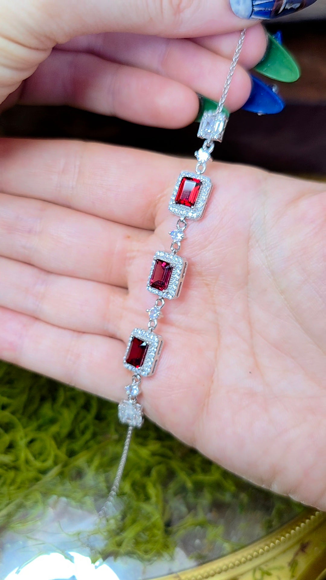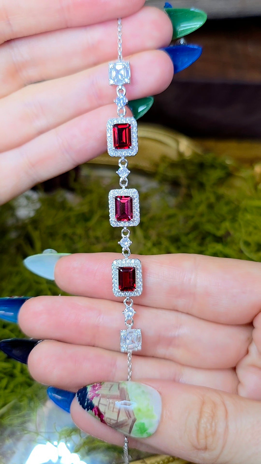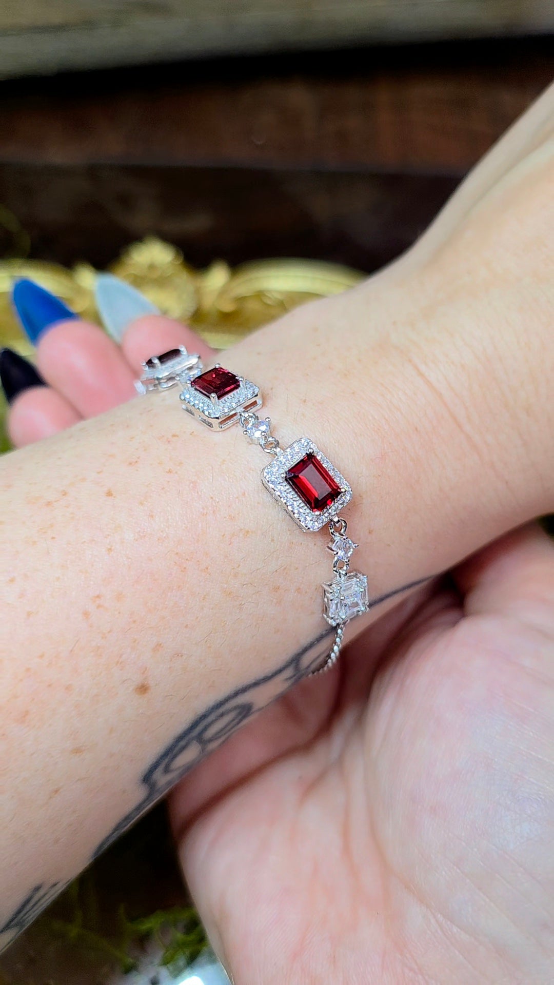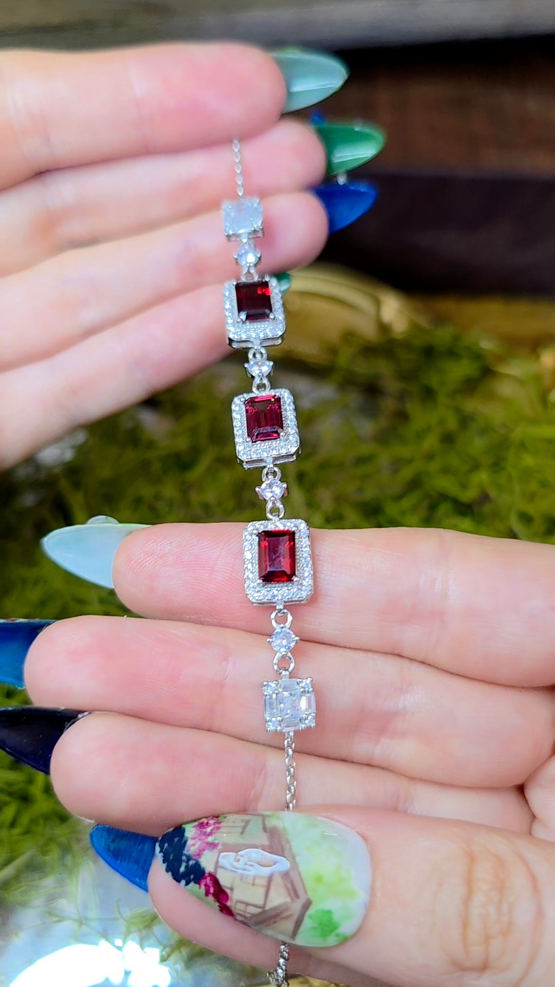 This adjustable sterling silver bracelet is about 8 inches long and features three 7x5mm high quality, faceted, garnet crystals with great color and clarity. The bracelet is also decorated with zircon accents.
