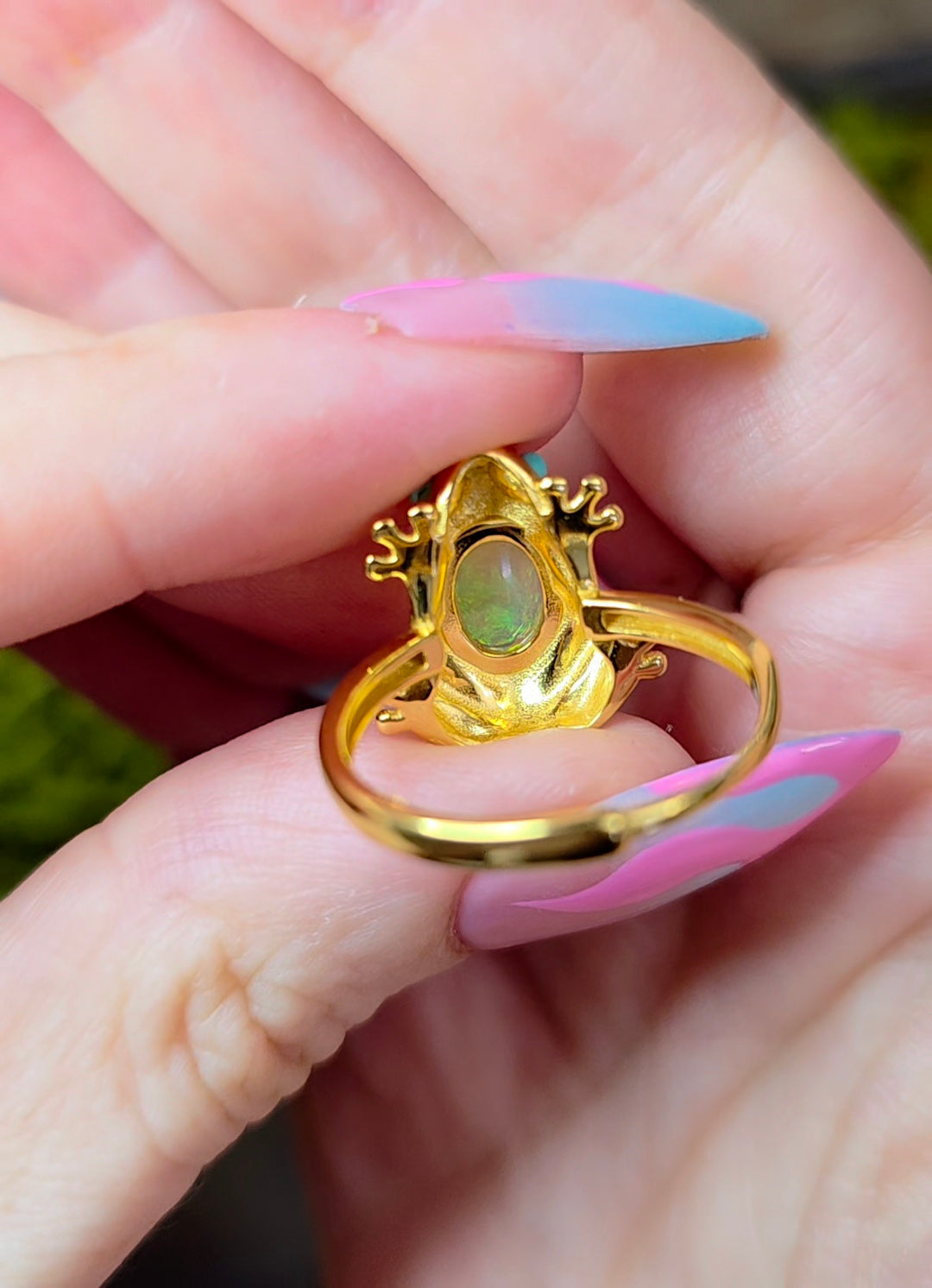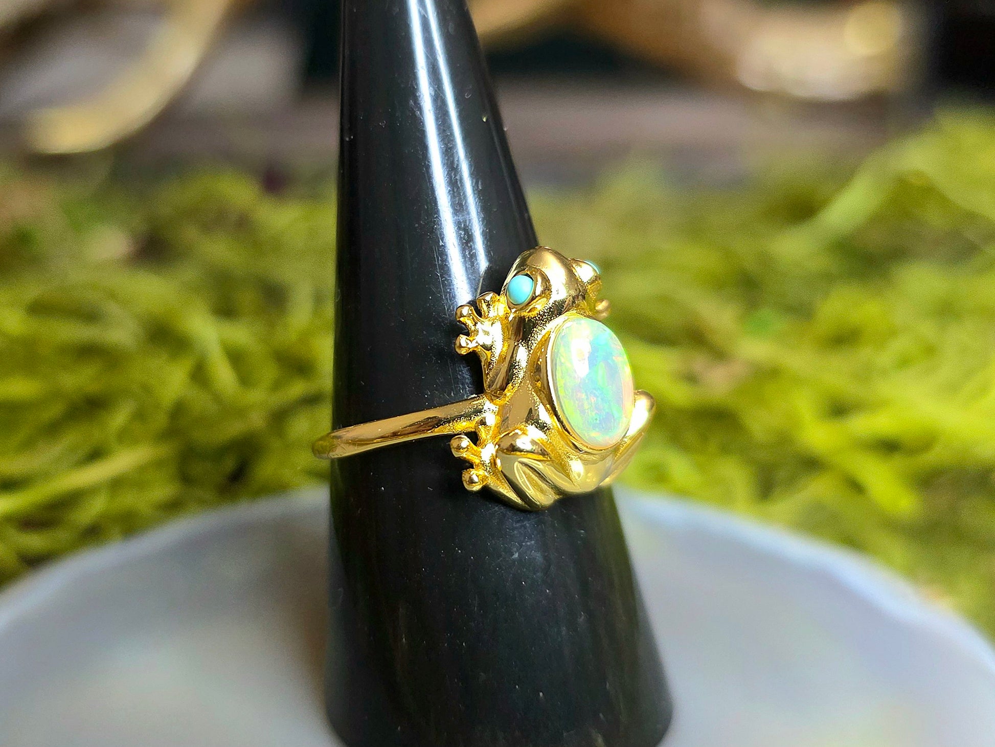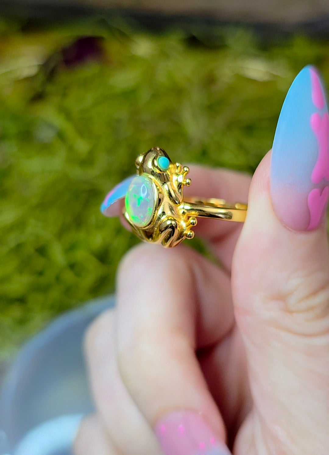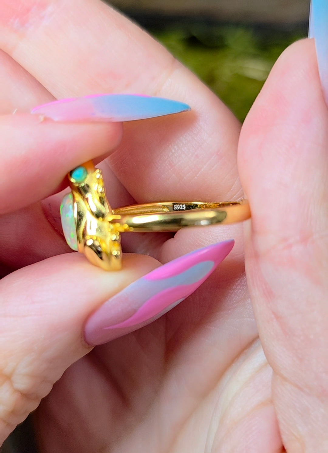 8x6mm white opal cabochon set in an adjustable sterling silver ring with a frog design and turquoise eyes.