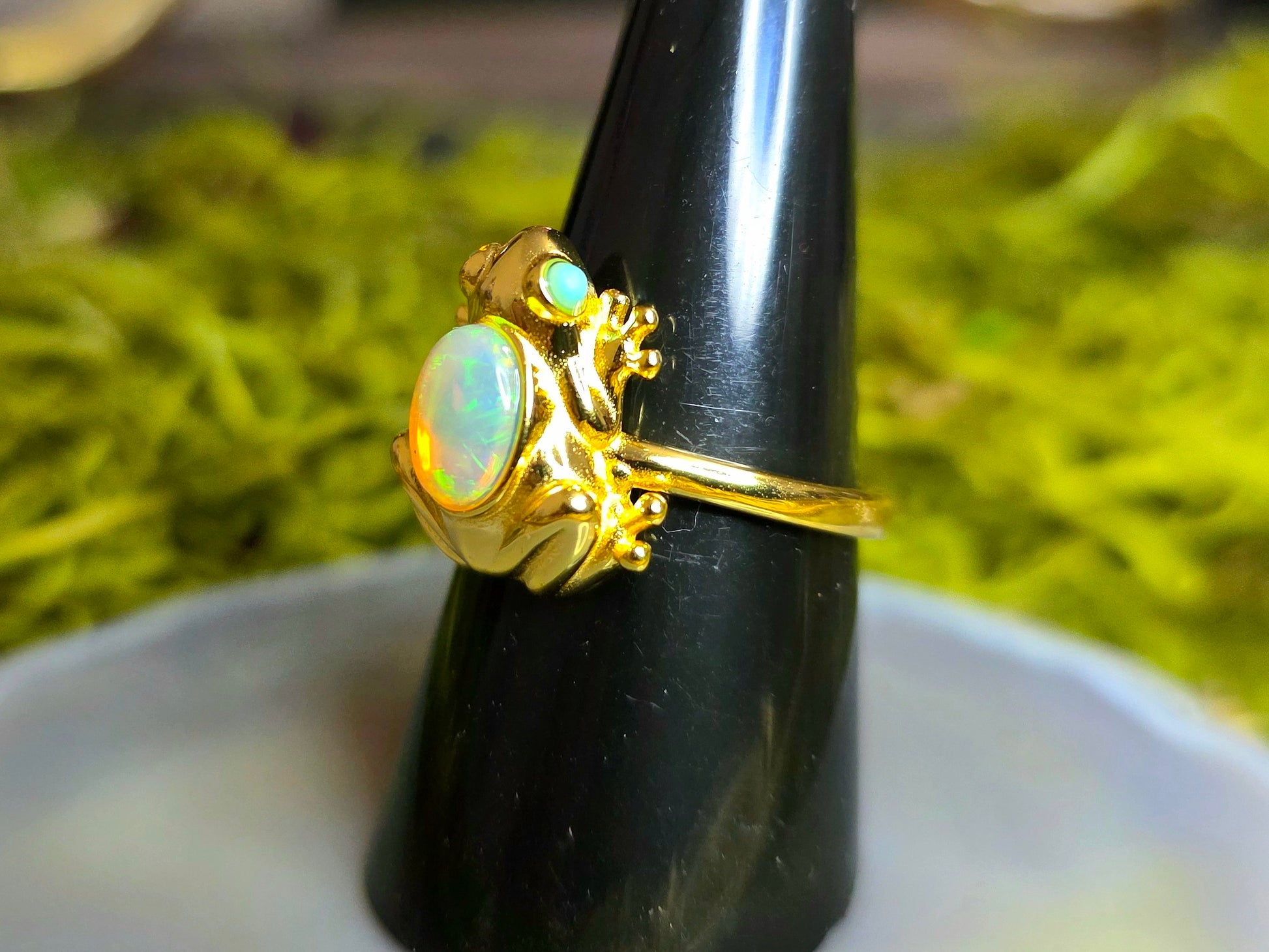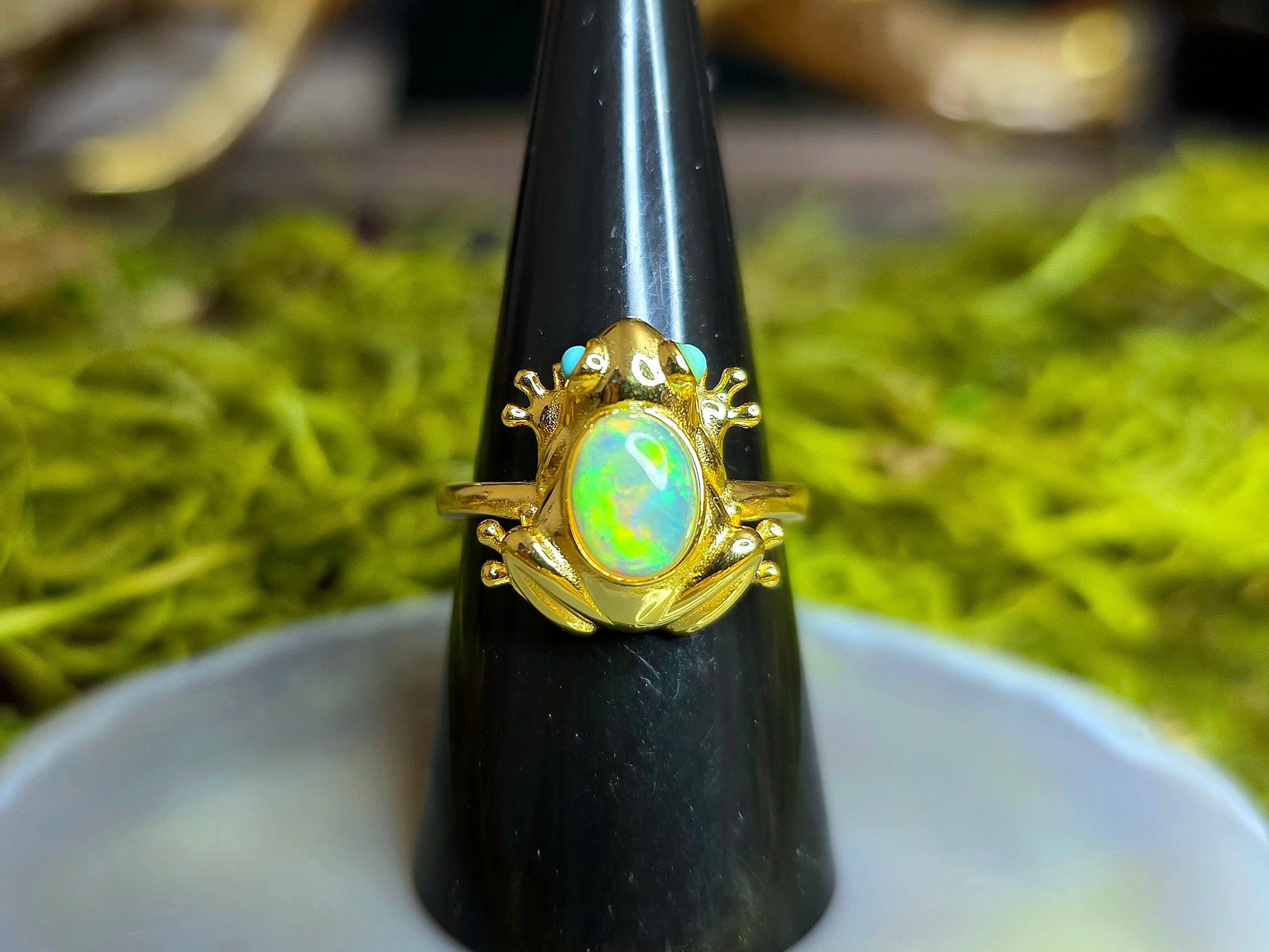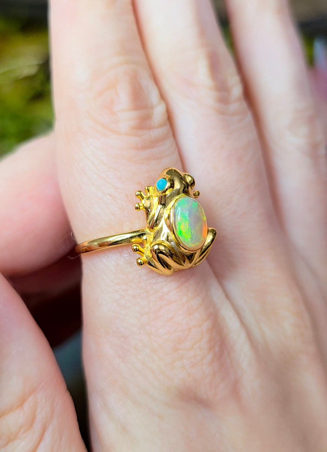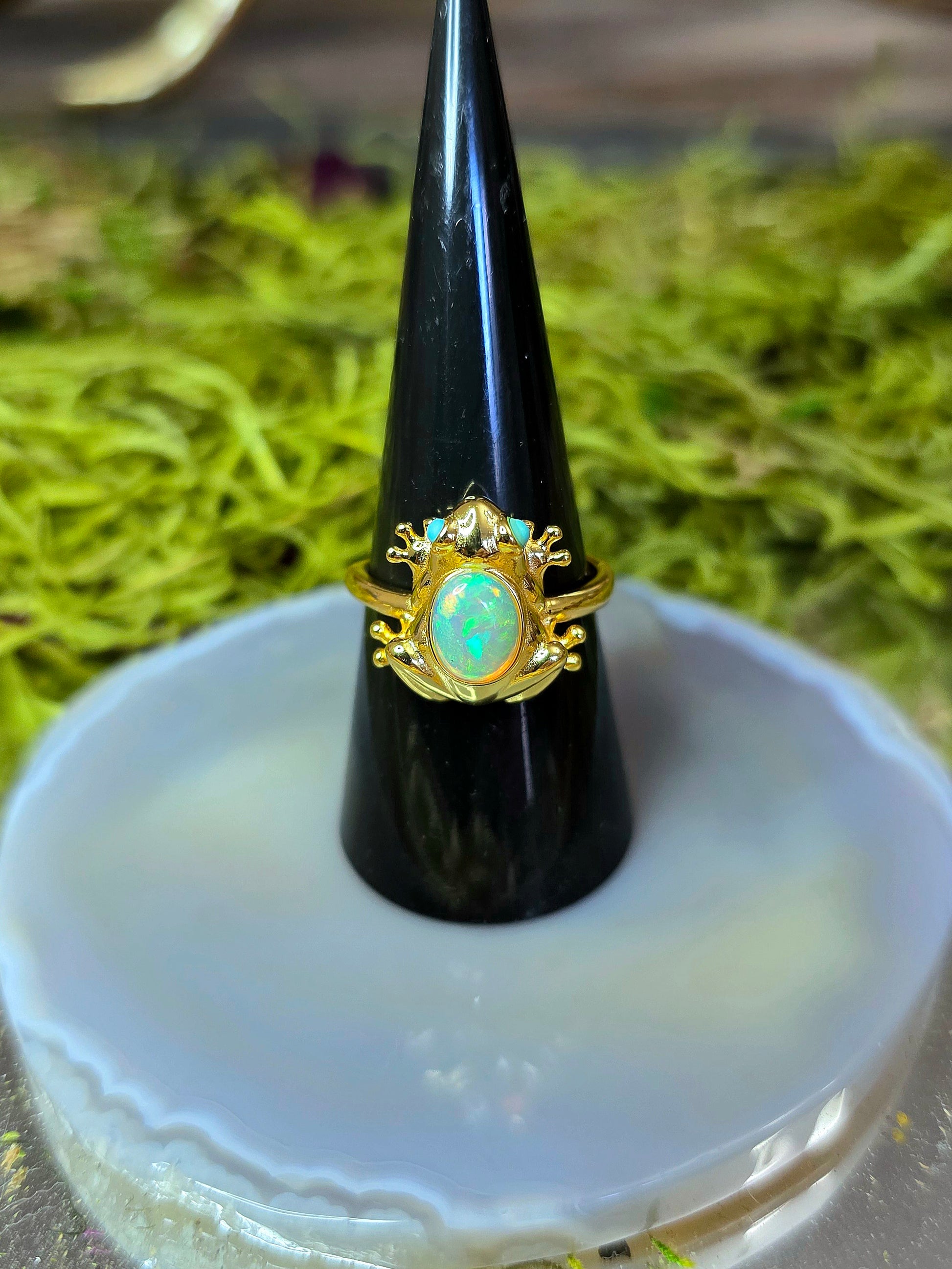 8x6mm white opal cabochon set in an adjustable sterling silver ring with a frog design and turquoise eyes.
