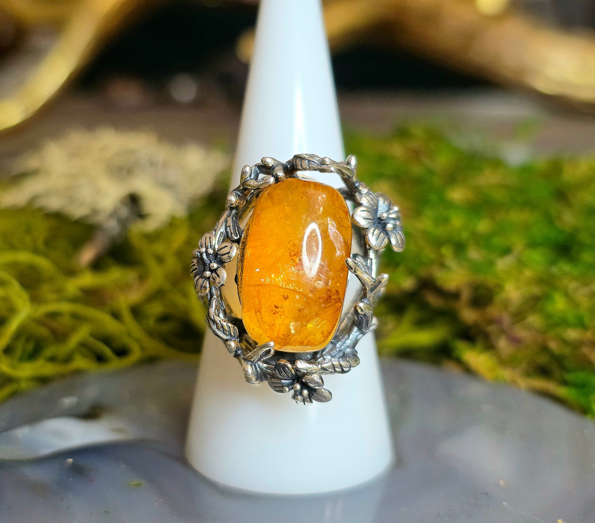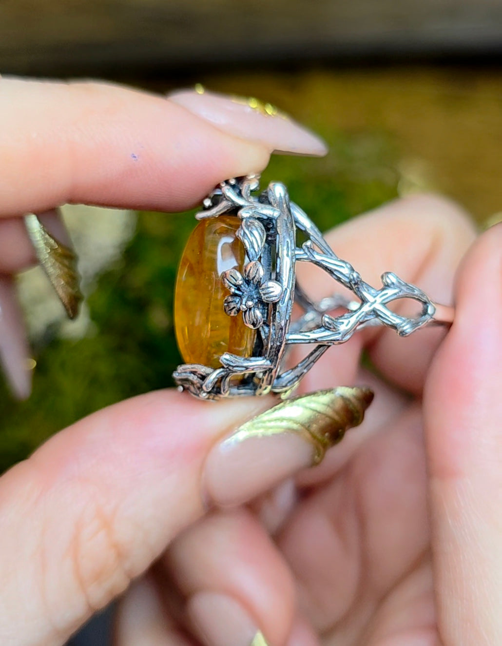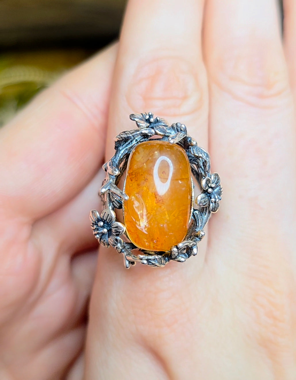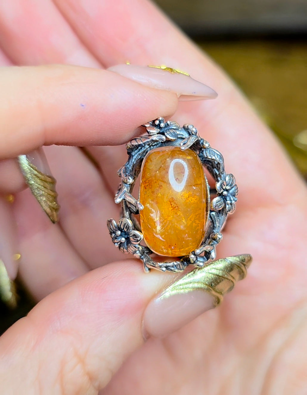 18 x 11mm flashy golden healer cabochon set into an adjustable sterling silver ring with a floral design.