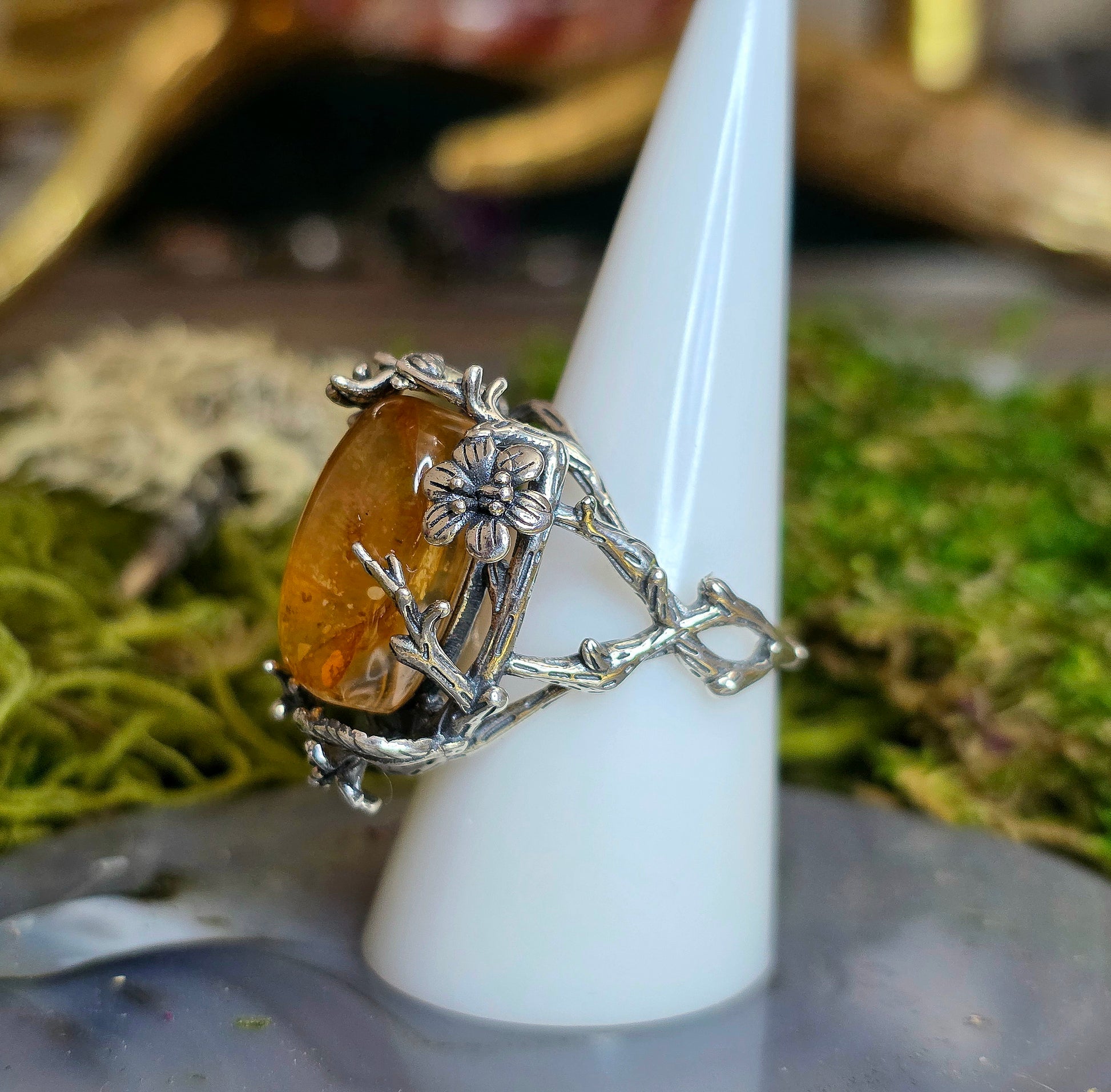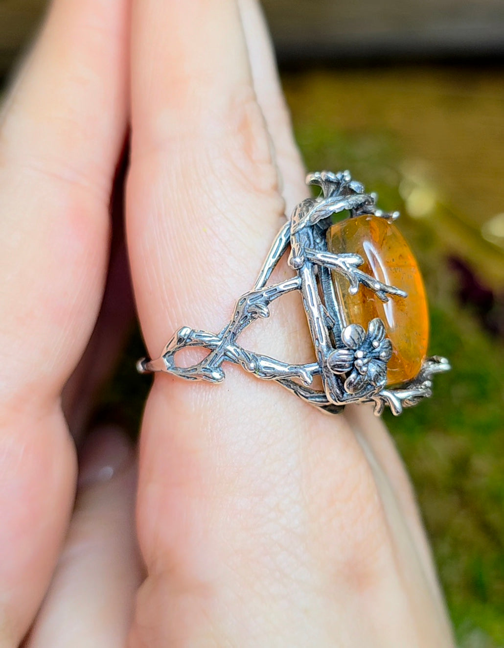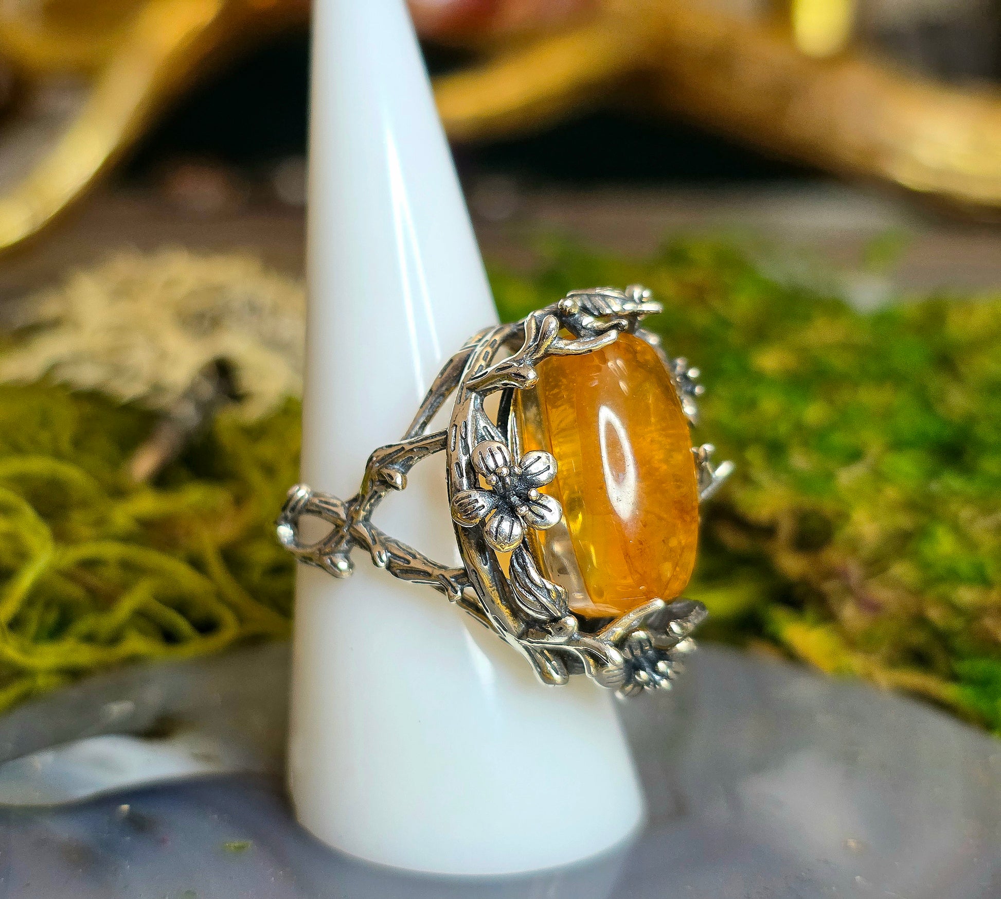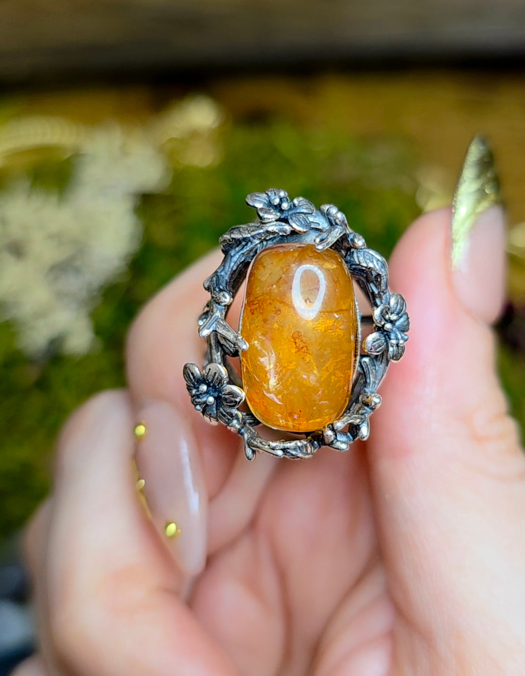 18 x 11mm flashy golden healer cabochon set into an adjustable sterling silver ring with a floral design.
