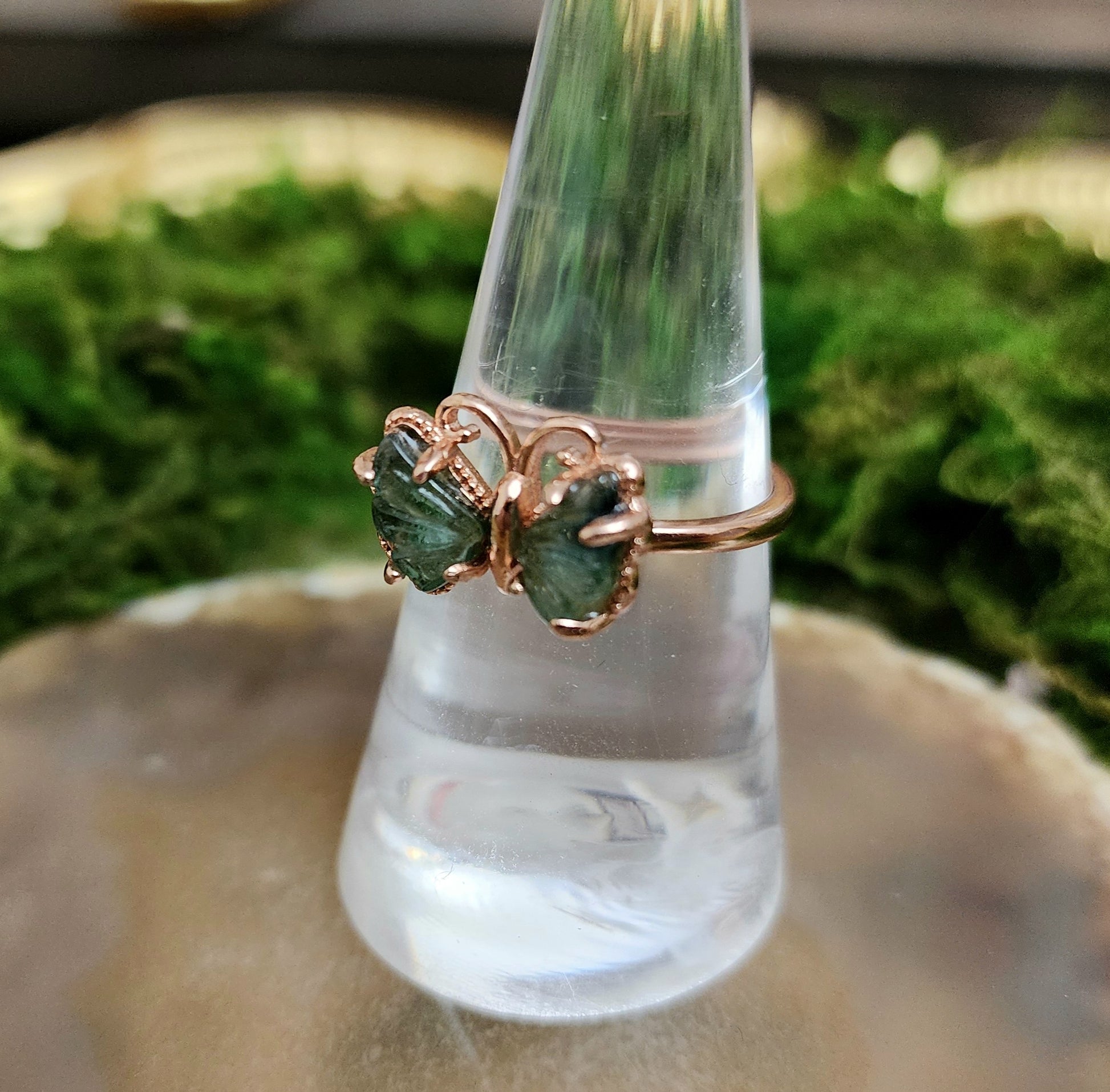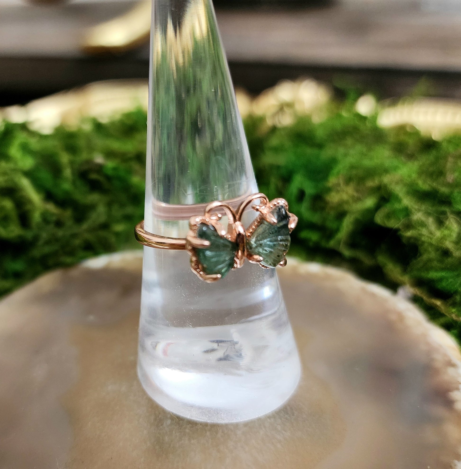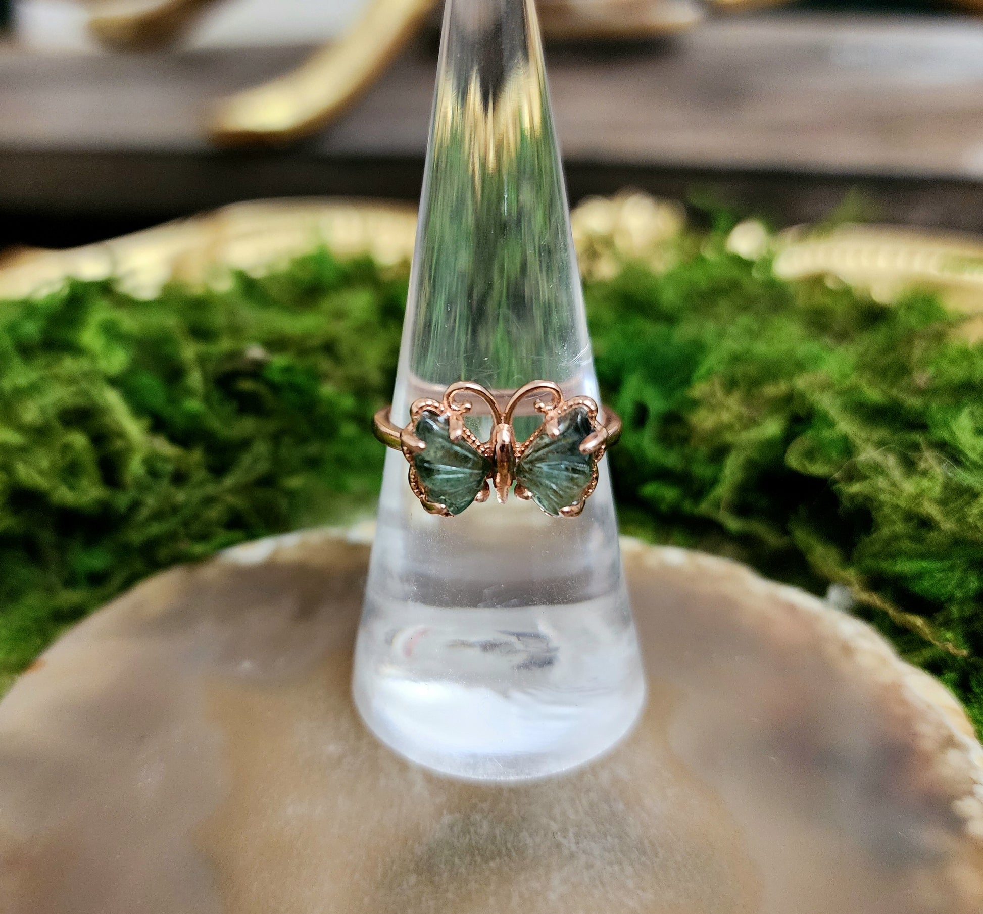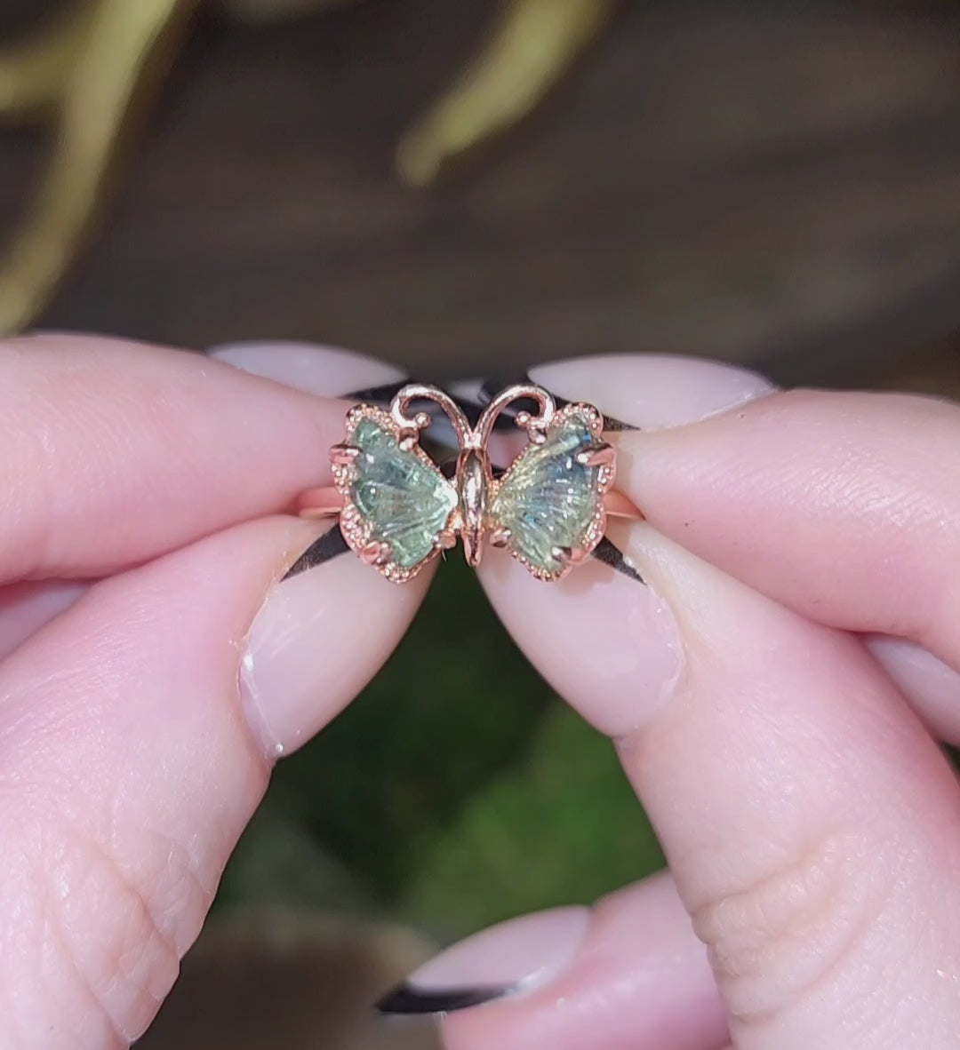 Green and blue tourmaline carved into butterfly wings and set into a rose gold plated adjustable sterling silver ring