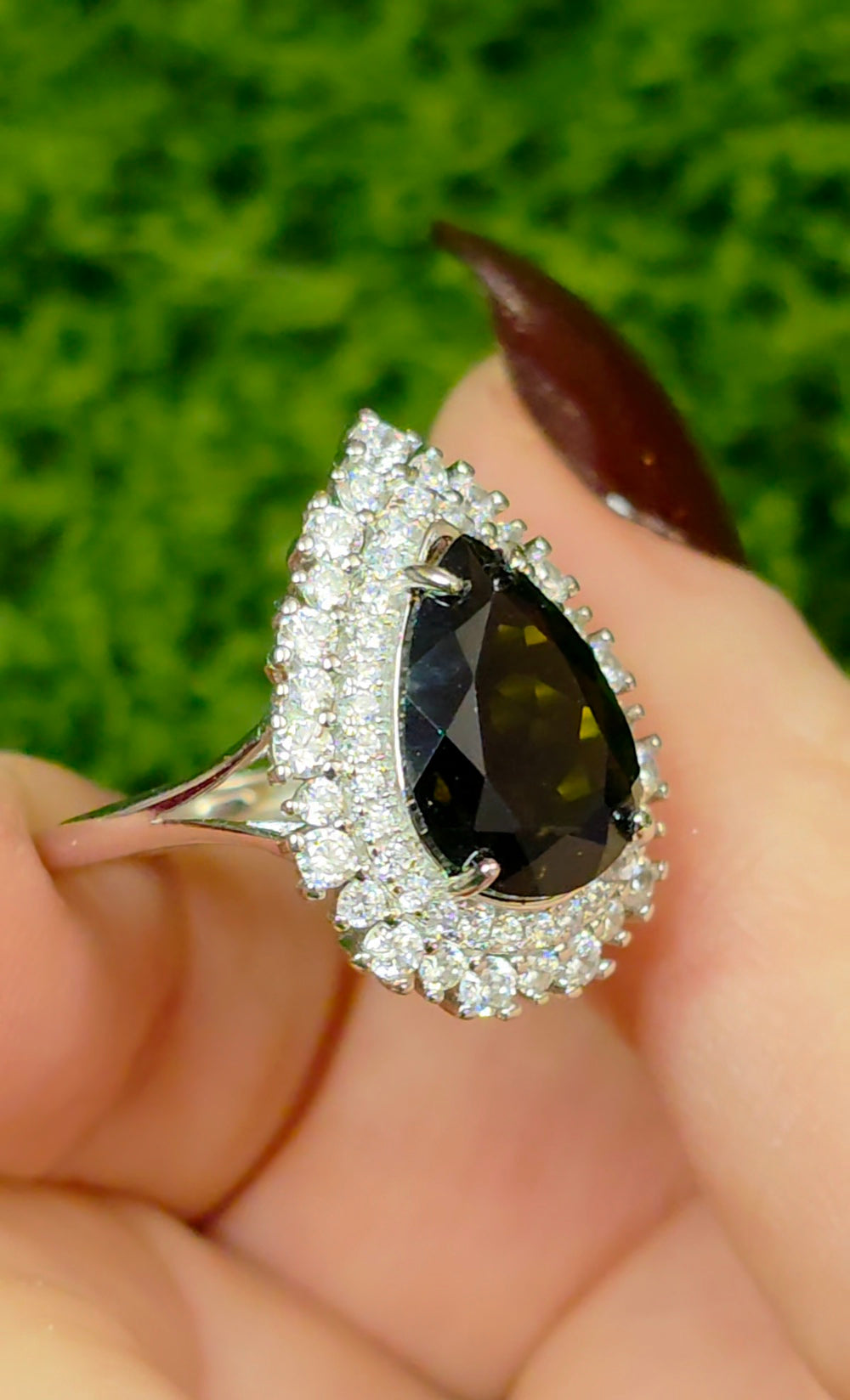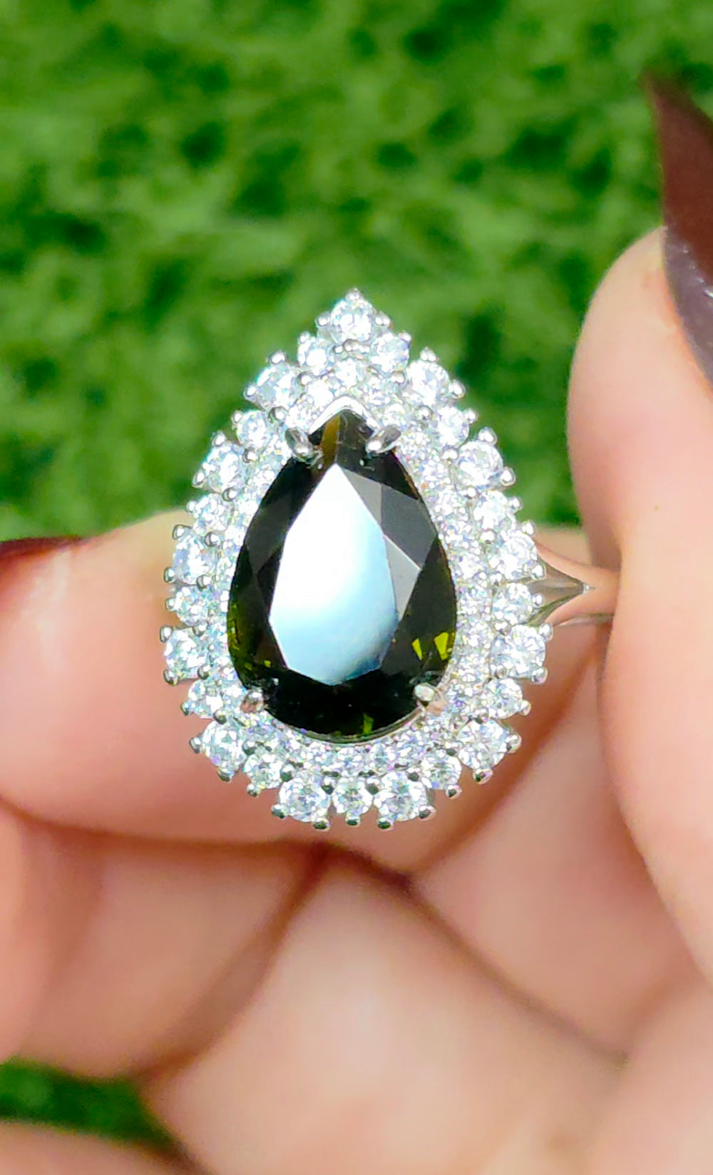 13 x 9mm faceted deep Green Tourmaline set into an adjustable sterling silver ring with many zircon accents.