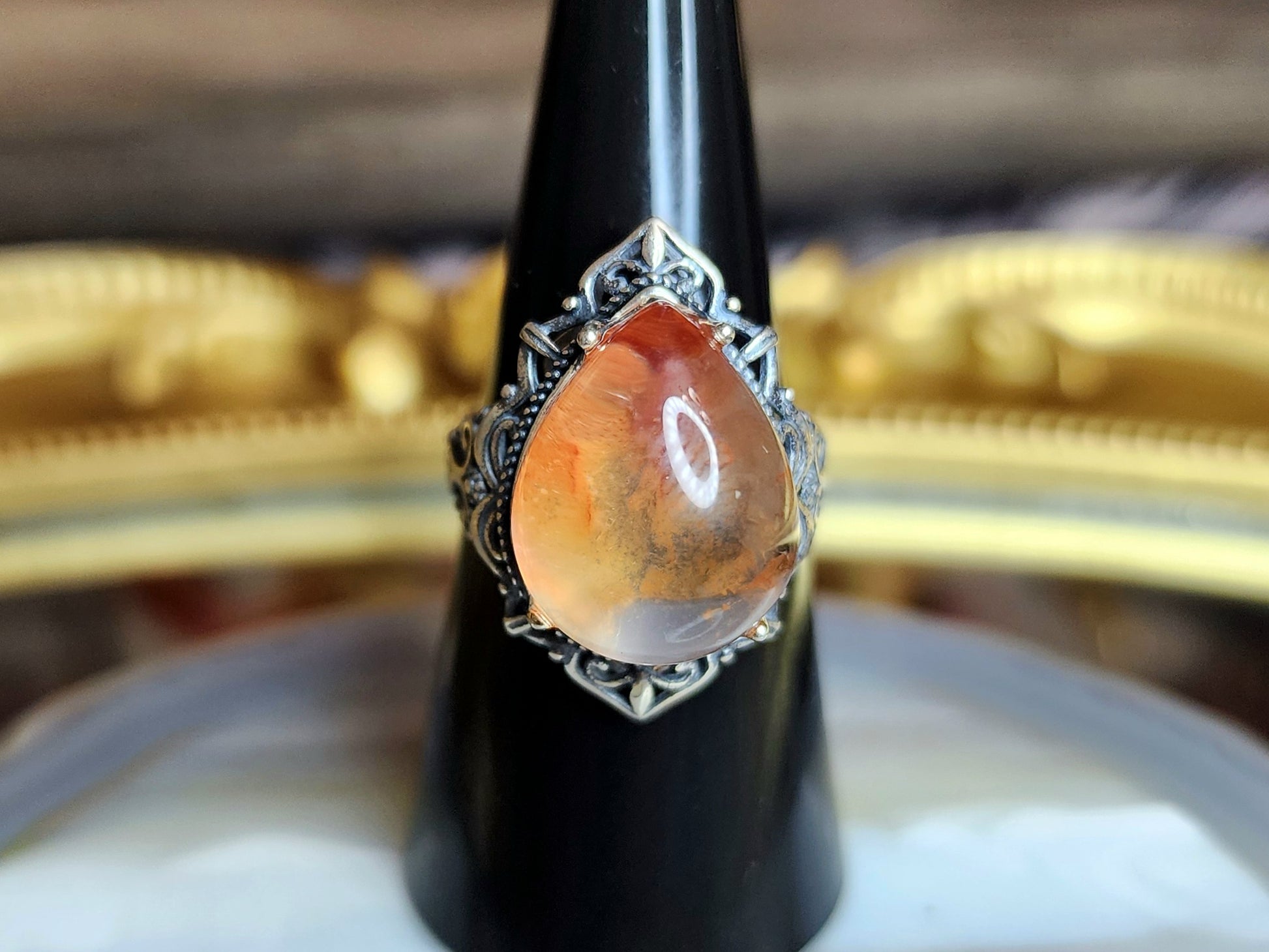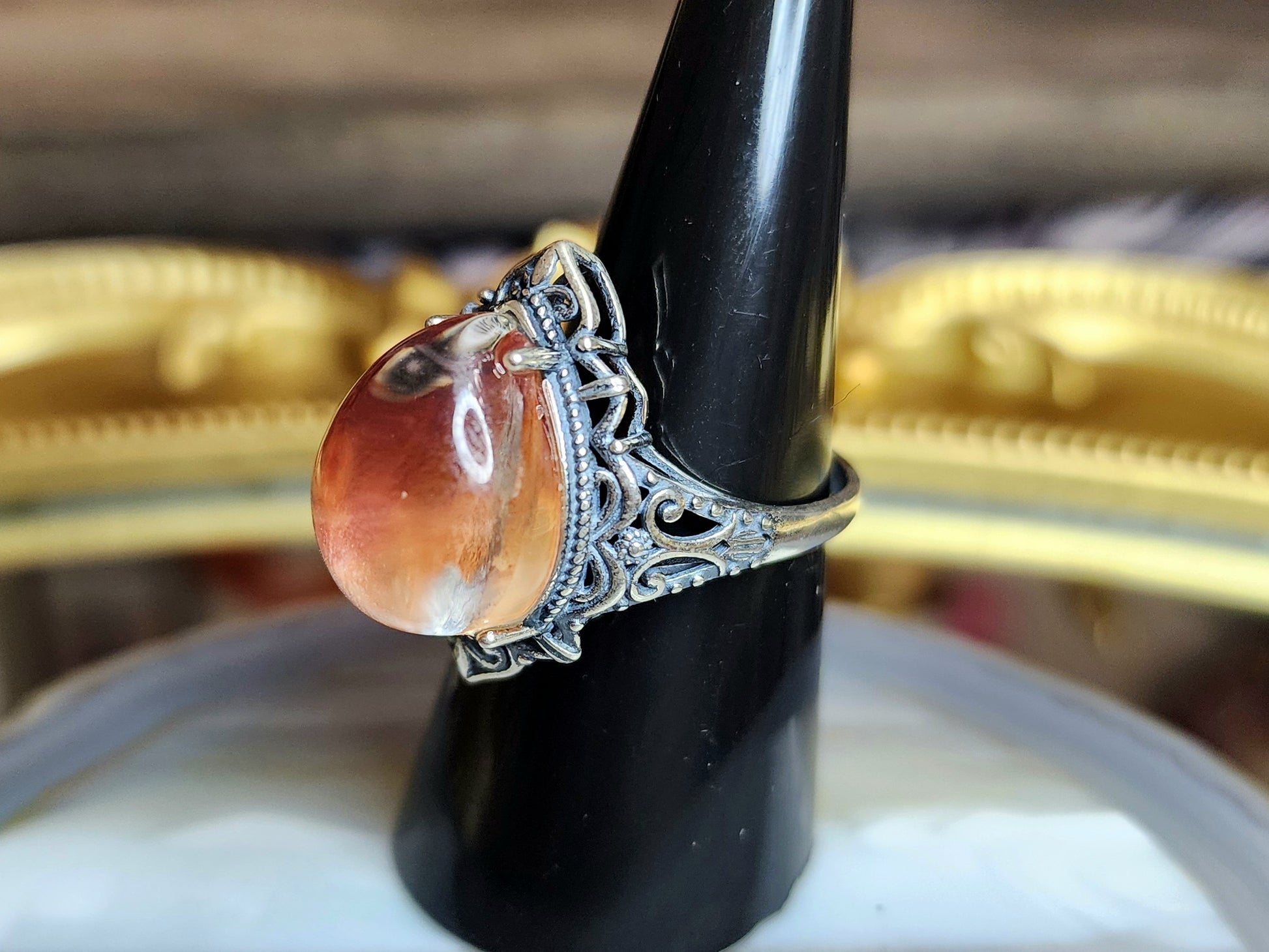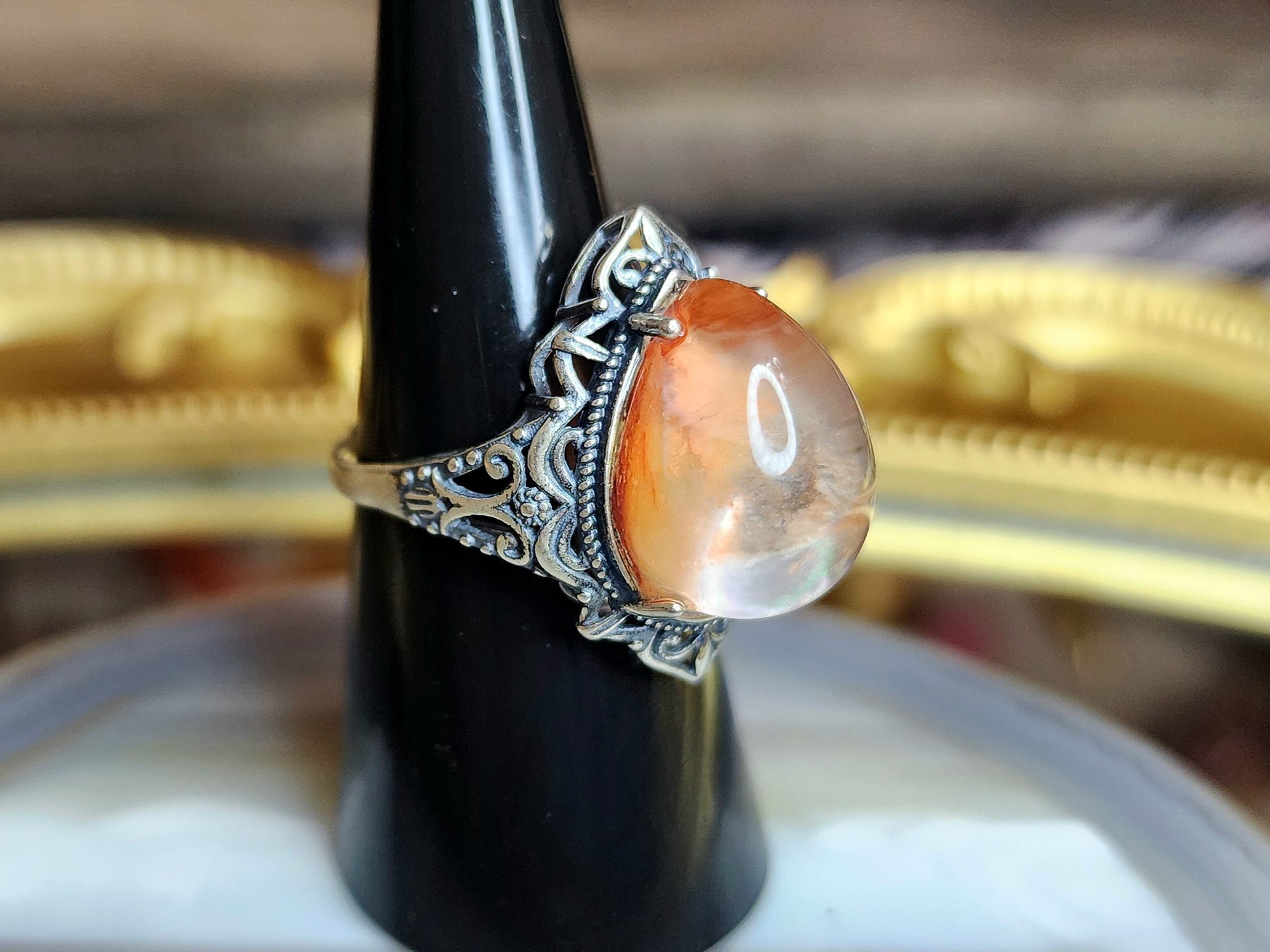 Flashy fire quartz mini sphere set into an adjustable sterling silver ring with floral decorations.