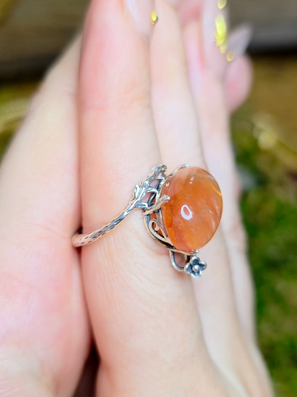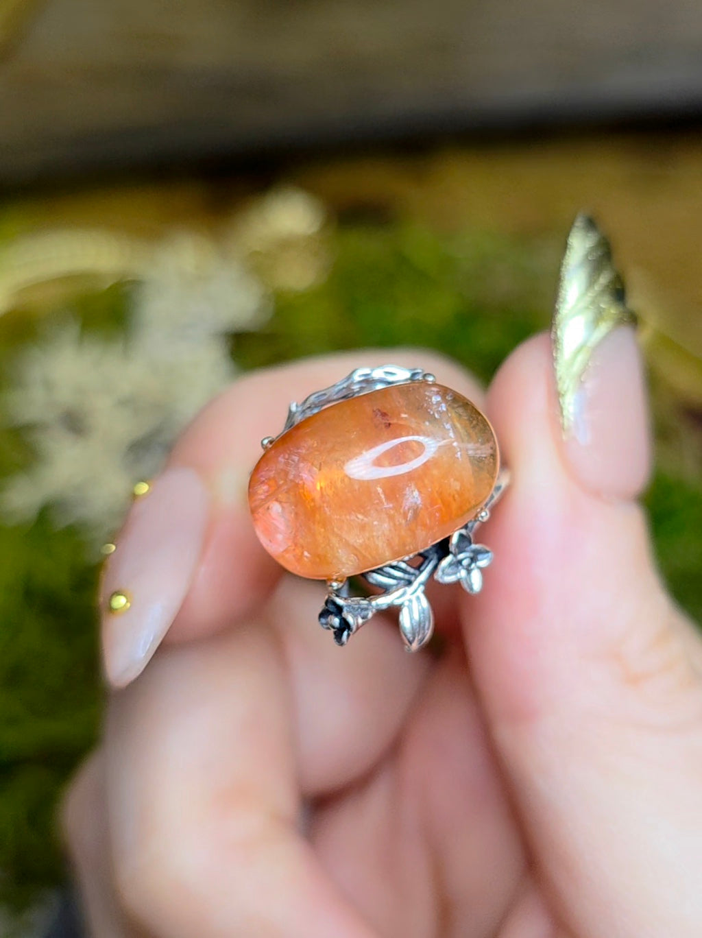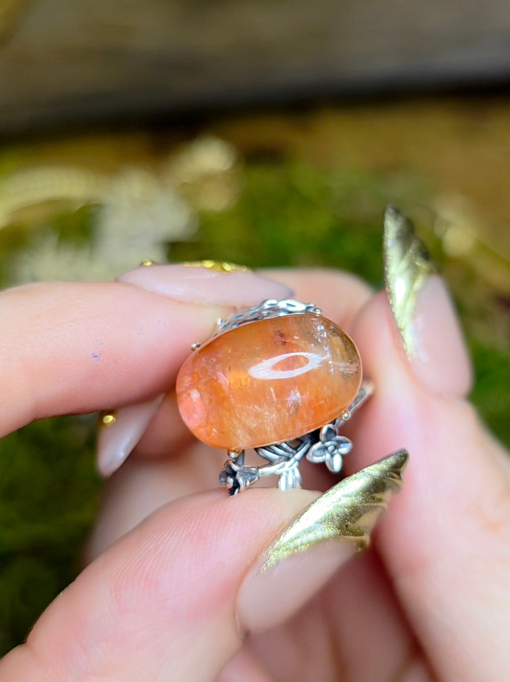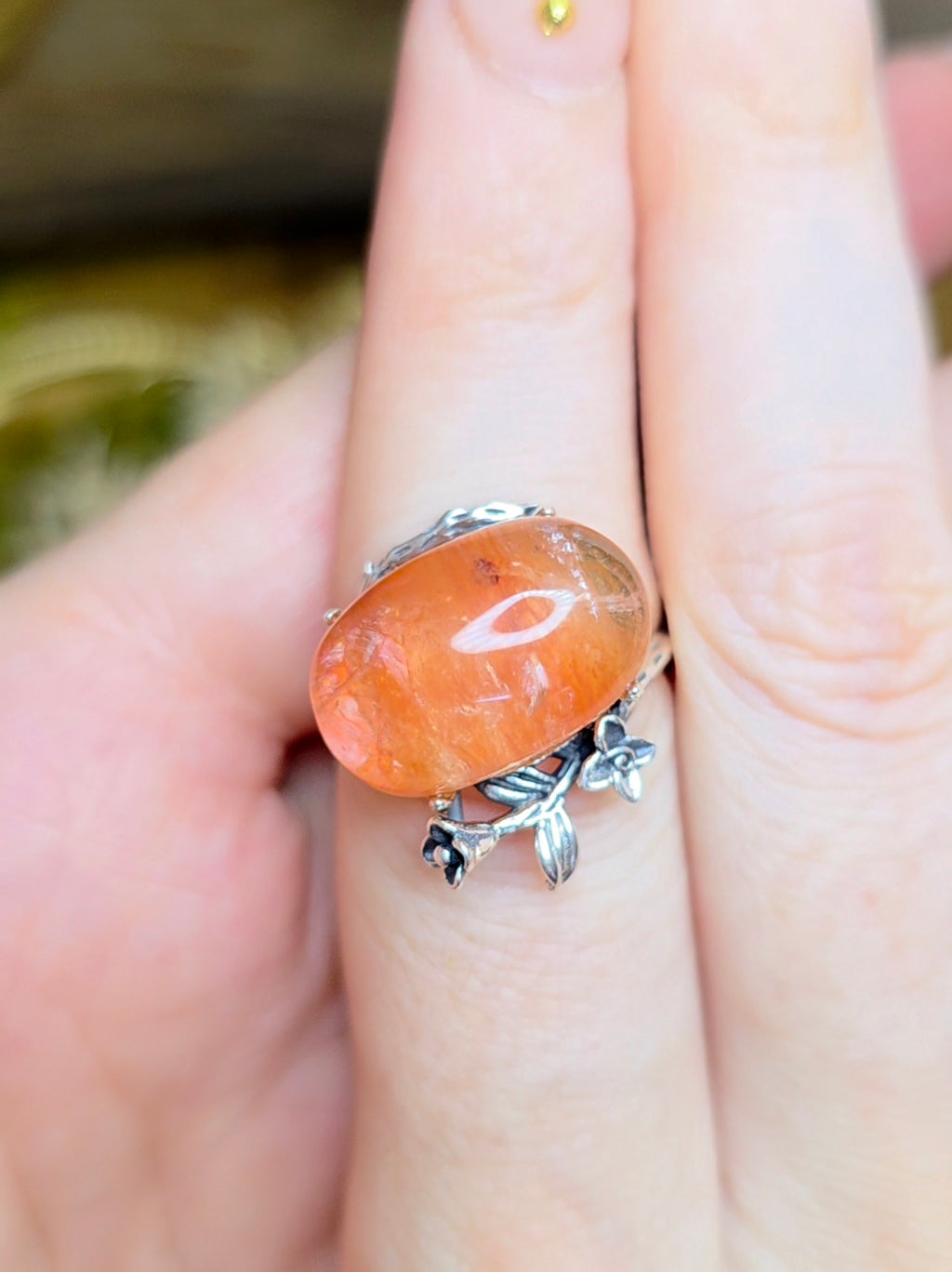 17 x 11mm flashy fire quartz cabochon set into an adjustable sterling silver ring with a floral design.