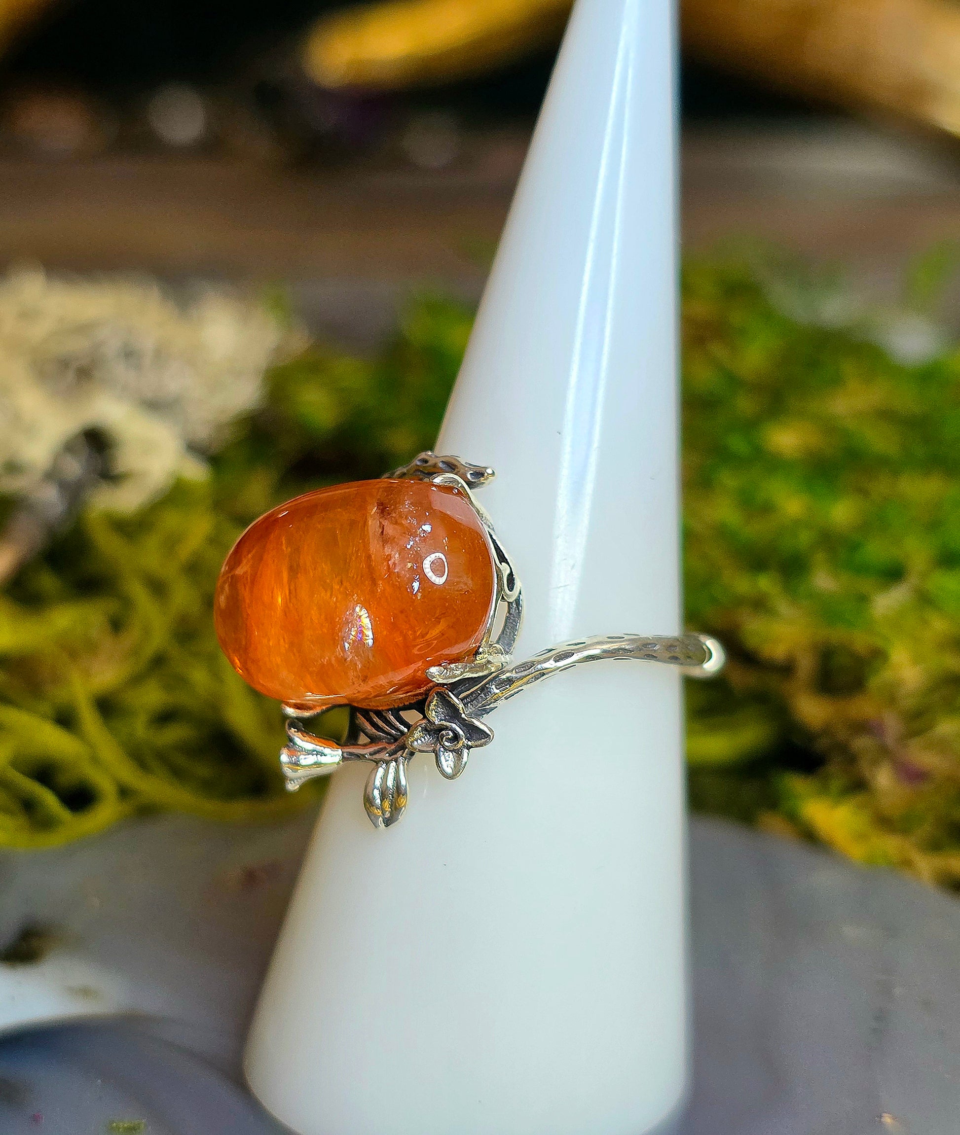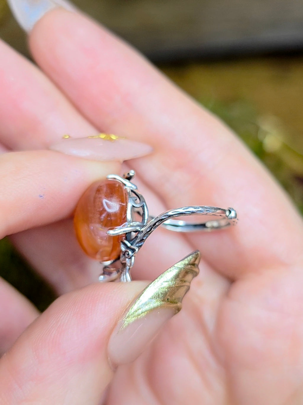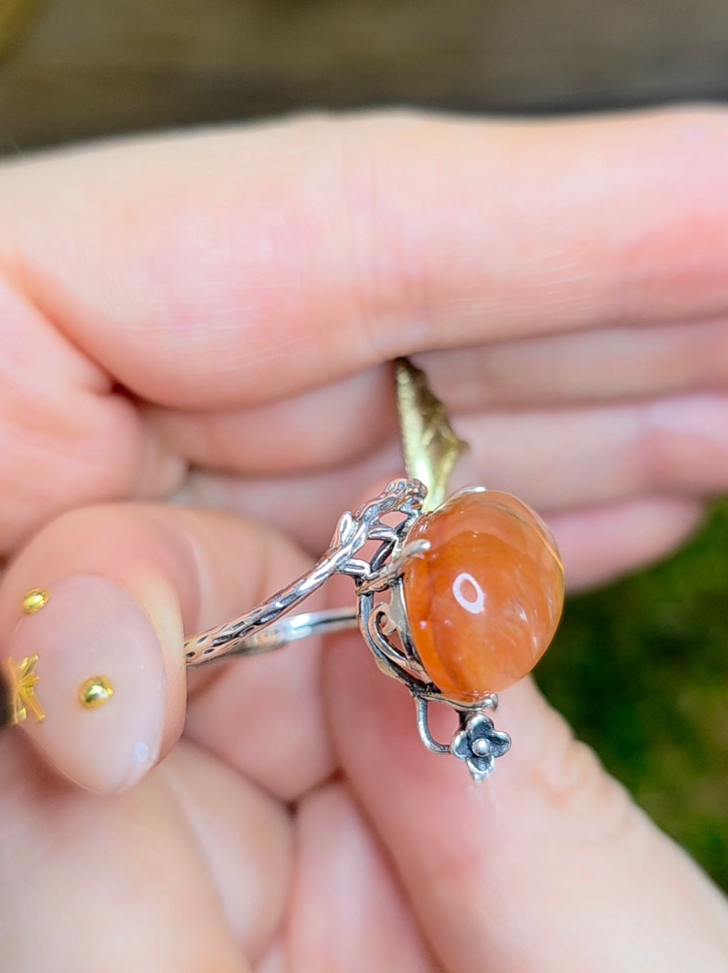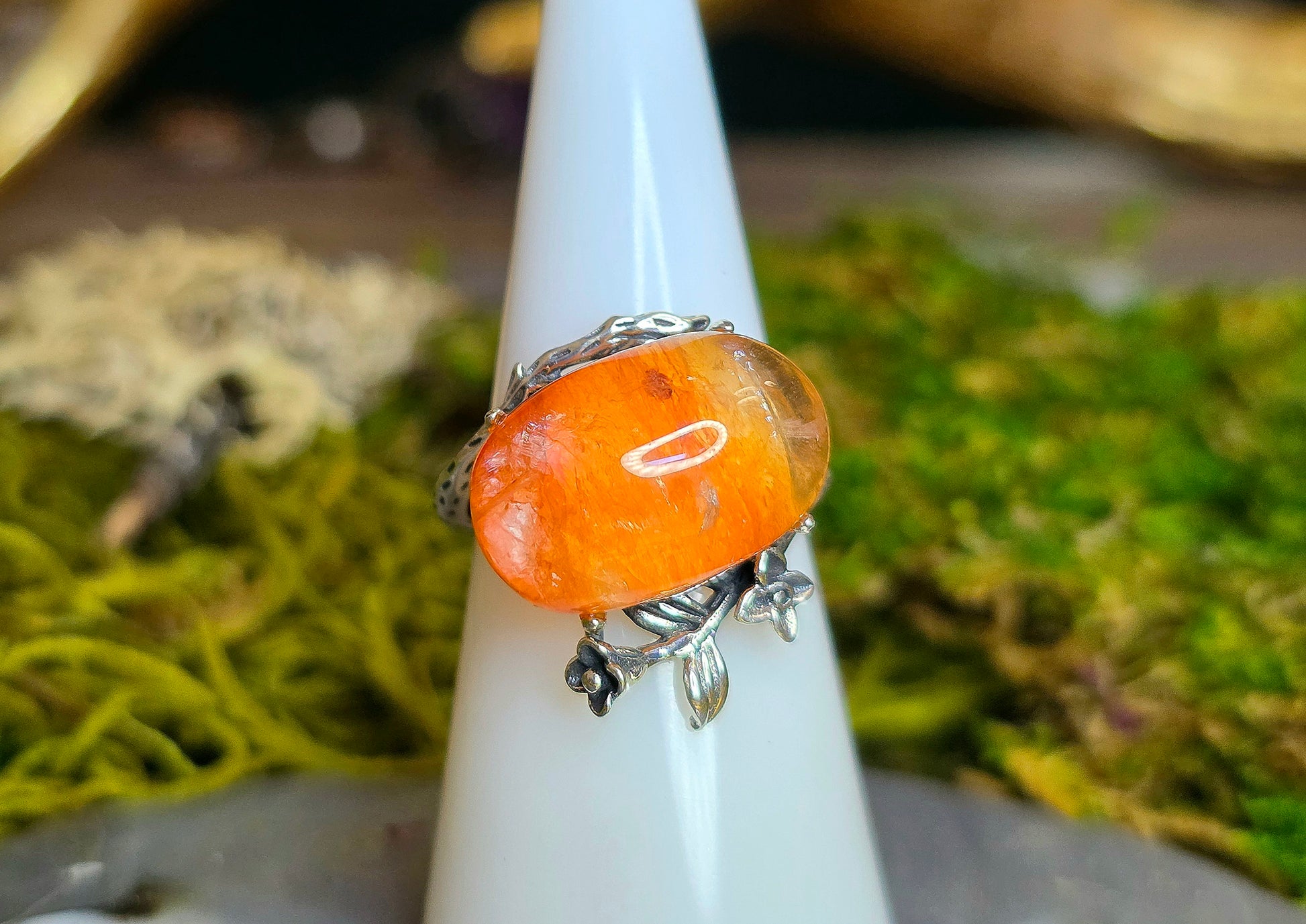 17 x 11mm flashy fire quartz cabochon set into an adjustable sterling silver ring with a floral design.
