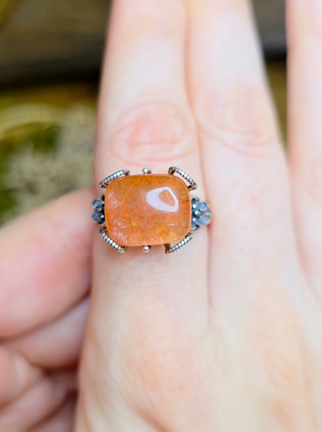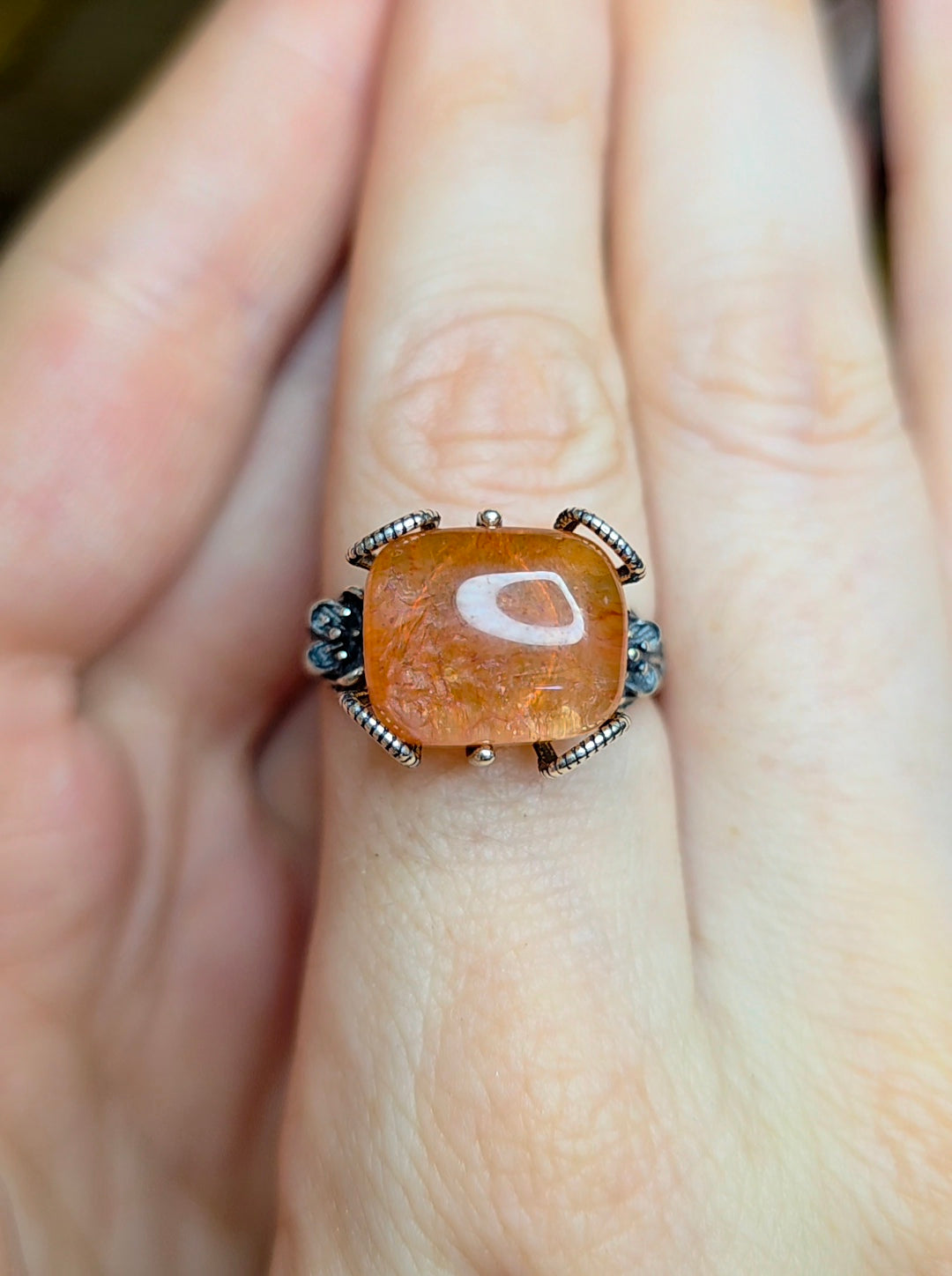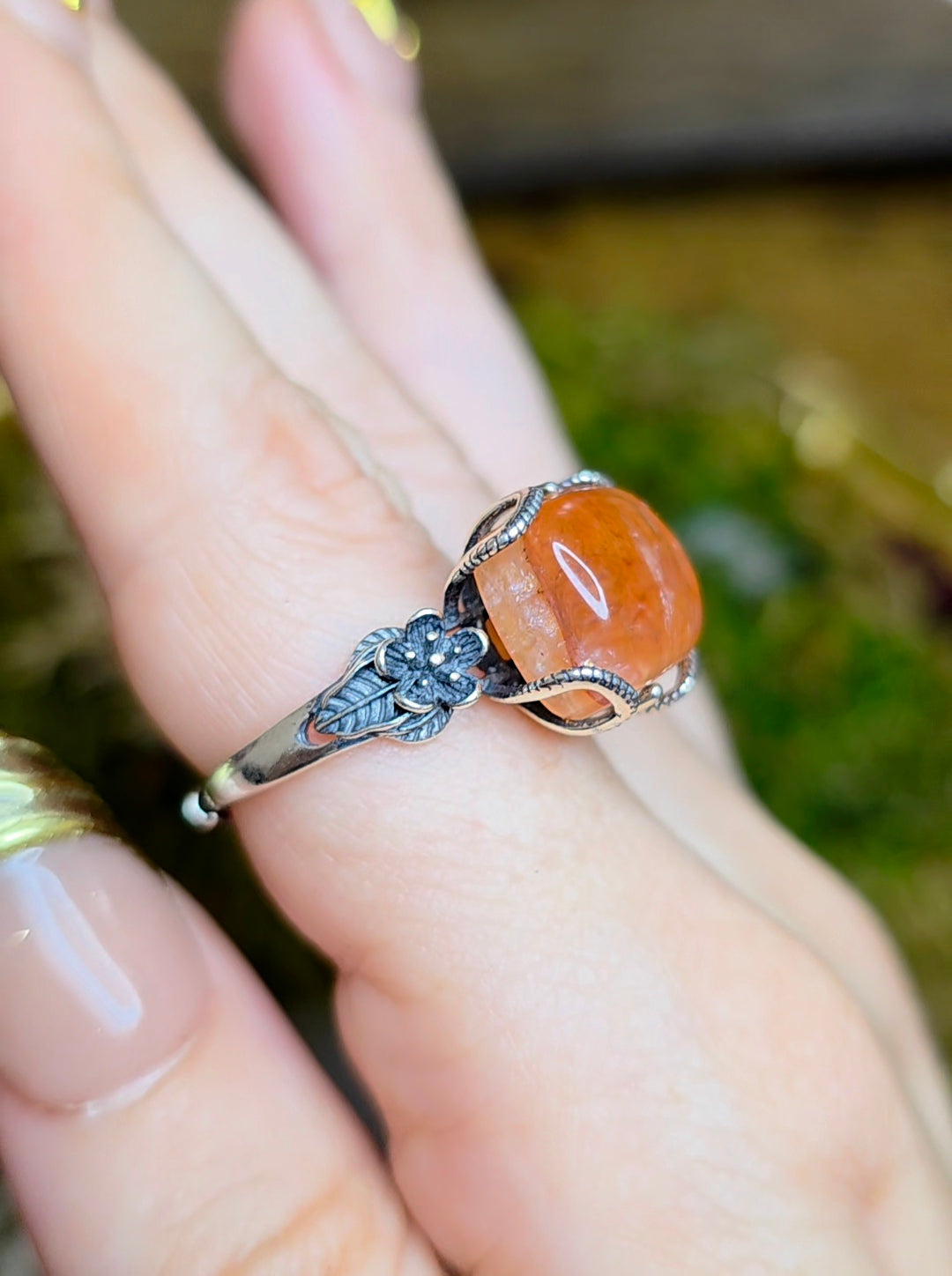 13 x 11mm flashy fire quartz cabochon set into an adjustable sterling silver ring with a floral design.