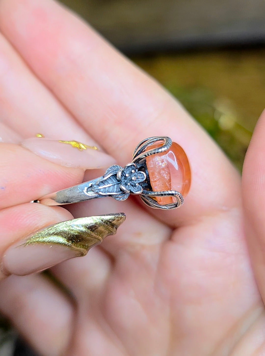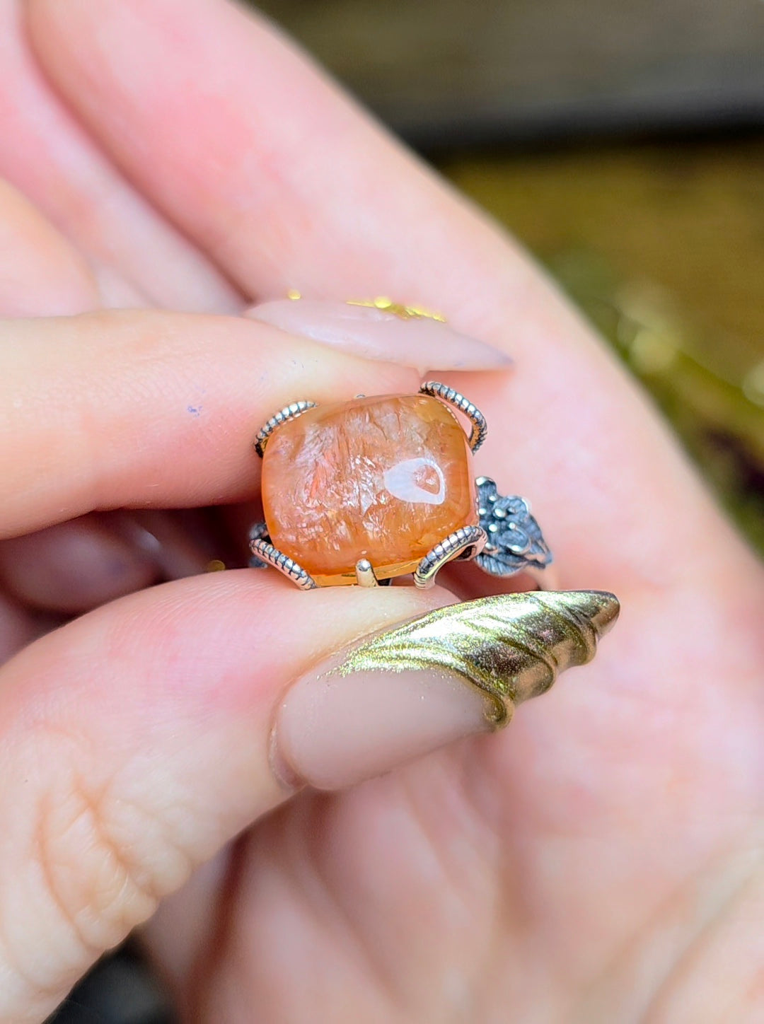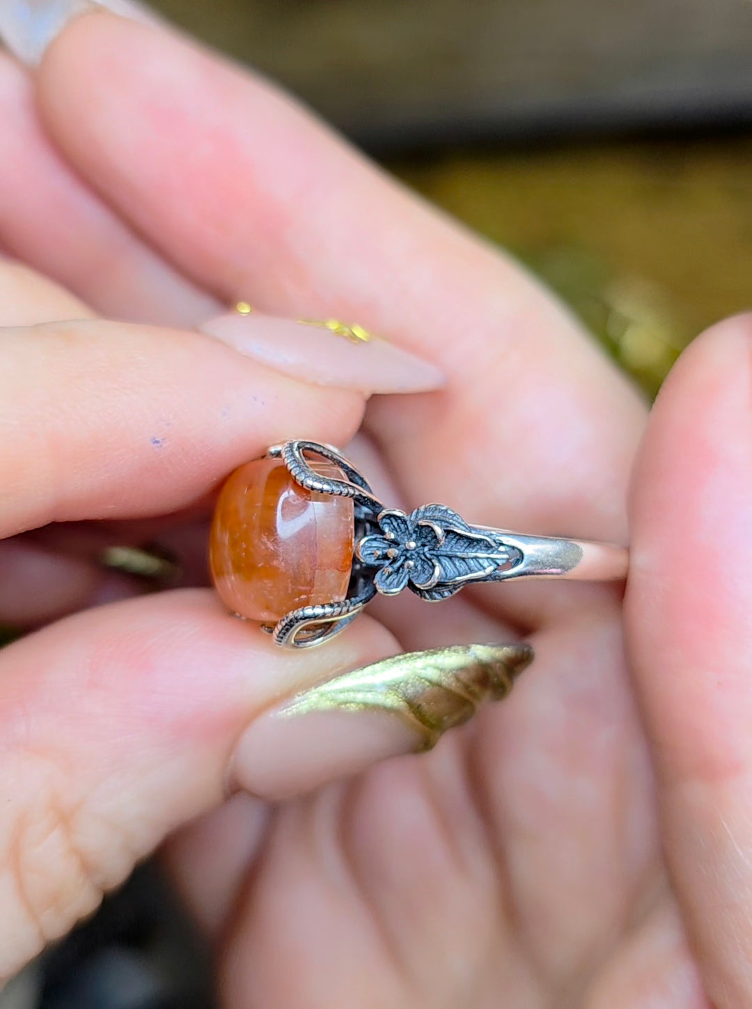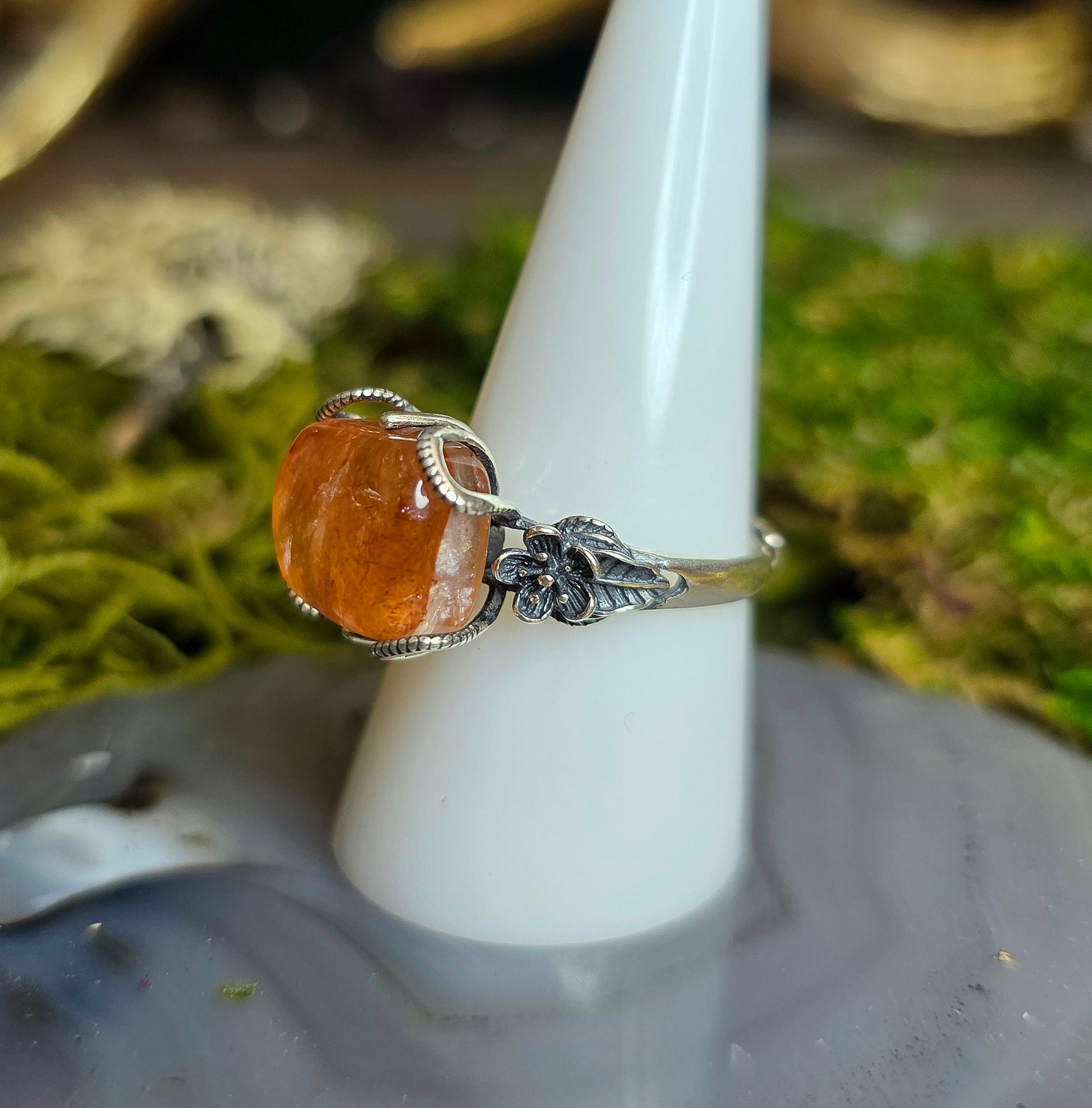 13 x 11mm flashy fire quartz cabochon set into an adjustable sterling silver ring with a floral design.