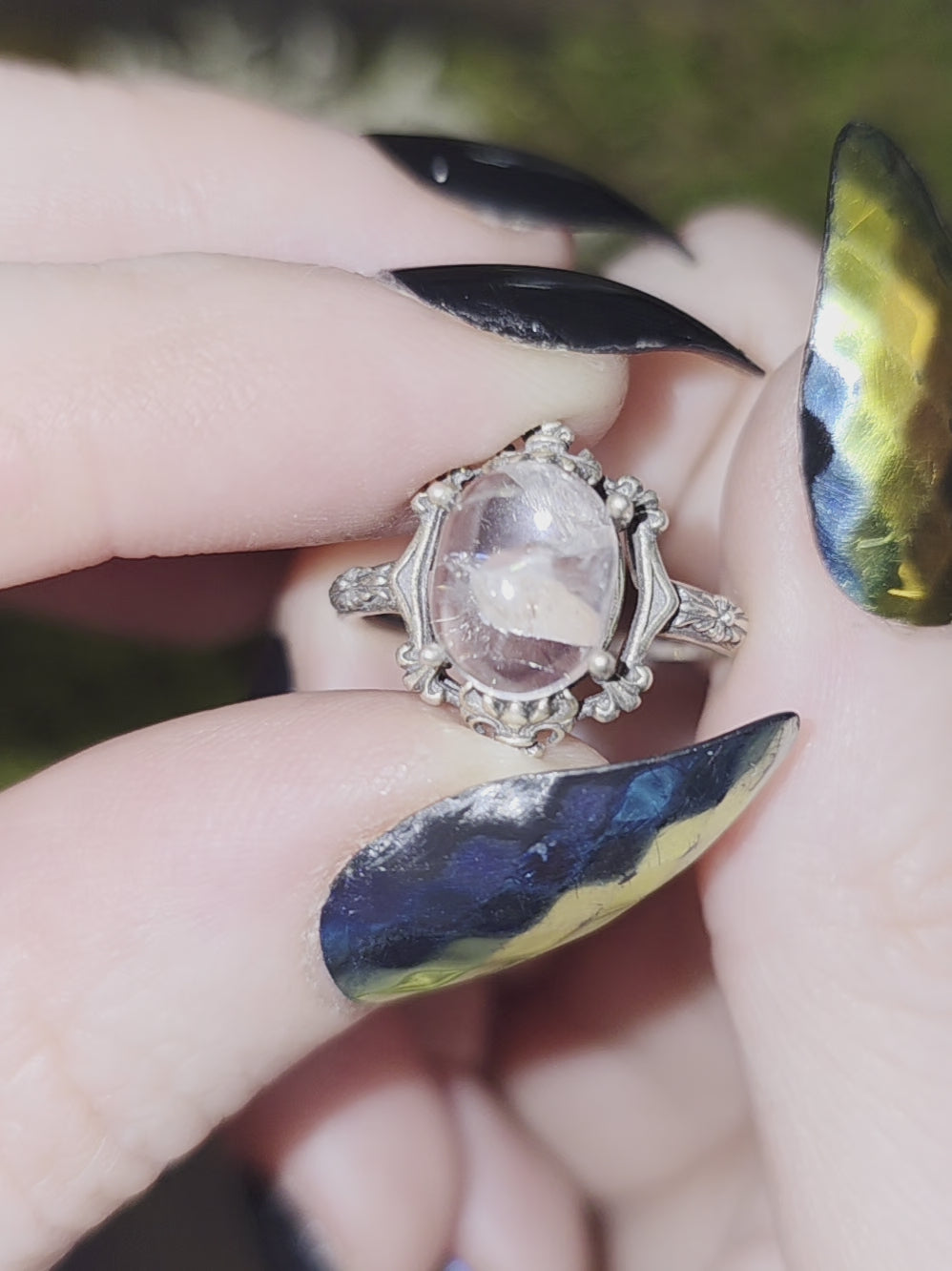 The stone is approximately 10mm and is set into an adjustable sterling silver ring.