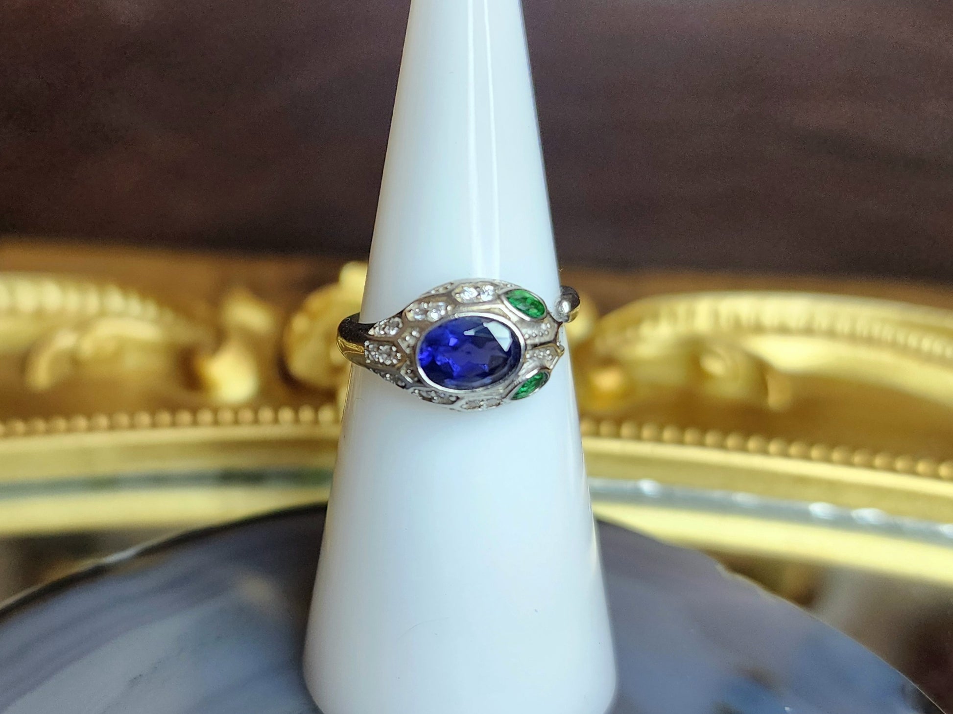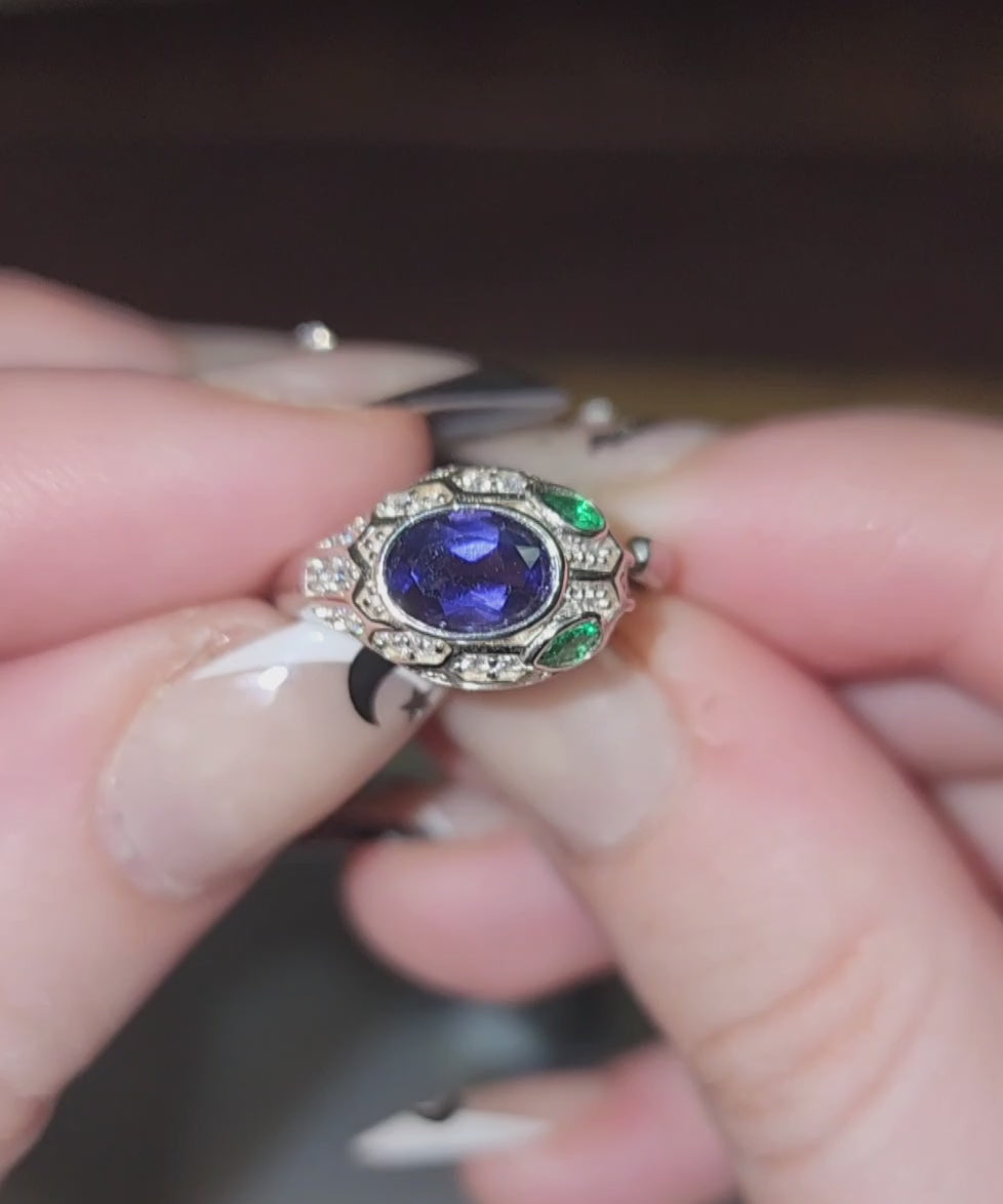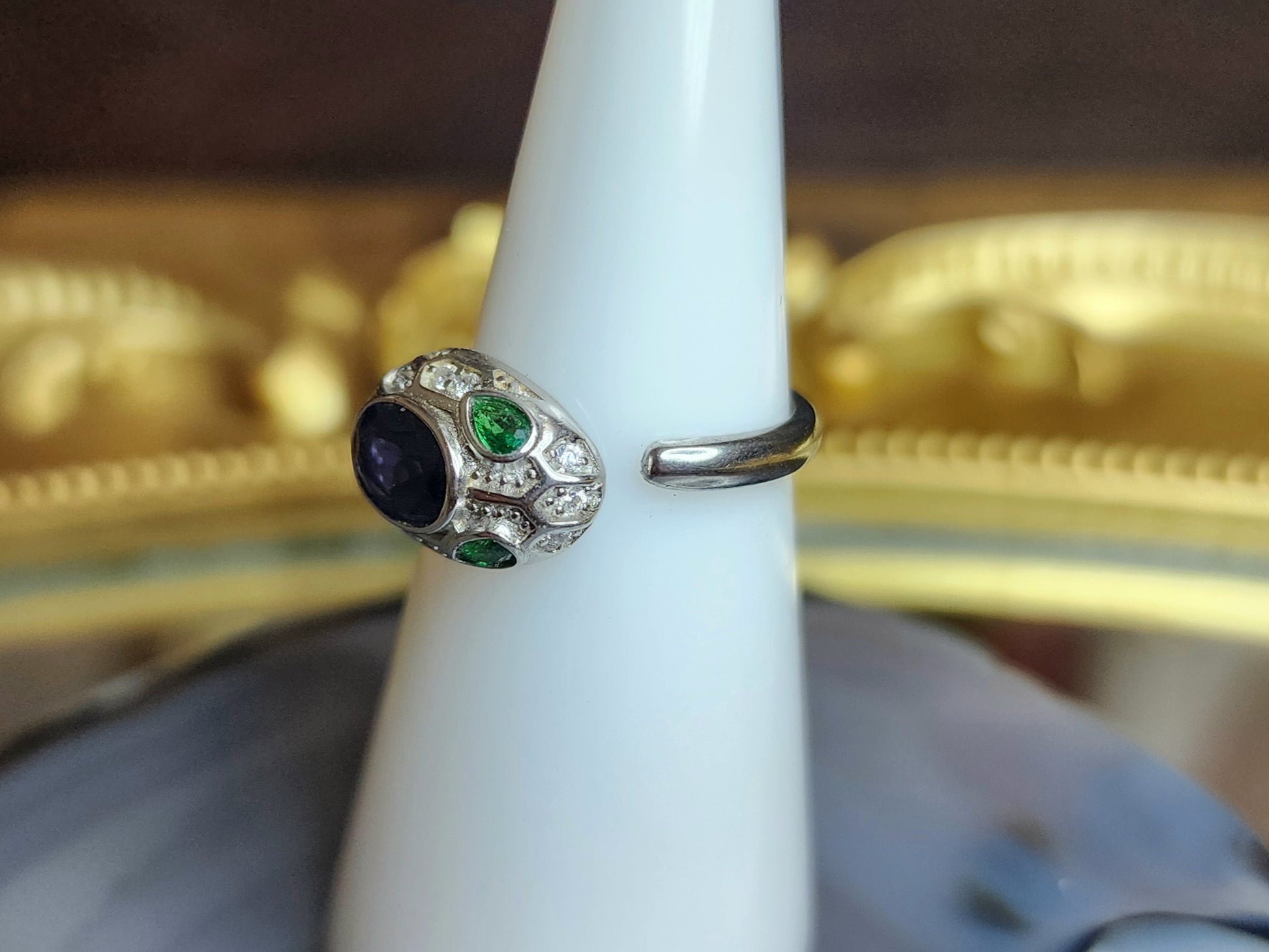 This piece features a deep purple iolite stone that has been faceted and is set into an adjustable sterling silver snake ring with diopside eyes and zircon scales.