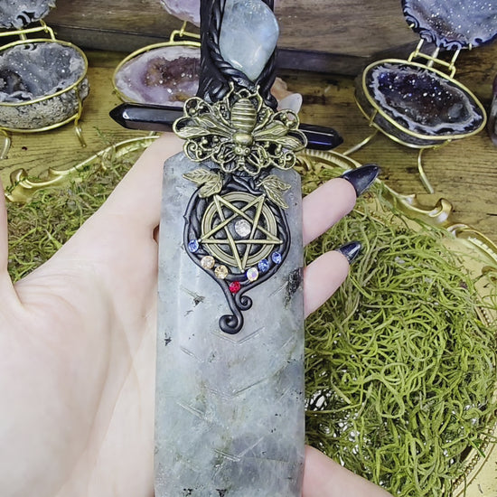 This Dagger is made from polymer clay, labradorite, obsidian, alloy charms, and mand made crystals.
