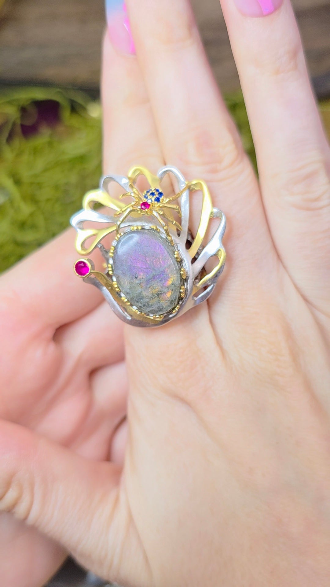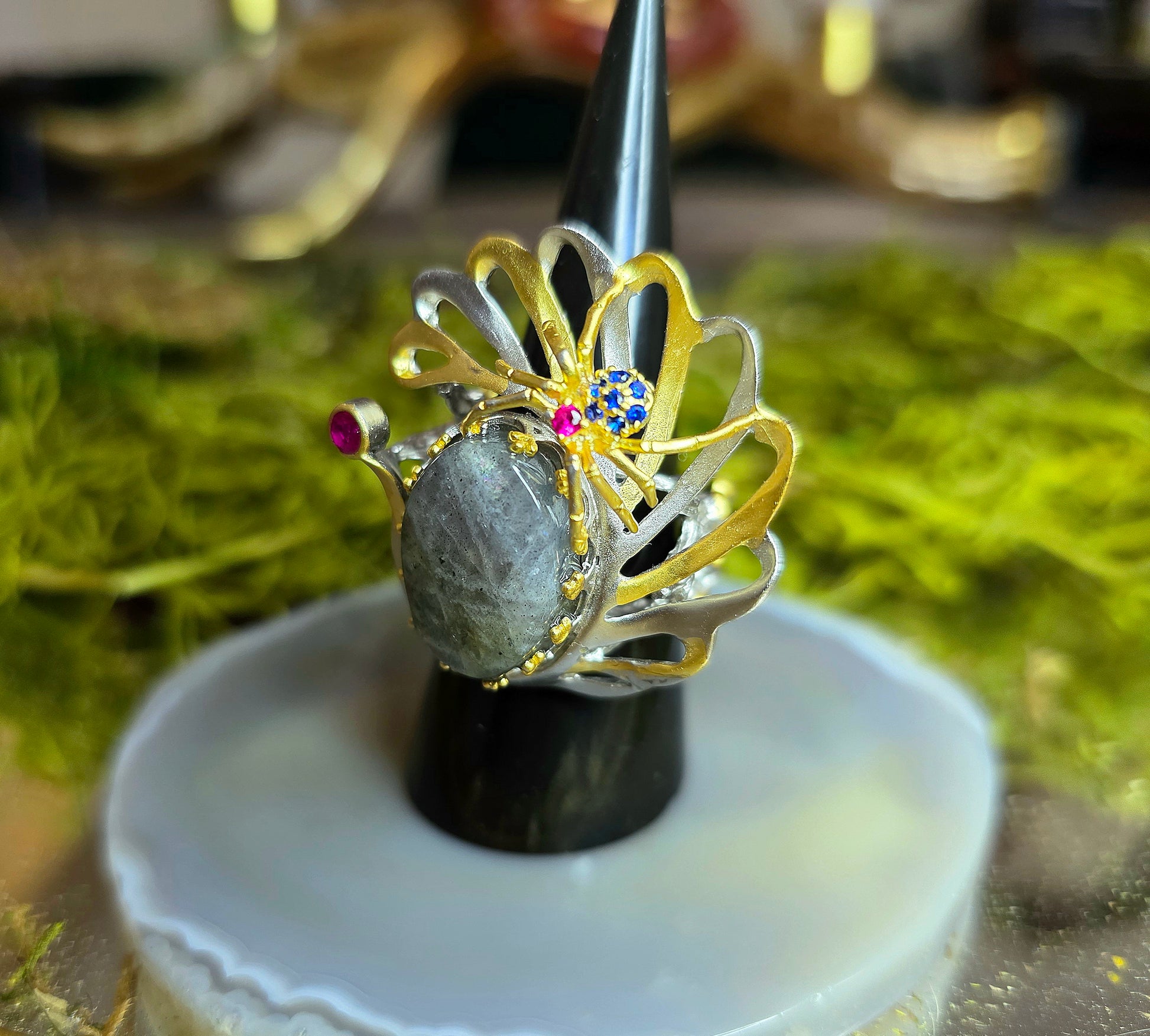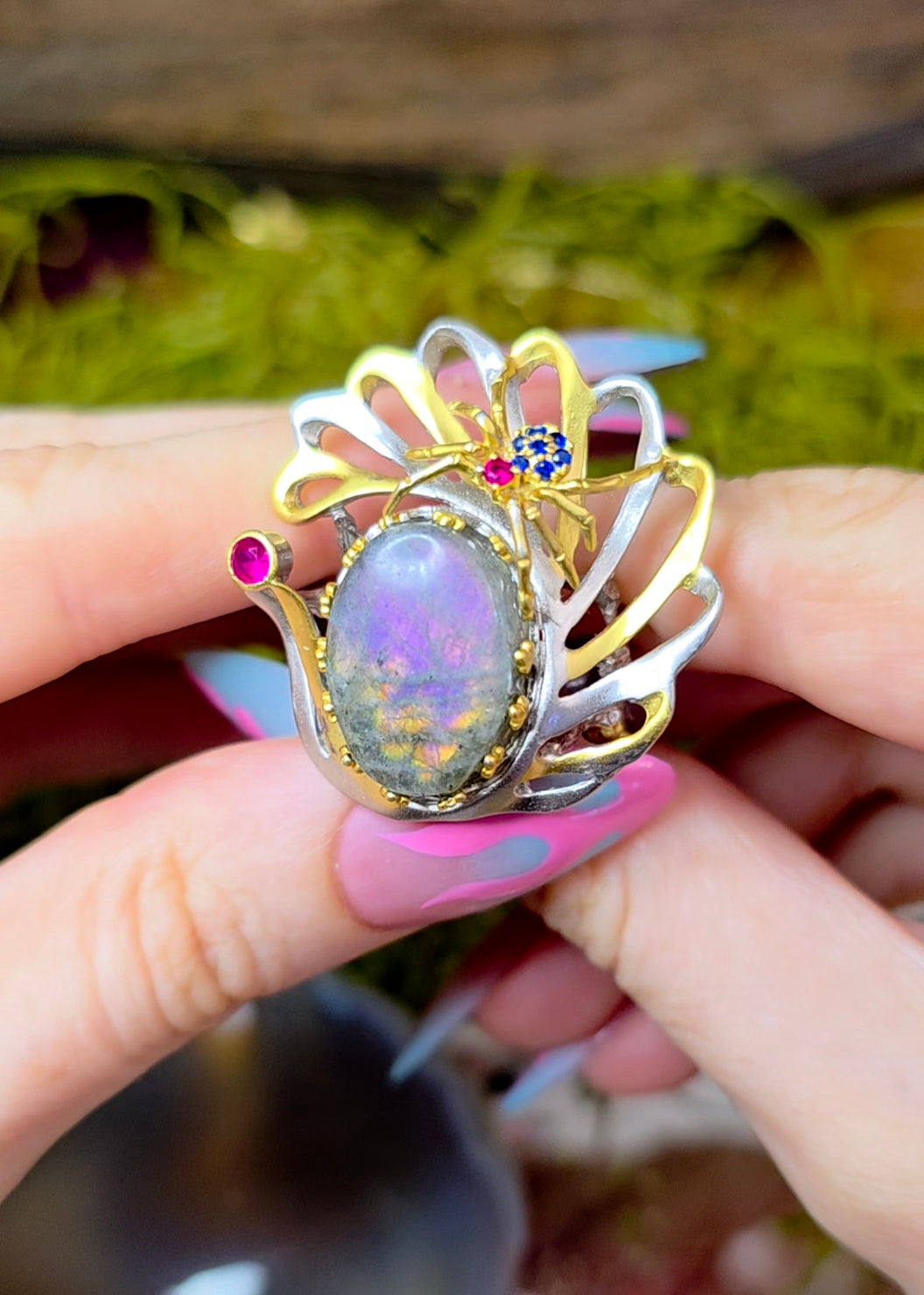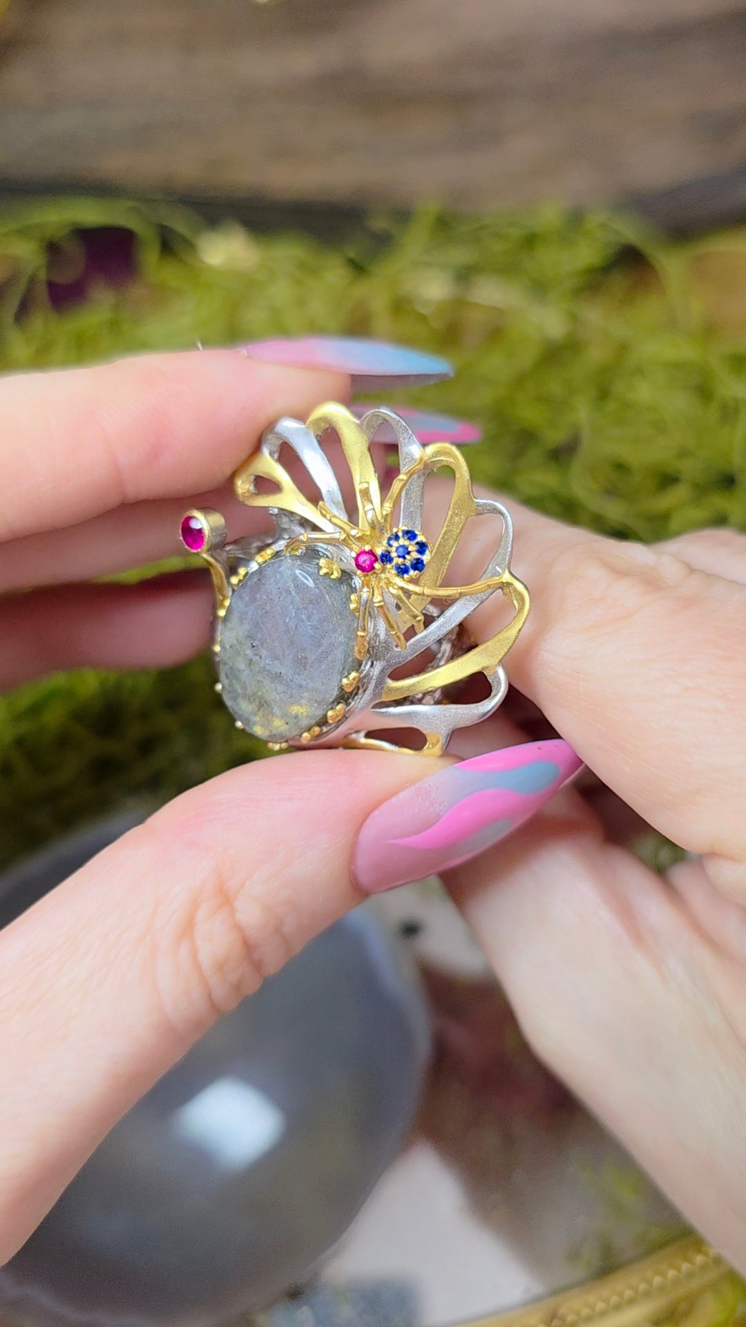 18x13mm flashy labradorite cabochon set into an adjustable sterling silver and gold plated ring with a spiderweb design. The ring is decorated with labradorite created sapphires and rubies.